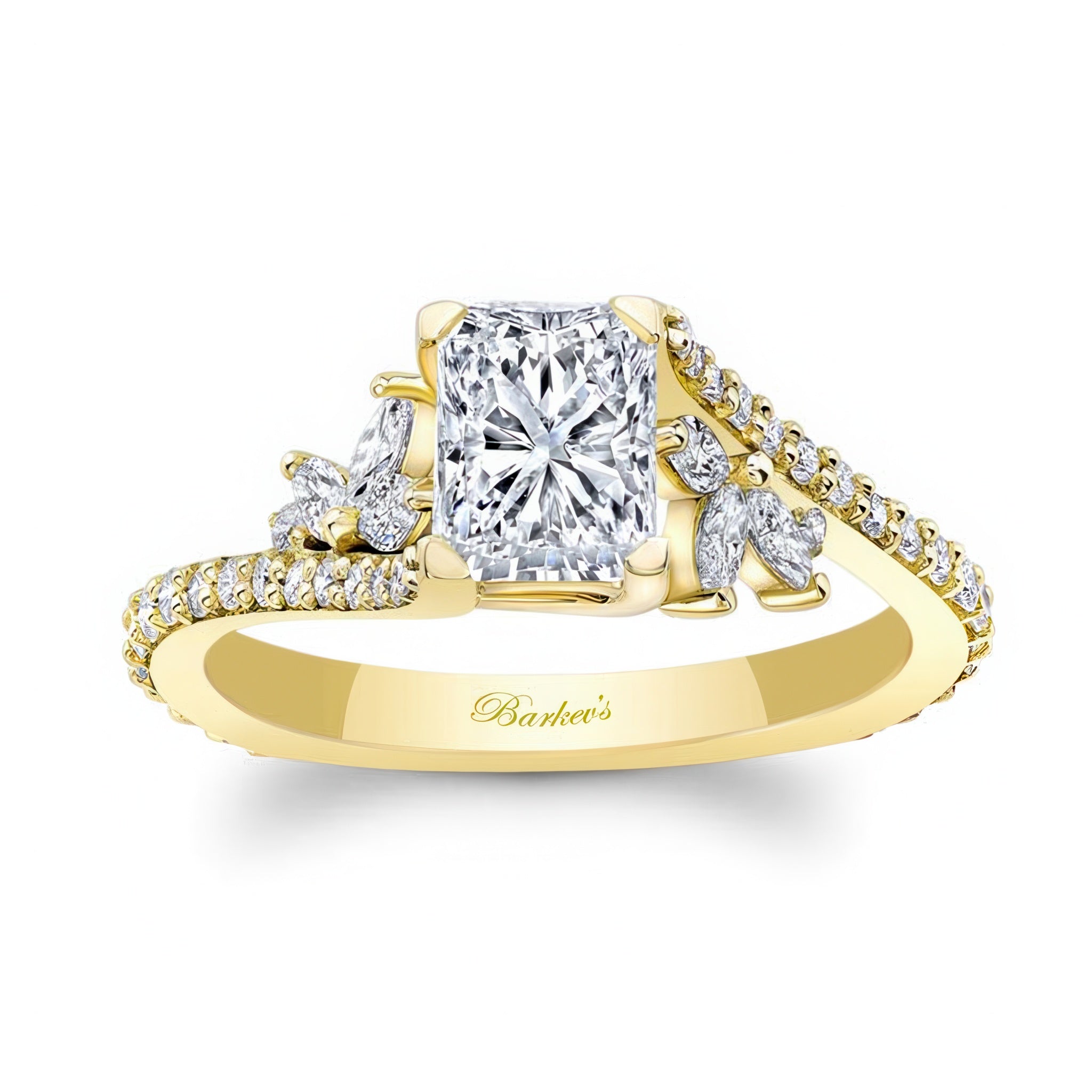 This elegant 1 carat radiant cut diamond ring features a prong set center stone graced on each side with a flare of marquise and round diamonds cascading down the dainty shank.