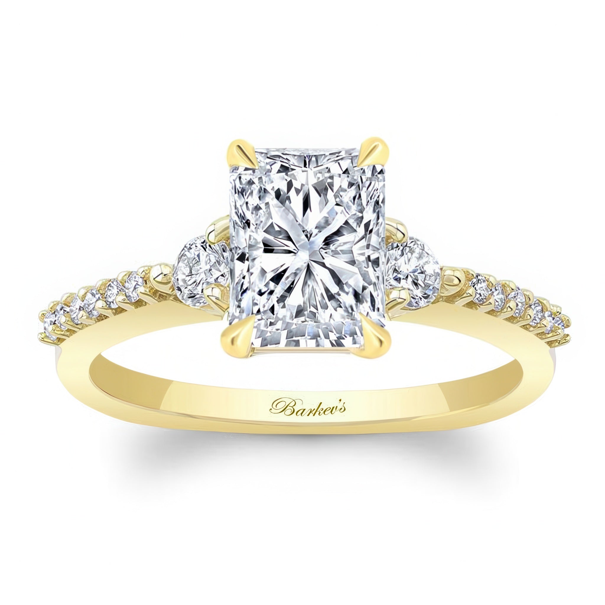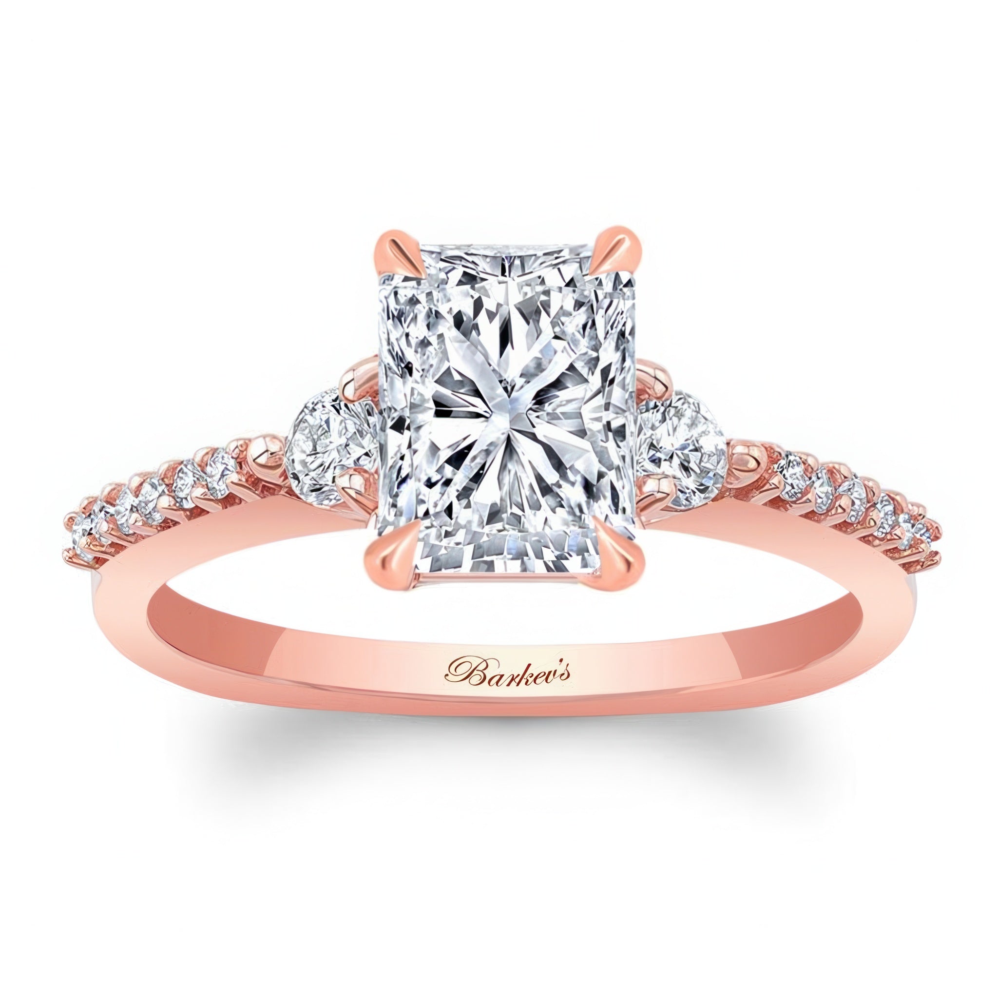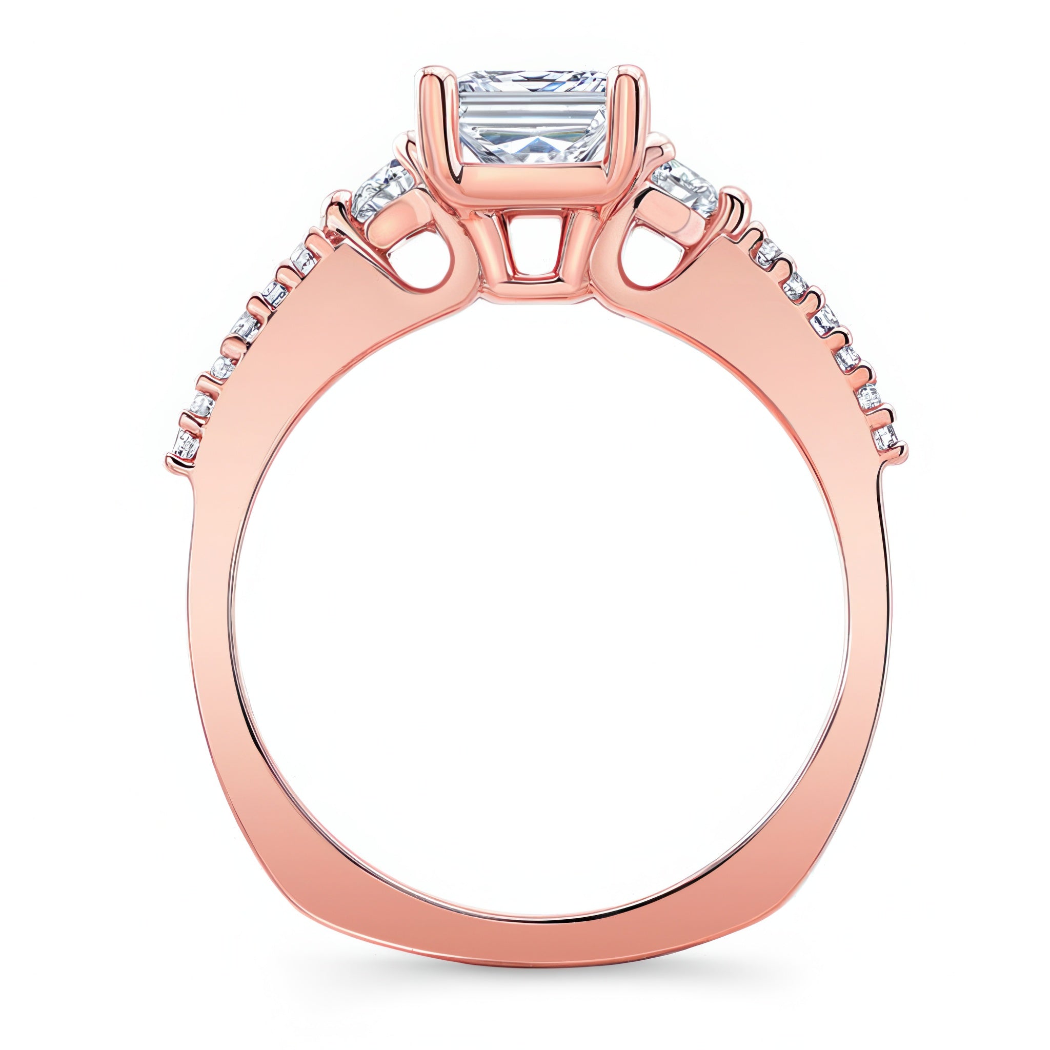 This 3 stone radiant cut engagement ring features a prong-set diamond center flanked by diamond accents on each side. The dainty shoulders are embellished with shared prong set diamonds for a finishing touch of sophistication.