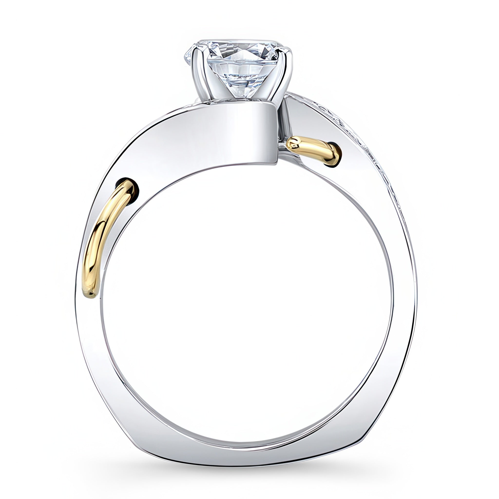 This channel ring features a prong set round center with a wire trim curving into the shank and channel set diamond melees on the shoulders.