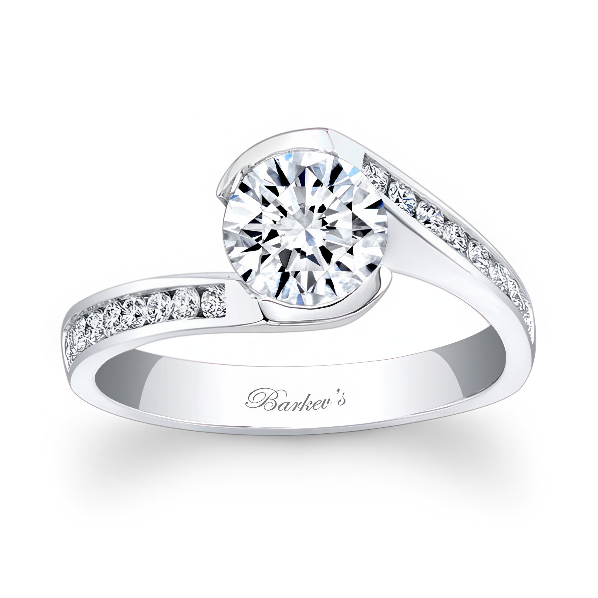 This channel set diamond engagement ring has a round center and a sprinkle of channel set diamonds gracing the shoulders for an elegant look.