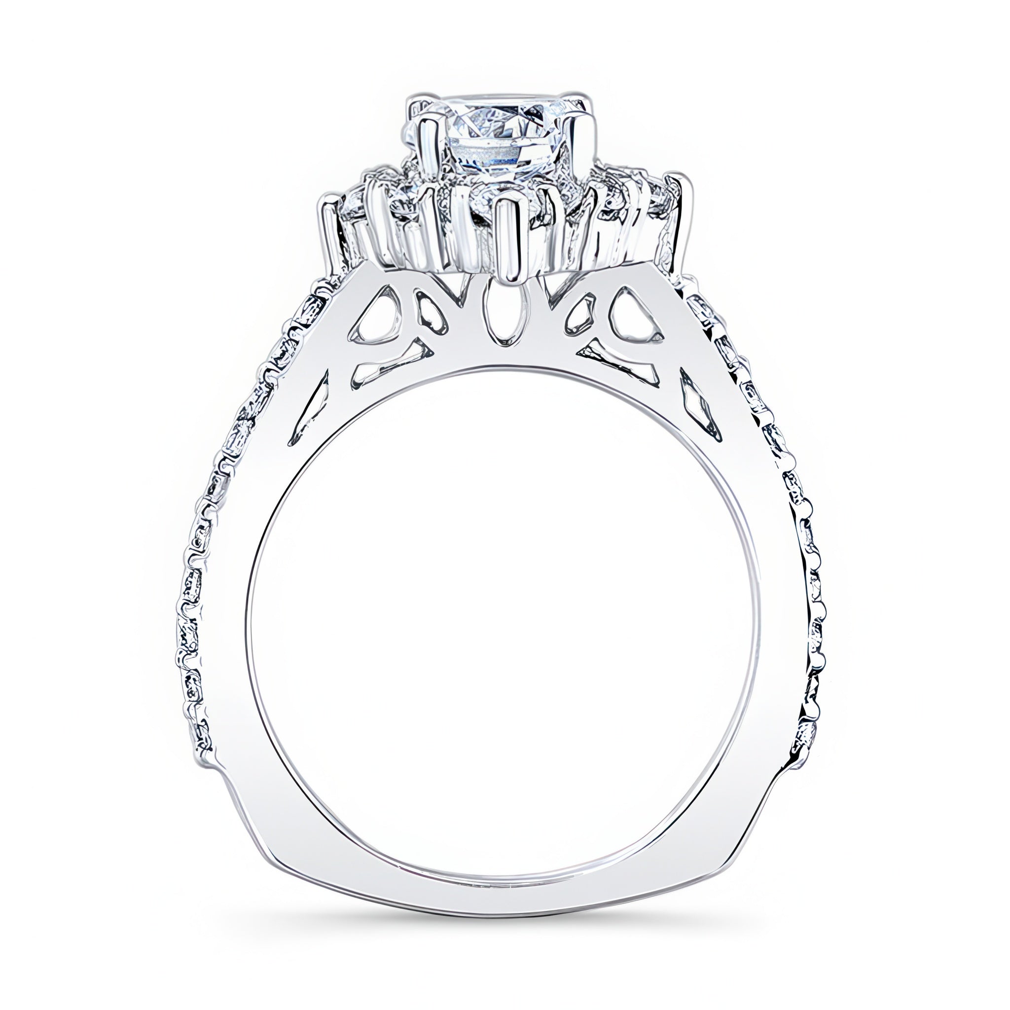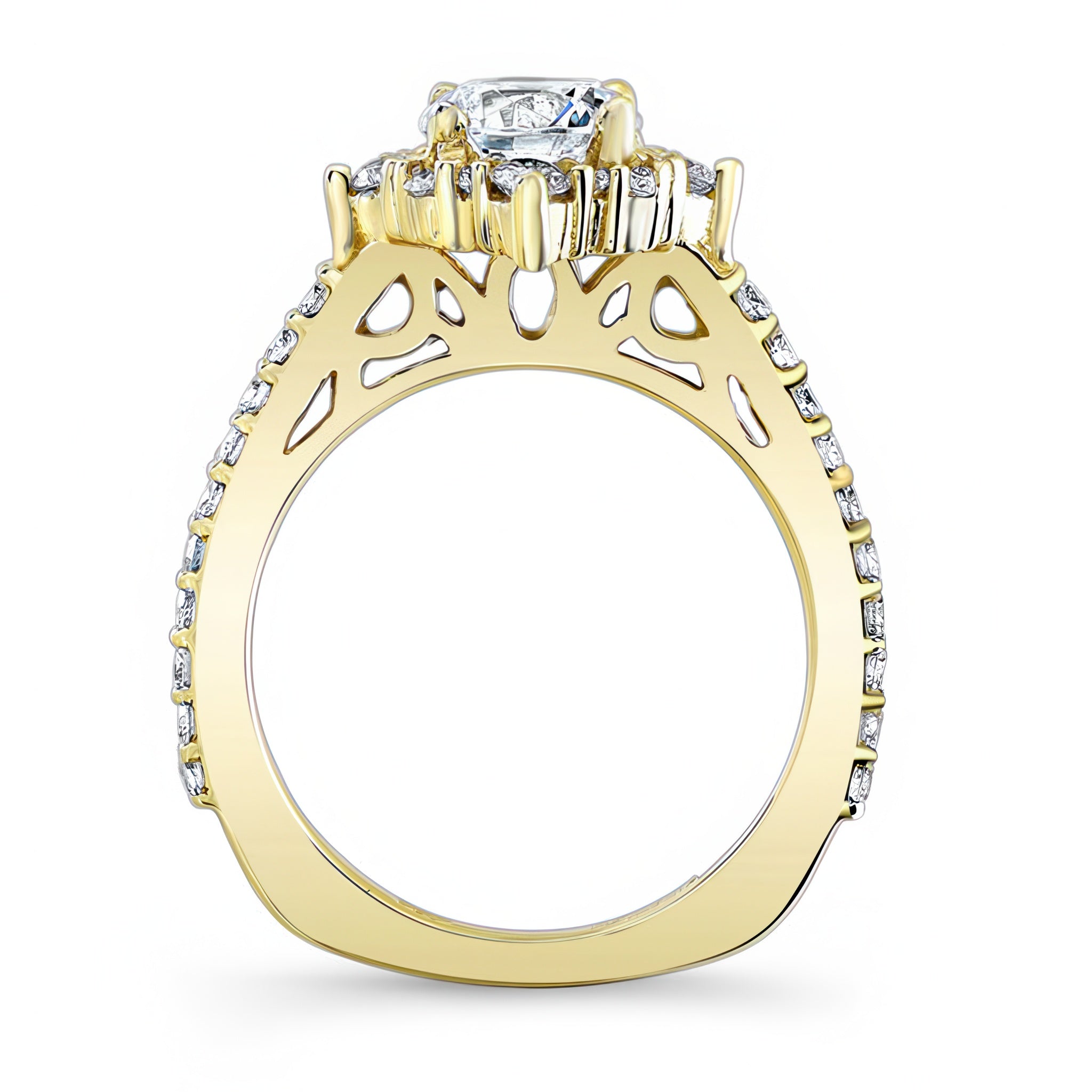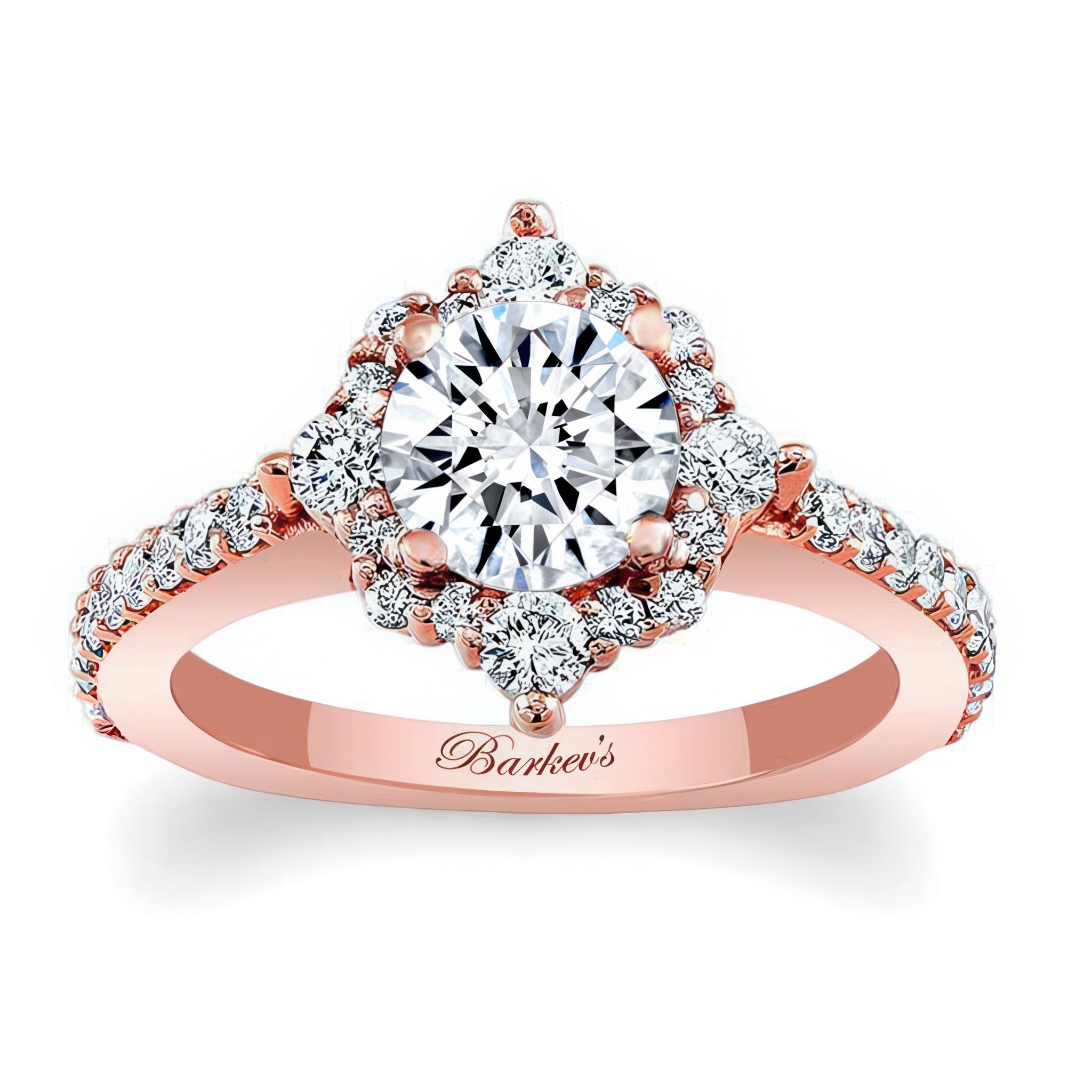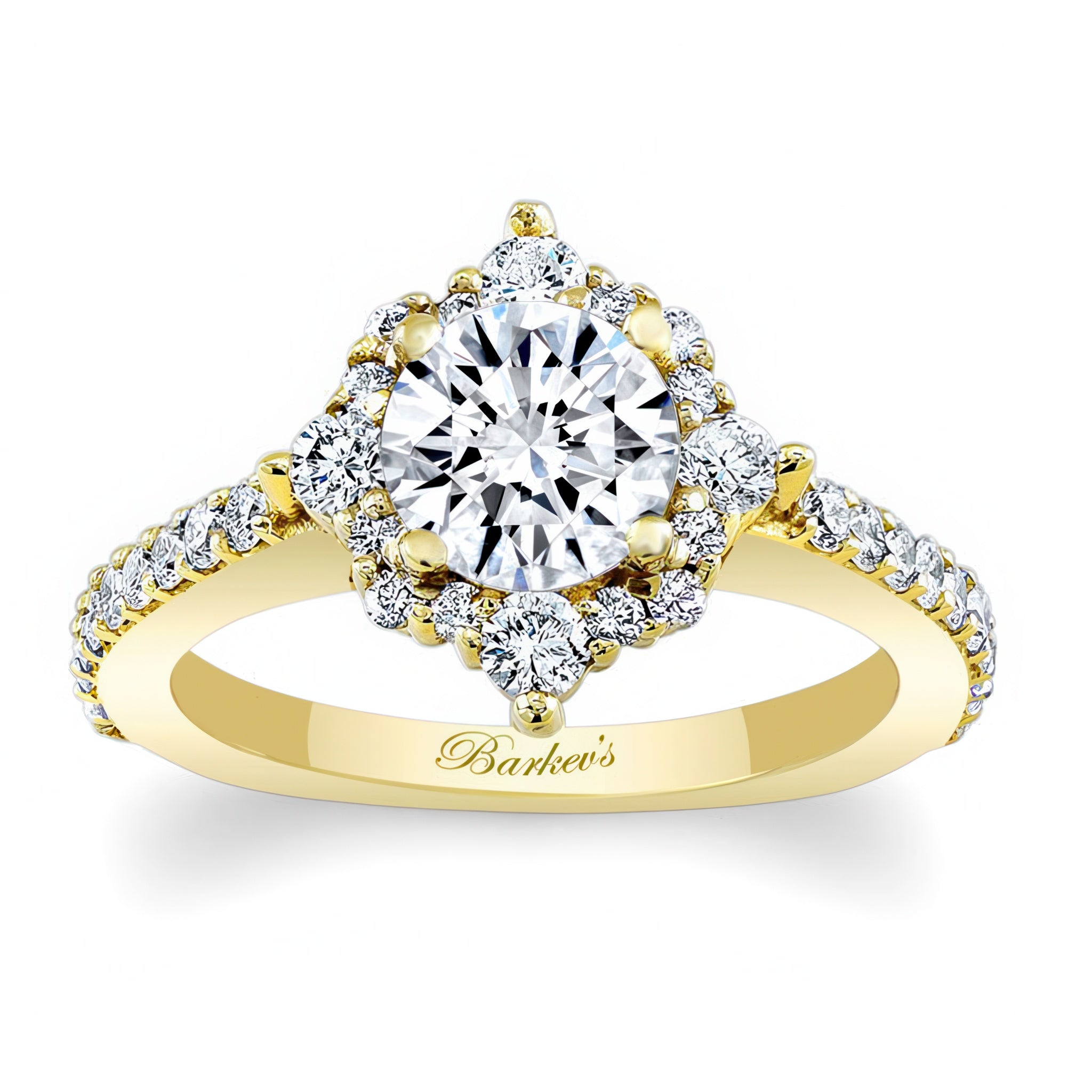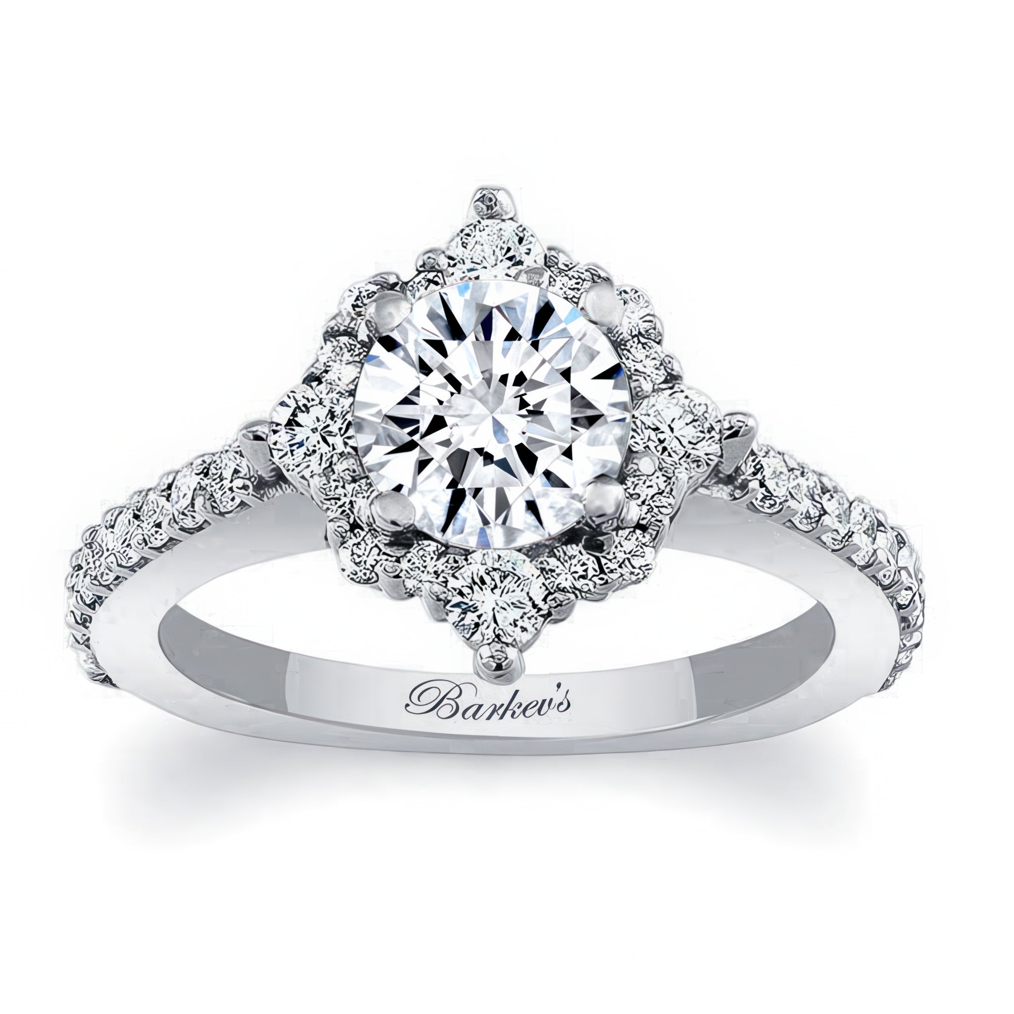 This classic halo diamond engagement ring features a prong set round center artfully embellished with diamonds for a twist on the traditional halo ring. The narrow shank is set with shared prong set diamonds for an elegant finish.