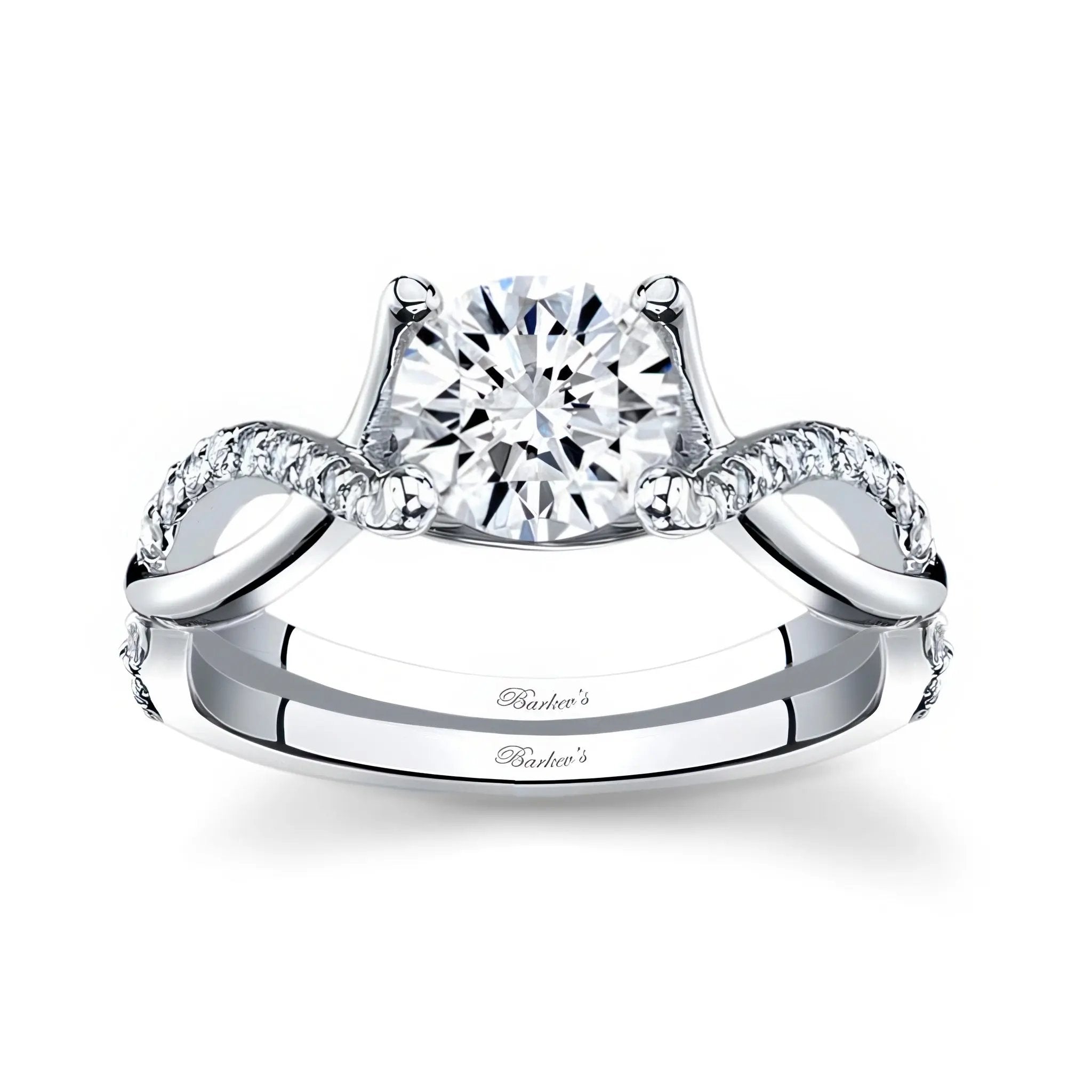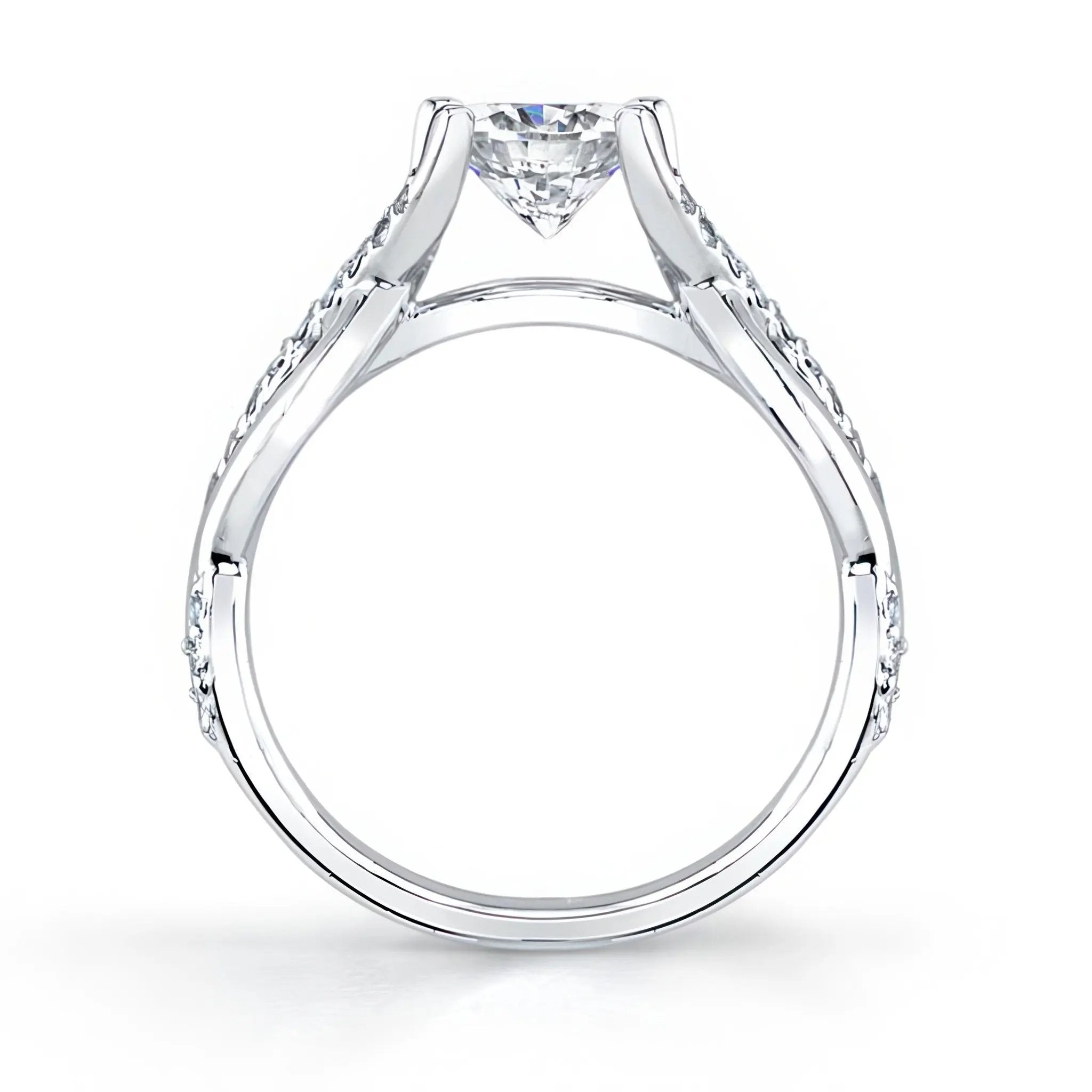 This criss cross split shank ring features a prong set round center with a criss crossing split shank adorned with shared prong set diamonds.