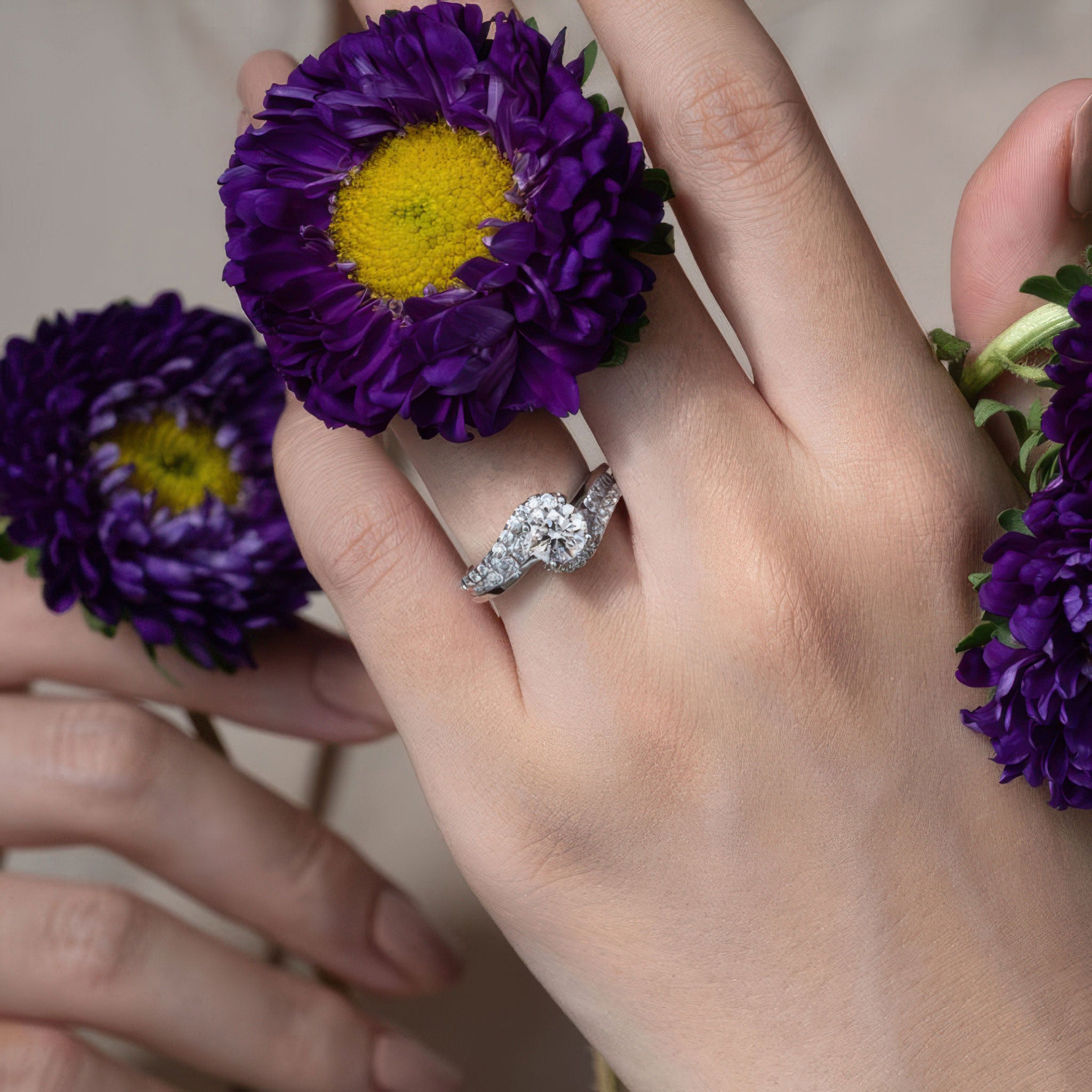 This dazzling curved engagement ring features a prong set round center with shoulders splitting and twisting with pave set diamonds, while channel set diamonds fill the gap for a dramatic touch of bling.