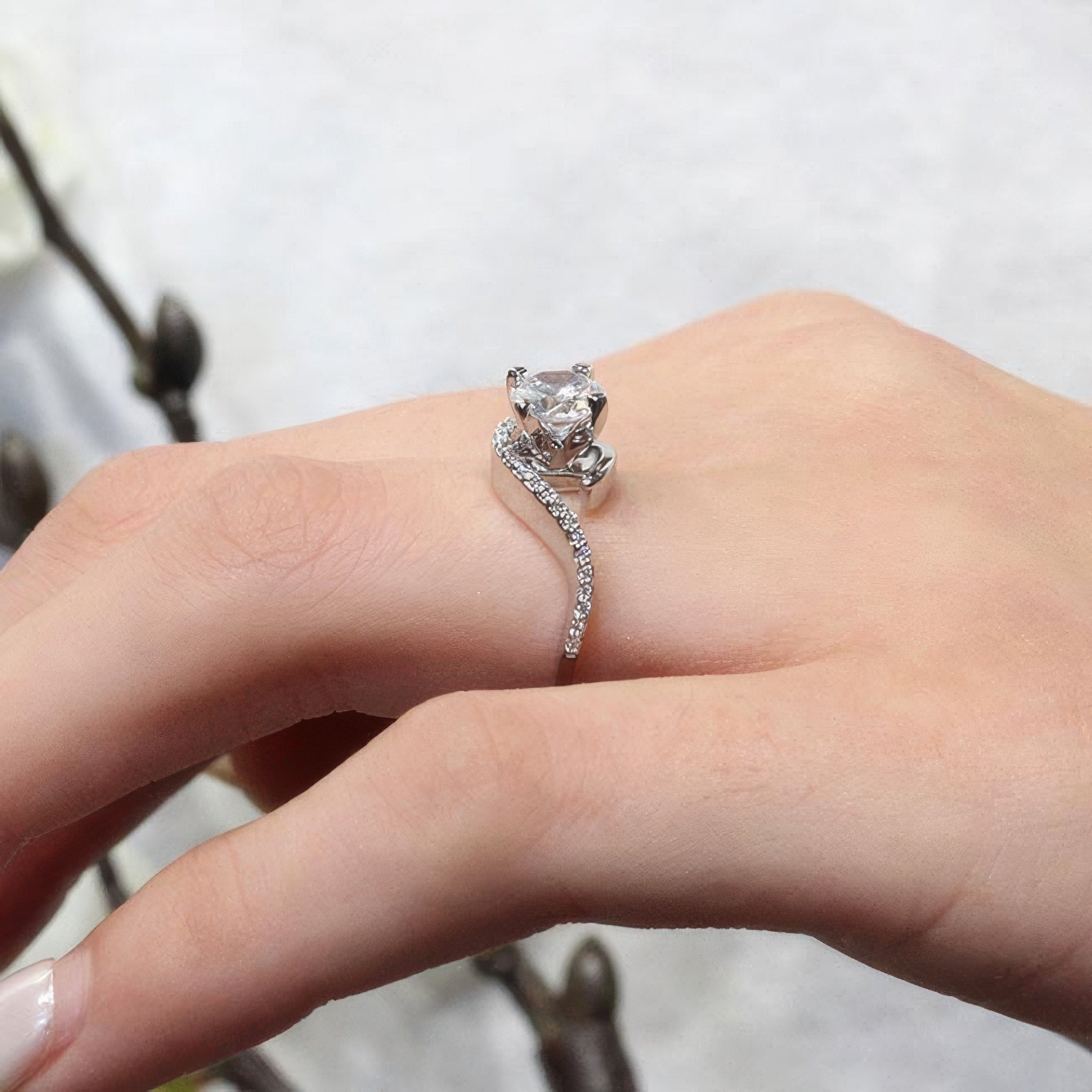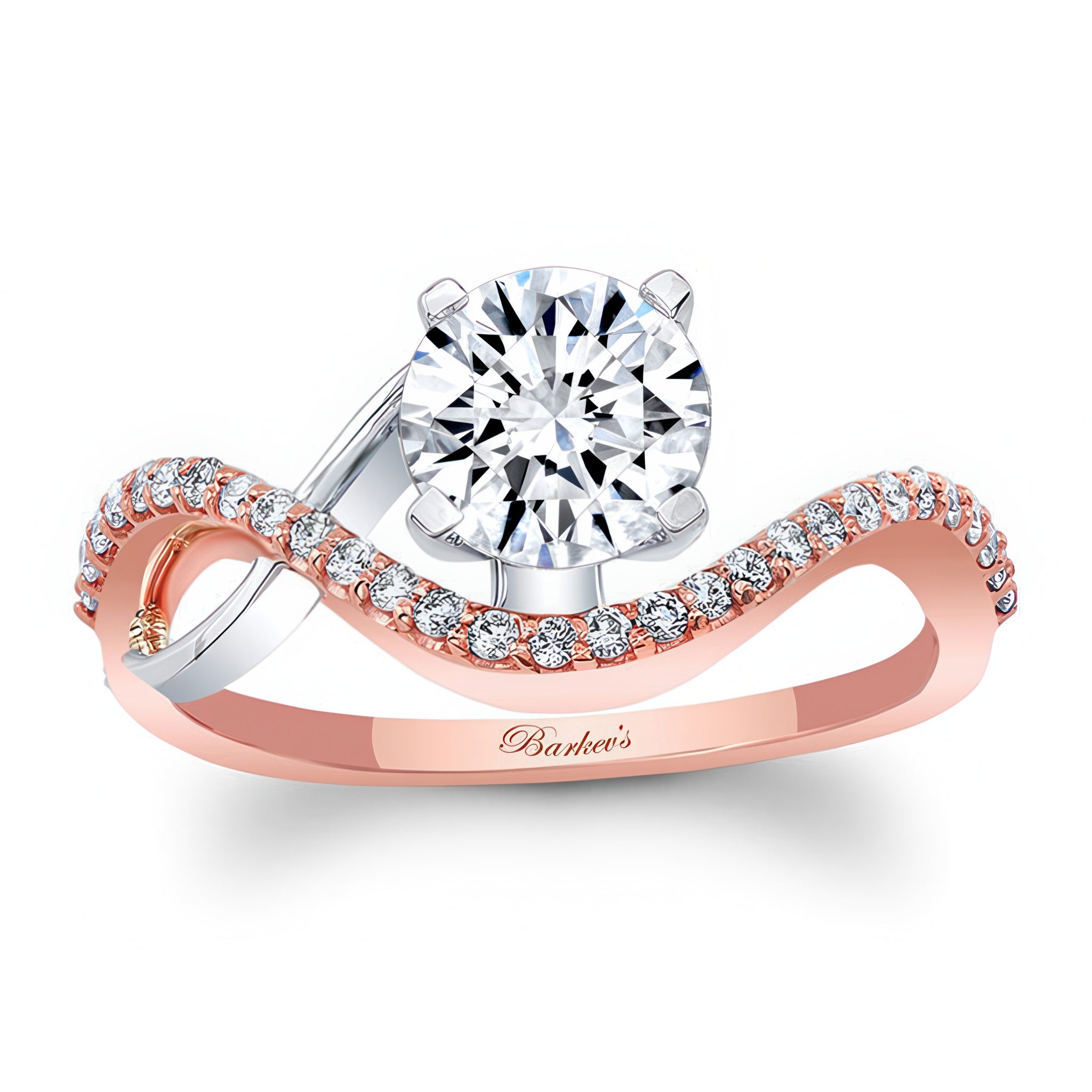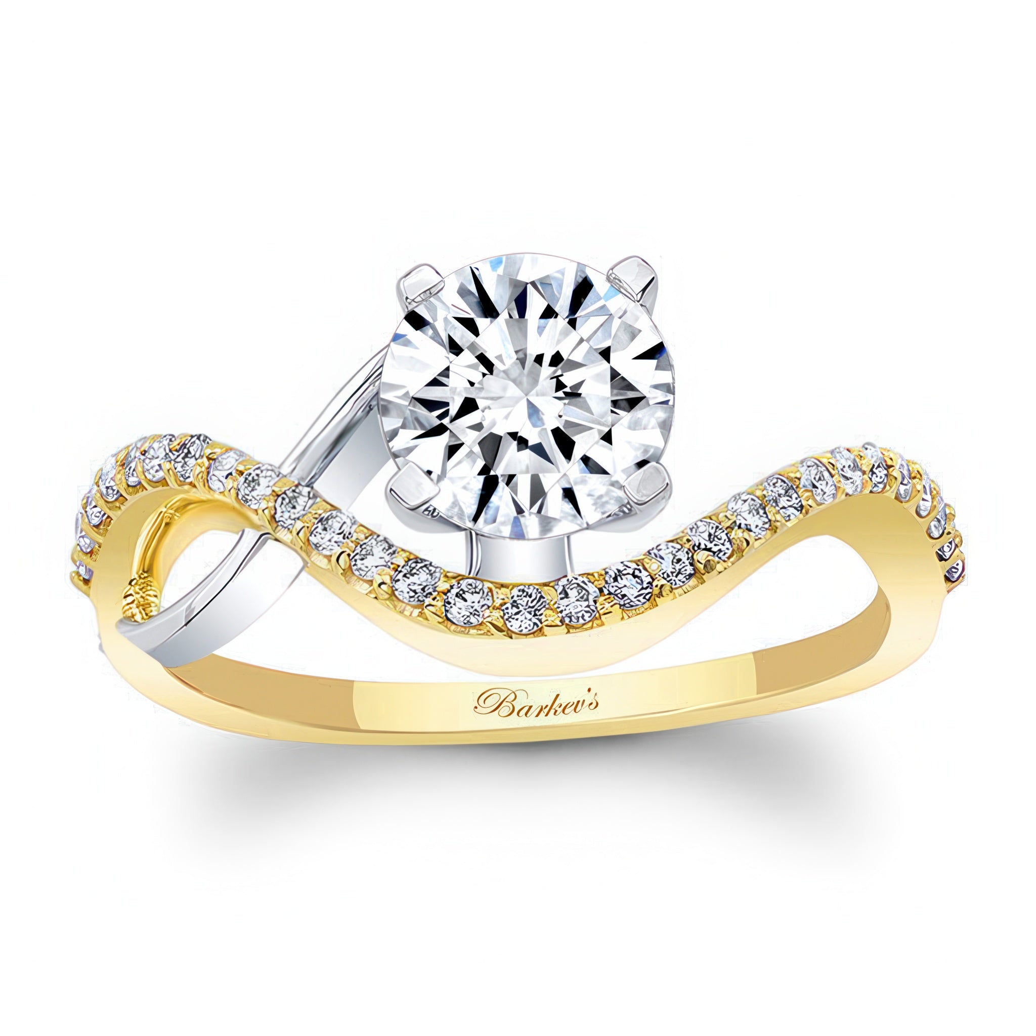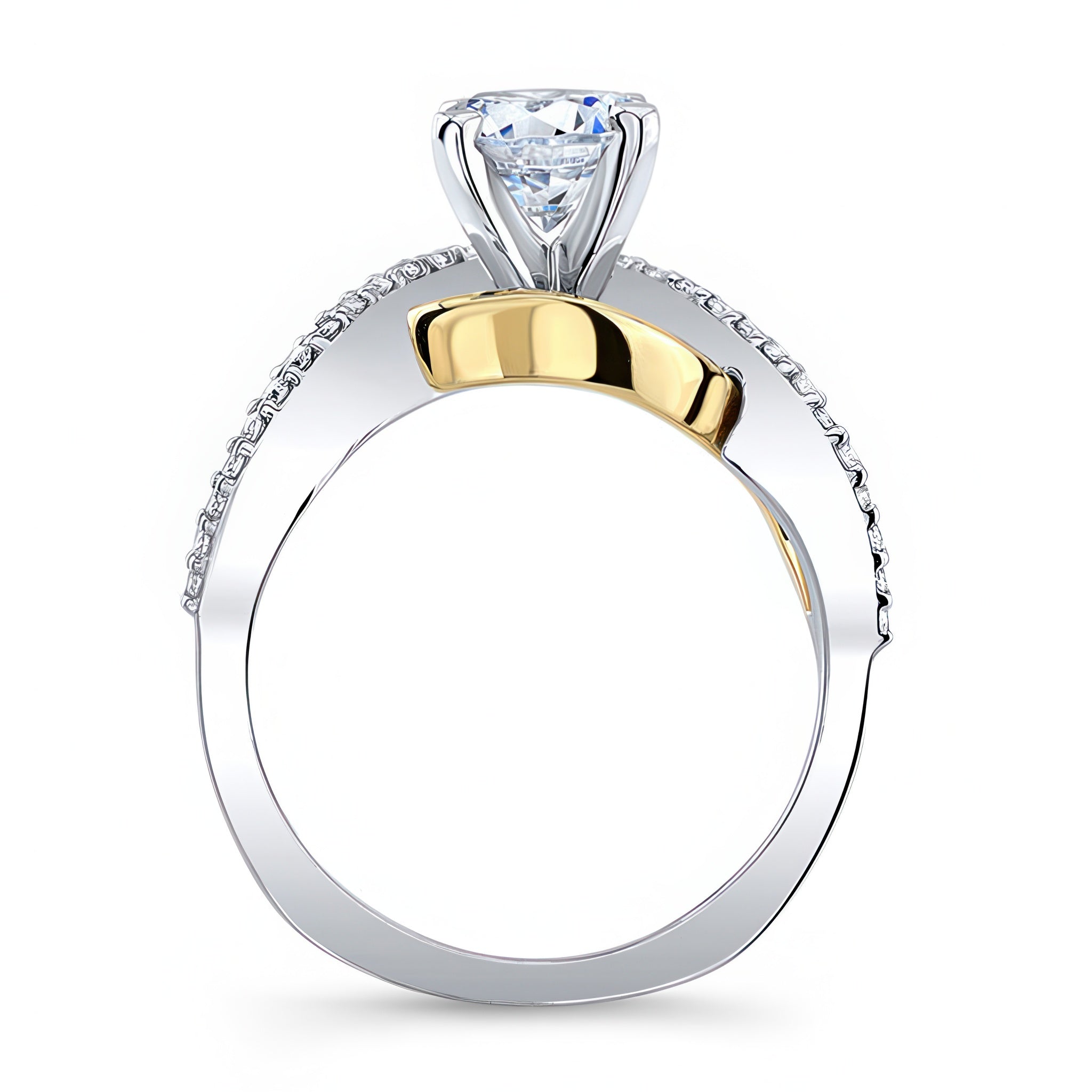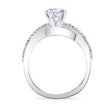 An unusual curved wedding ring featuring a prong set round center with pave set diamonds on the shank and a ridge that springs out on one side and cradles the center for a dramatic flare.