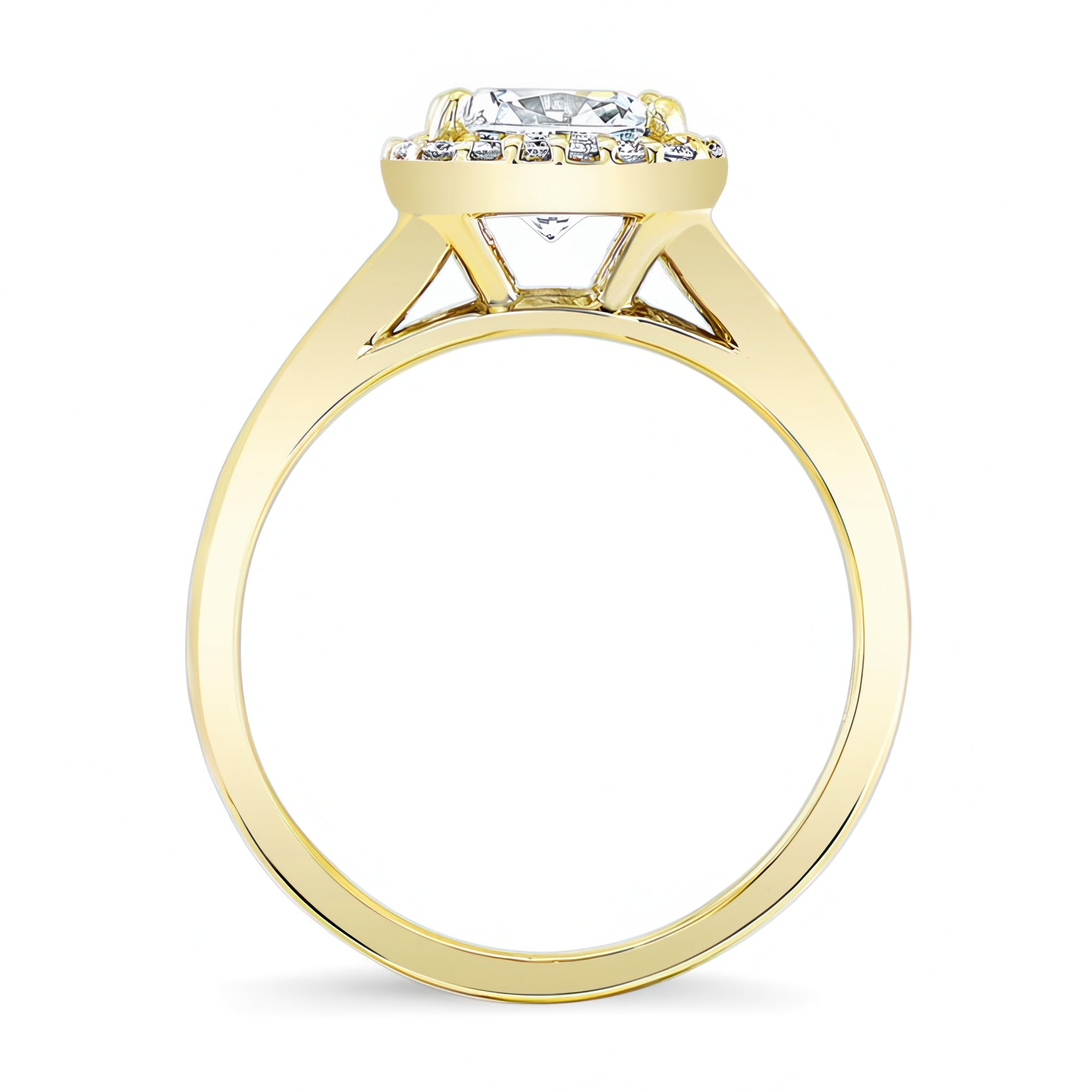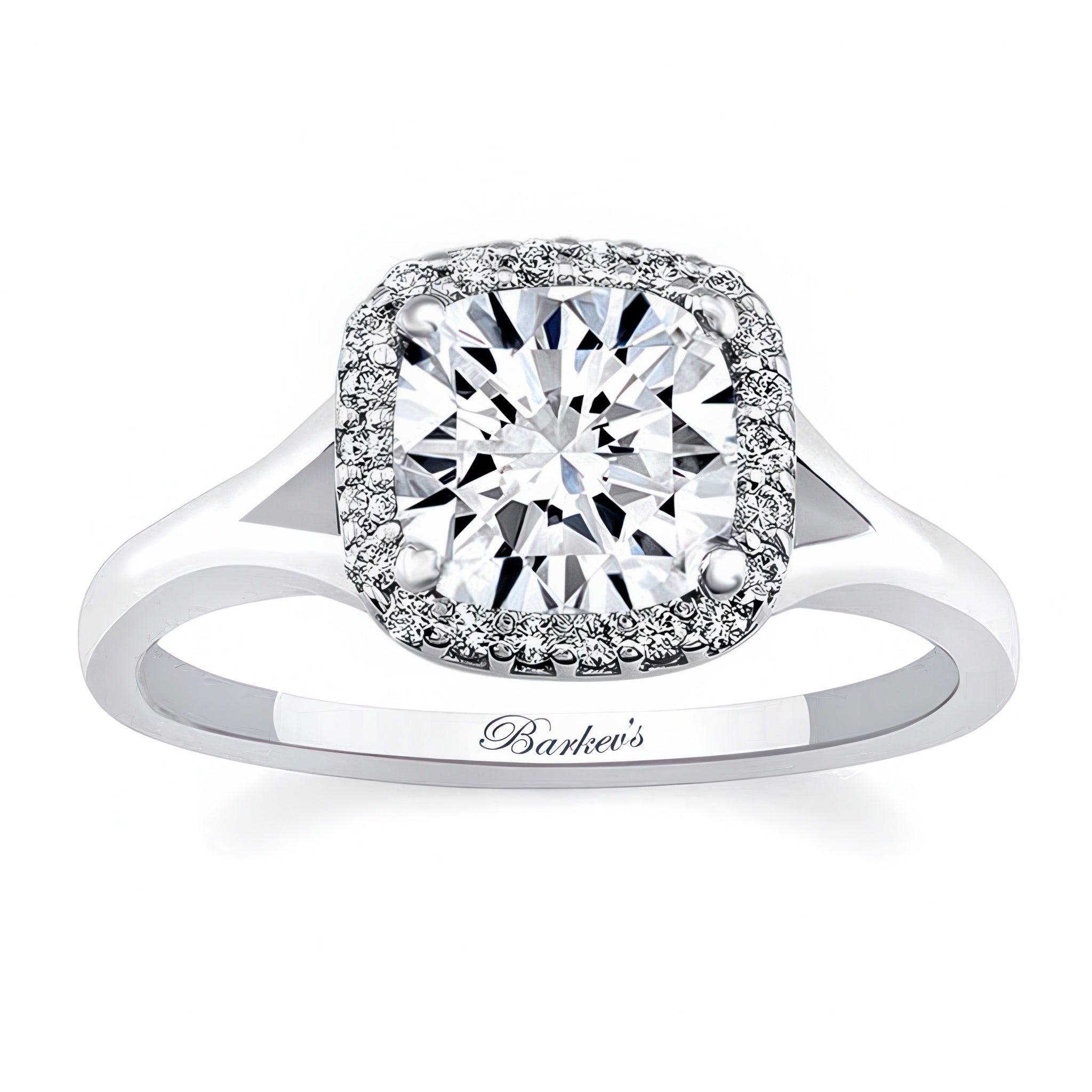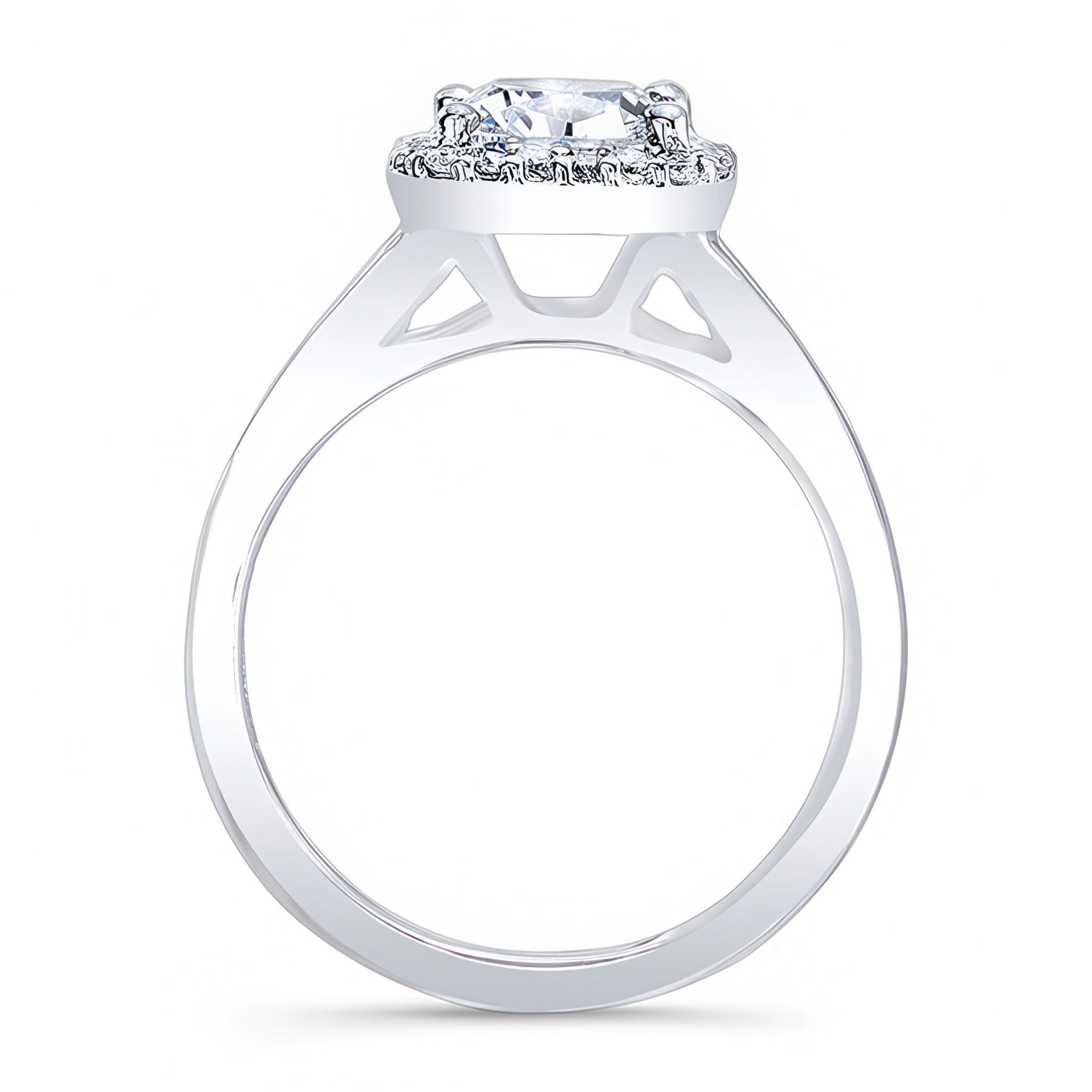 This cushion halo ring features shared prong set diamonds encircling the cushion cut center with a bright polished dainty split shank for a look of sheer elegance.