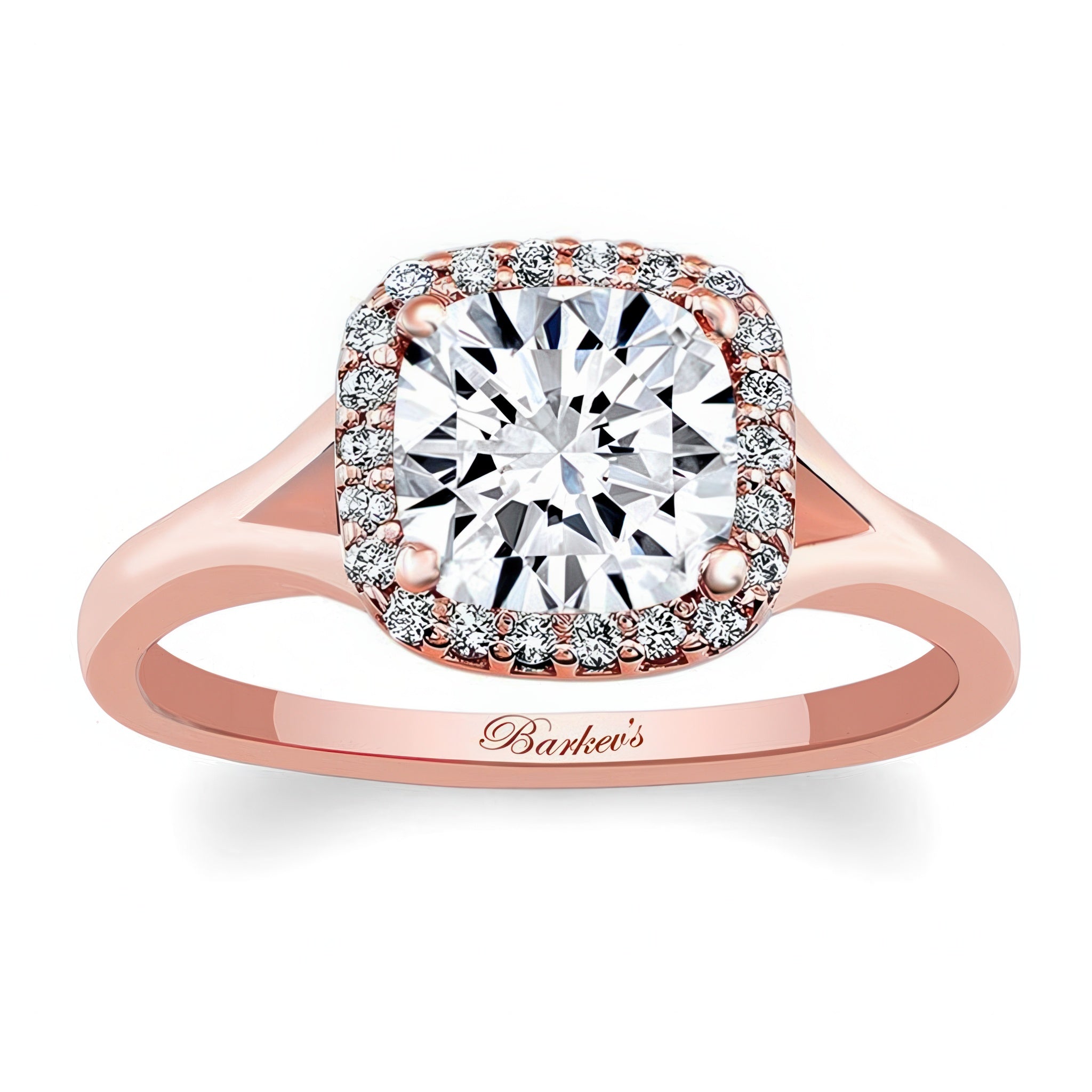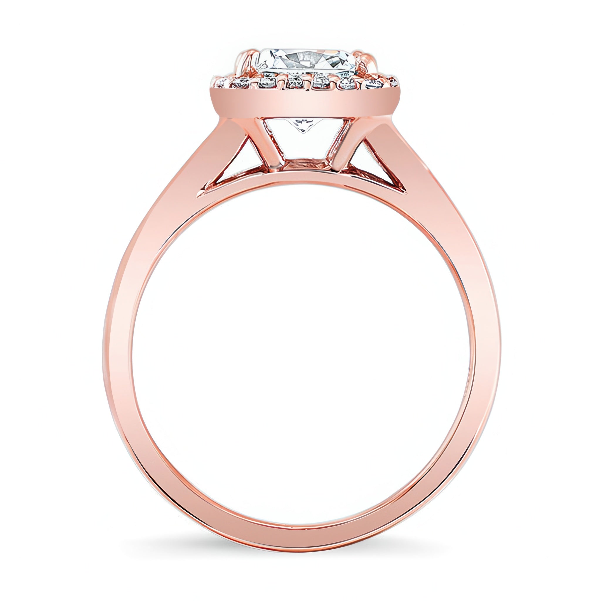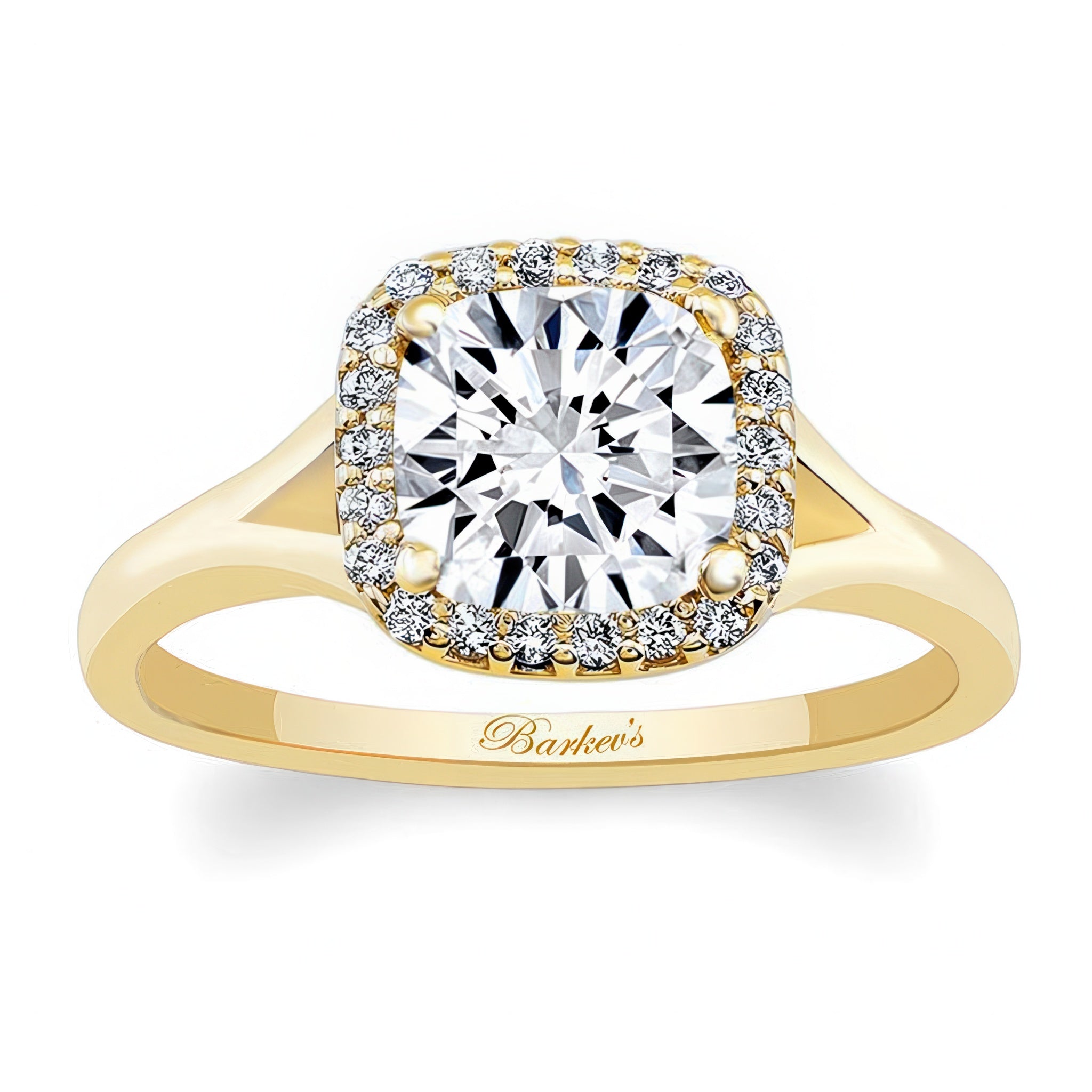 This cushion halo ring features shared prong set diamonds encircling the cushion cut center with a bright polished dainty split shank for a look of sheer elegance.