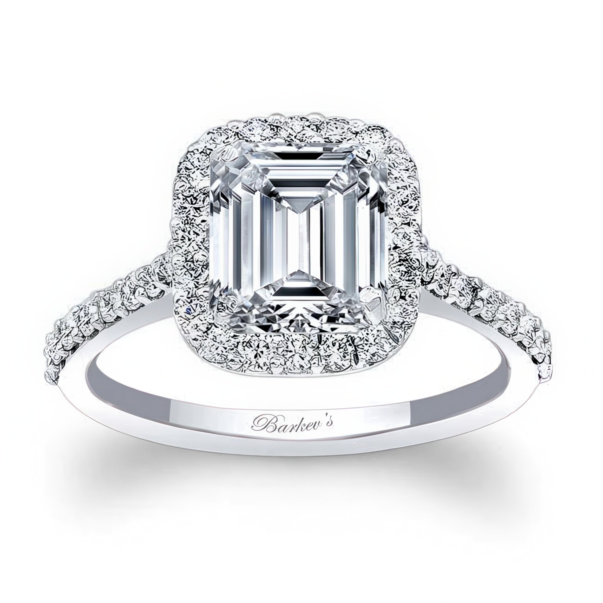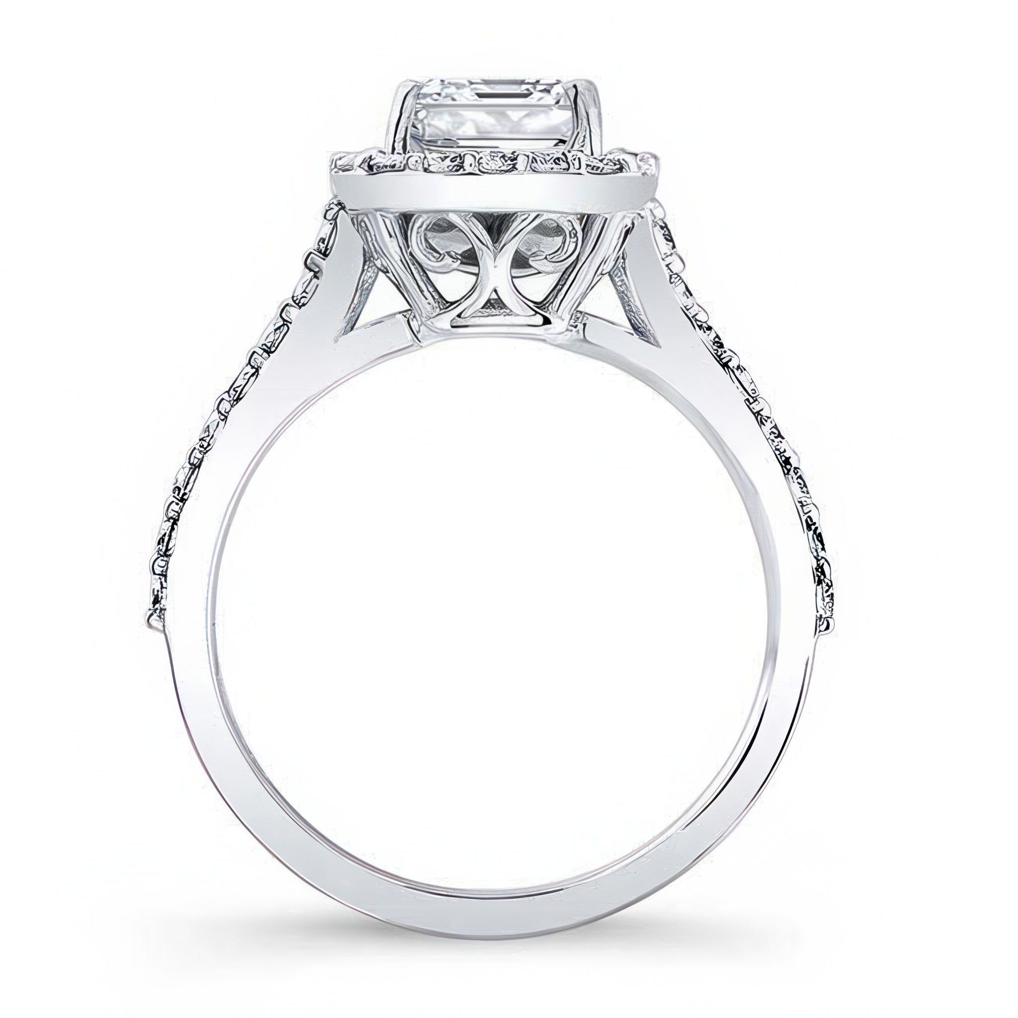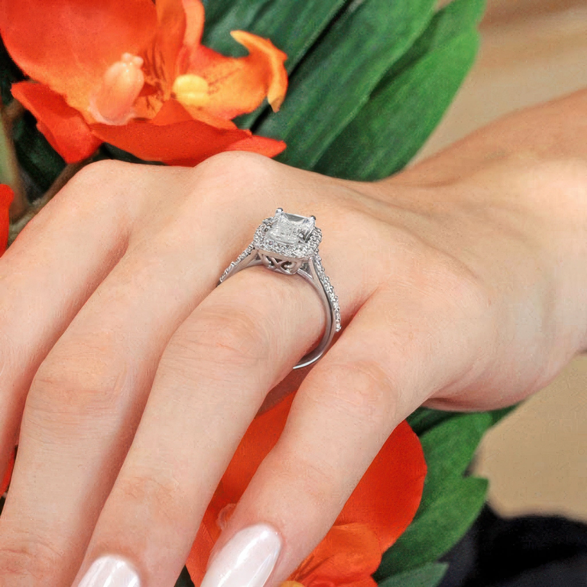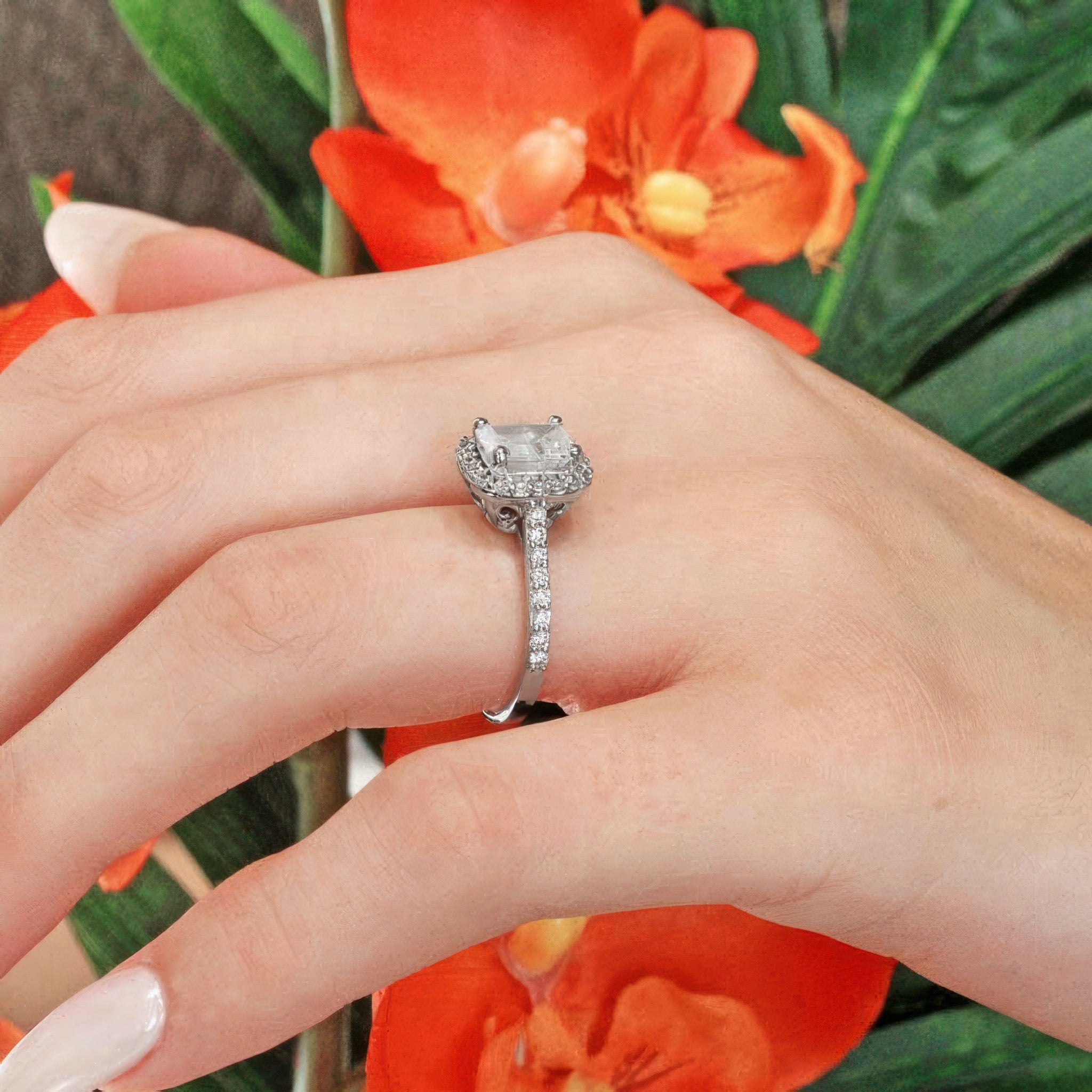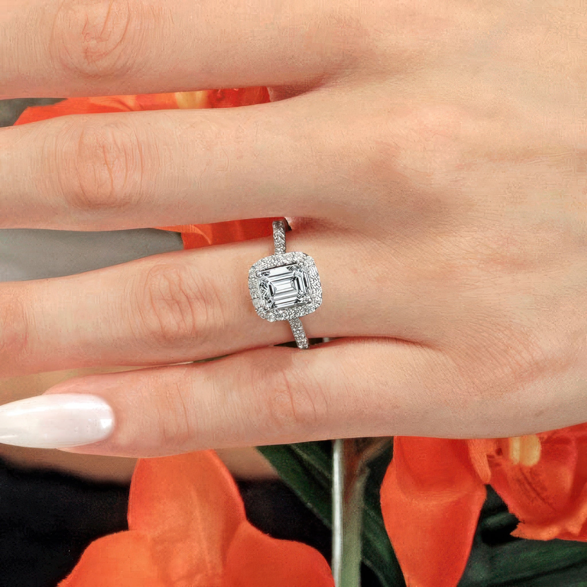 This emerald cut diamond halo ring features shared prong set diamonds encircling the center with additional diamonds cascading down the dainty shank for a look of sheer elegance.