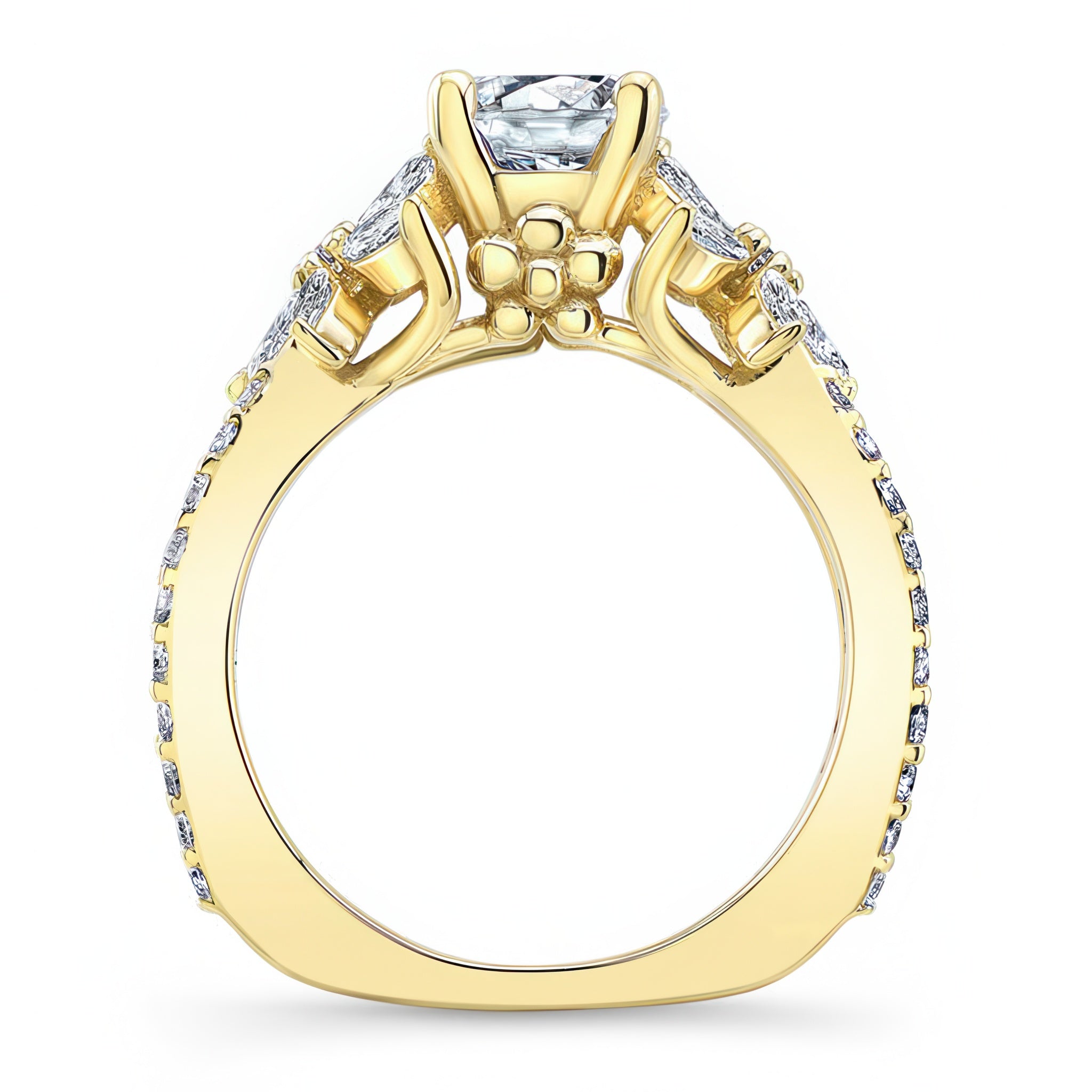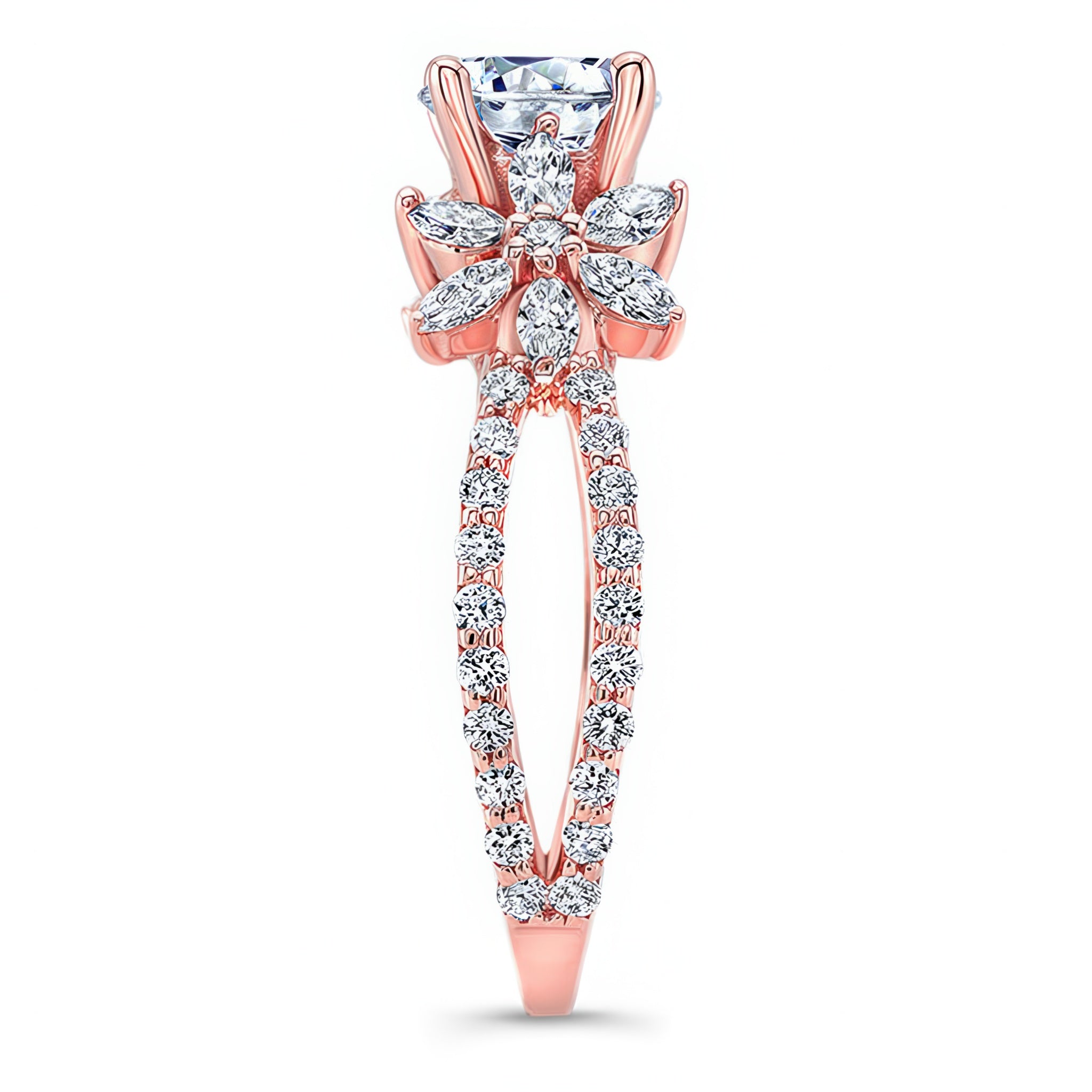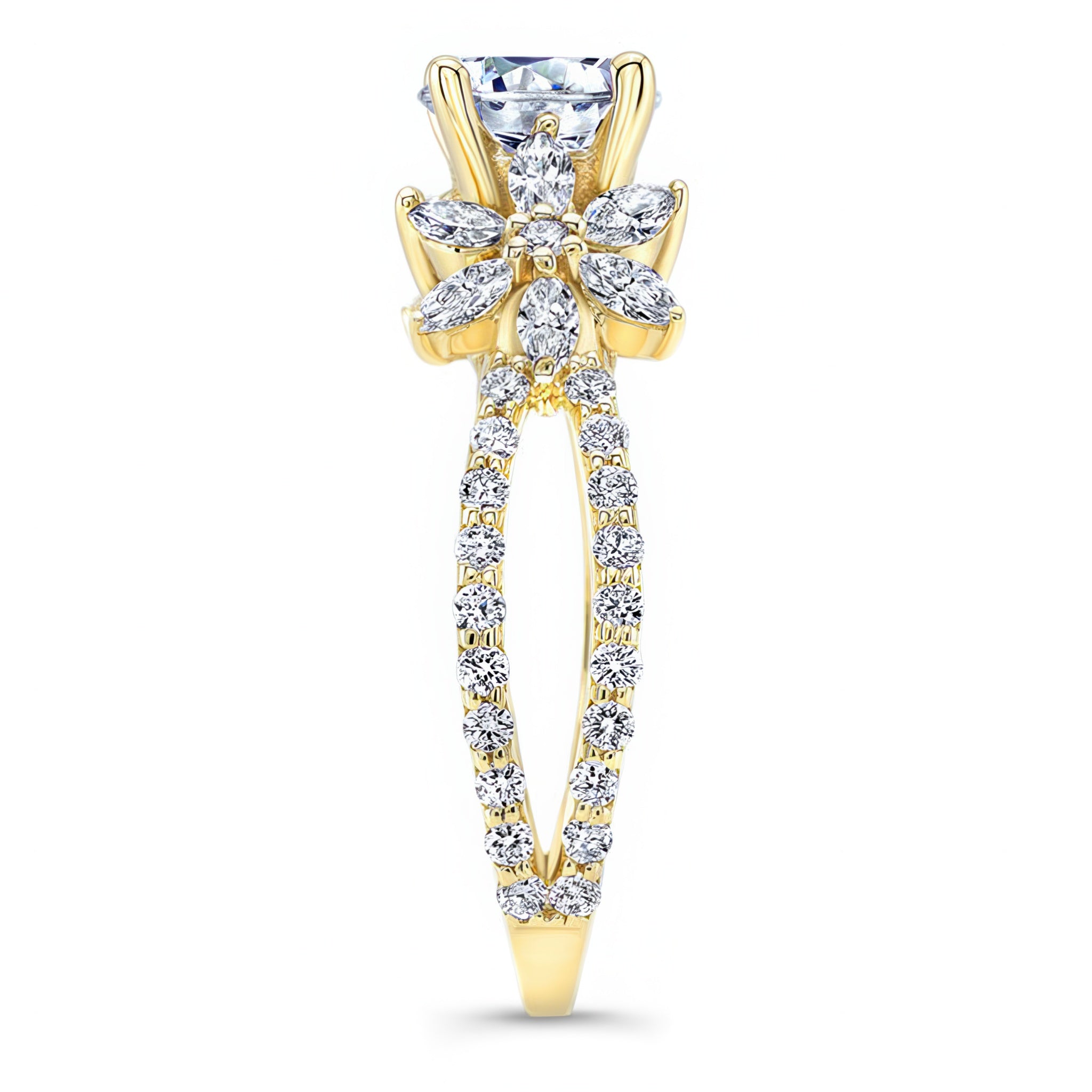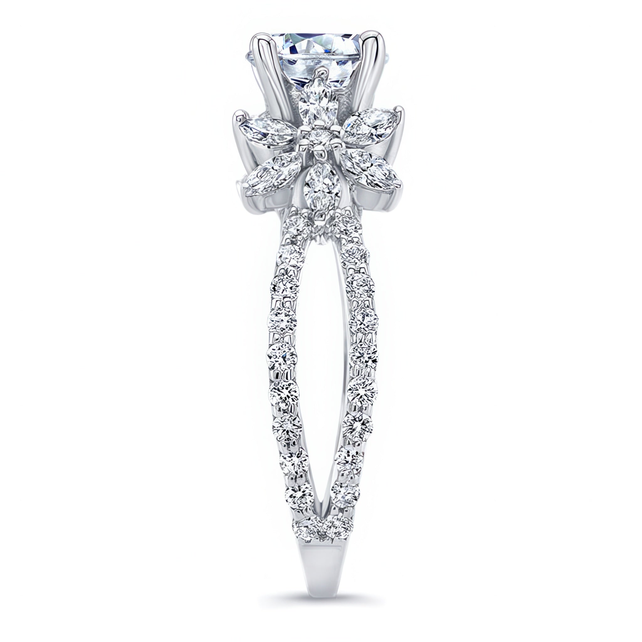 This unique flower ring features a prong set round center with marquise cut diamonds gracing each shoulder like a flower in full bloom and diamond melees adorn the ridges of the shank for a finishing touch of elegance.