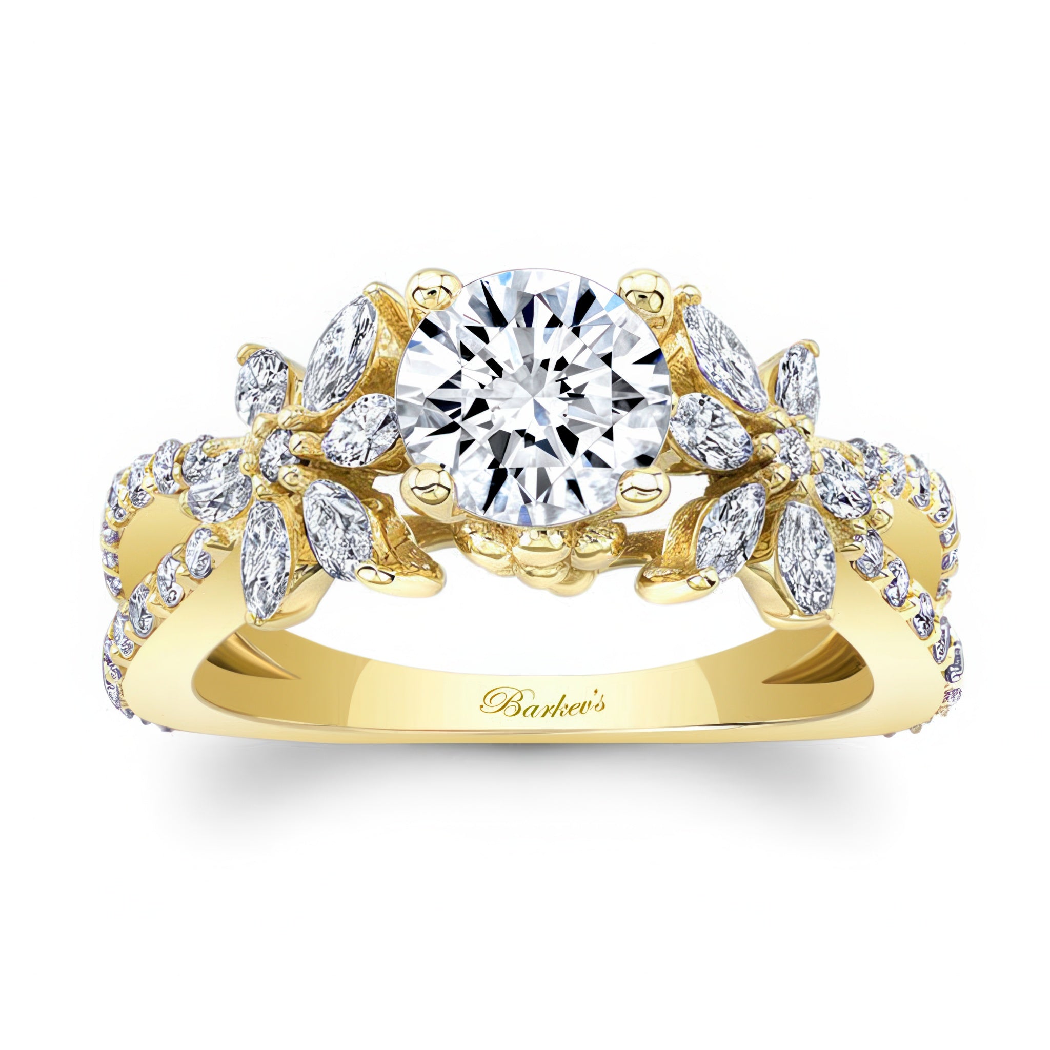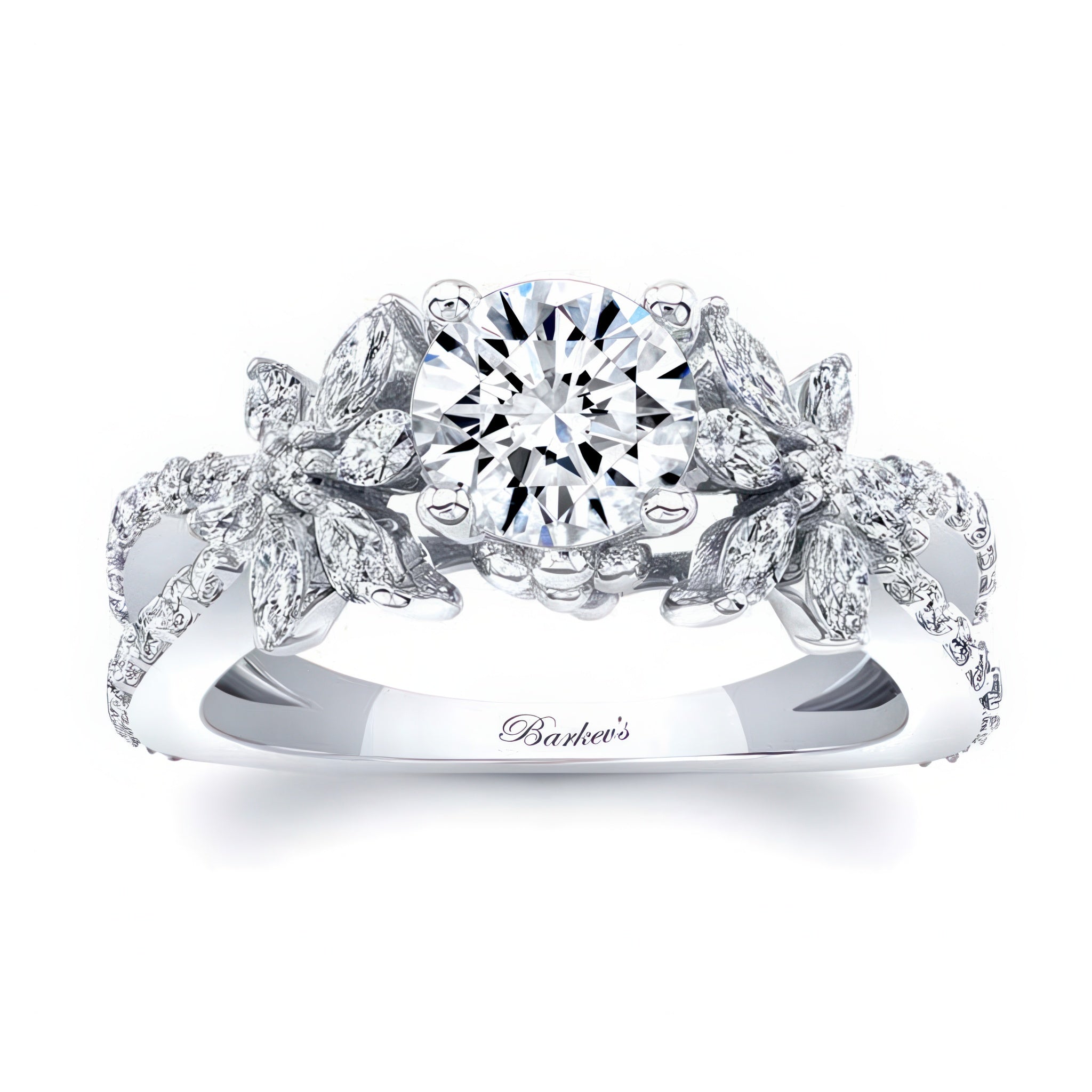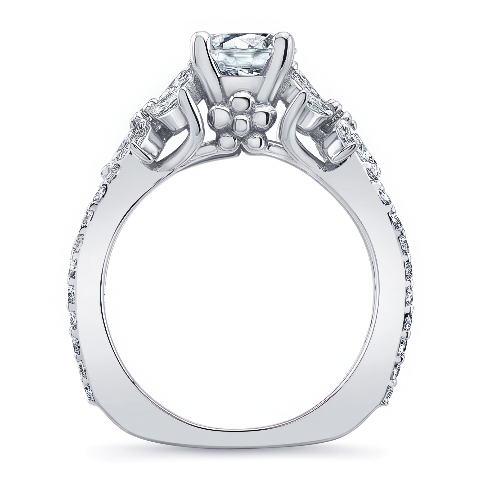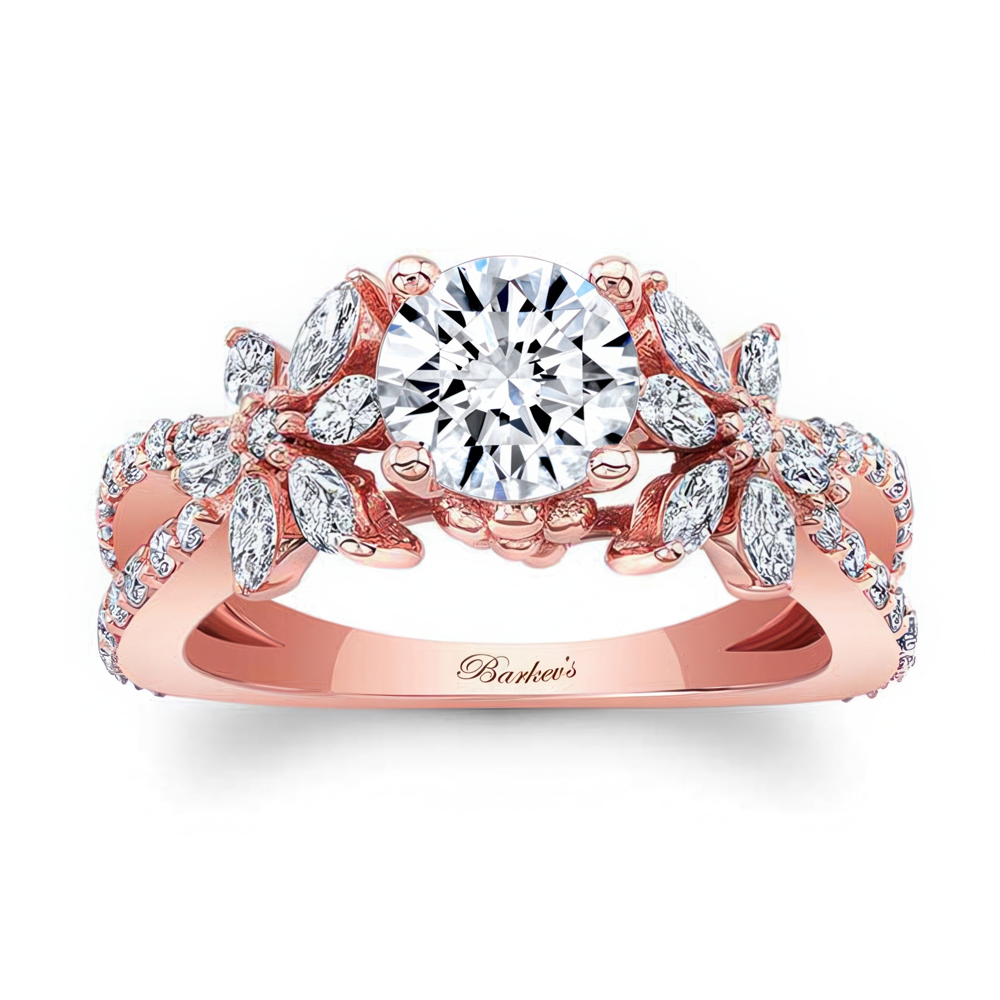 This unique flower ring features a prong set round center with marquise cut diamonds gracing each shoulder like a flower in full bloom and diamond melees adorn the ridges of the shank for a finishing touch of elegance.