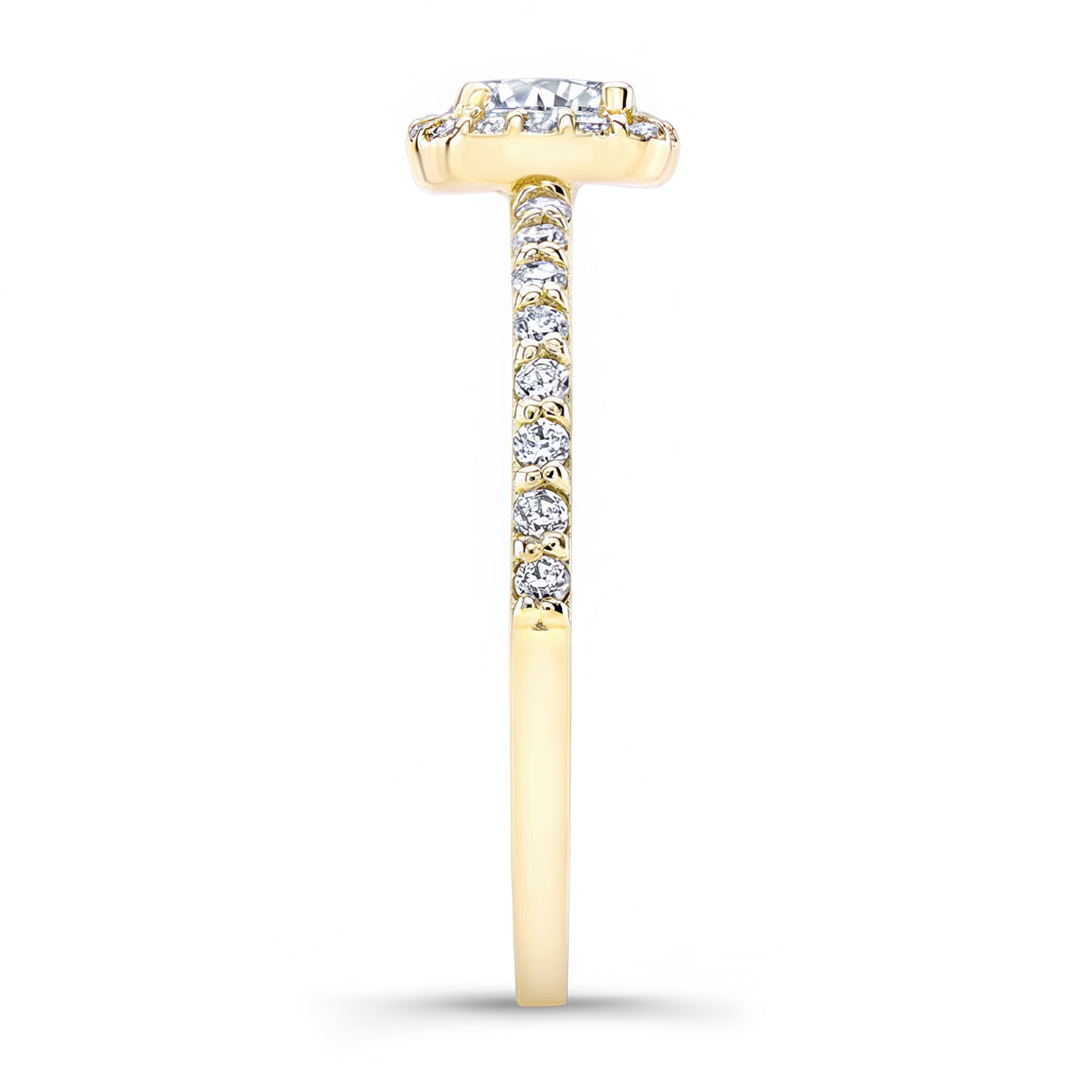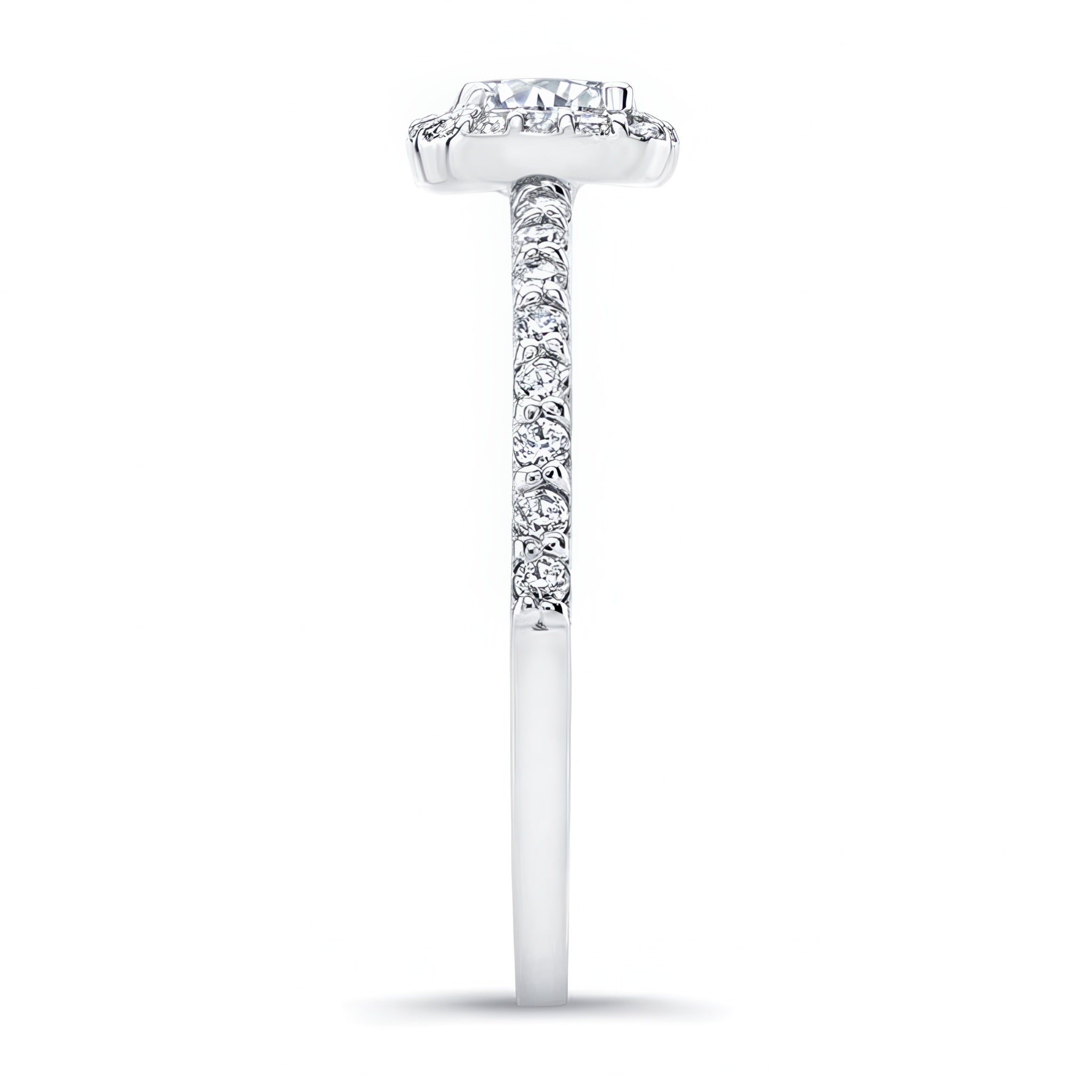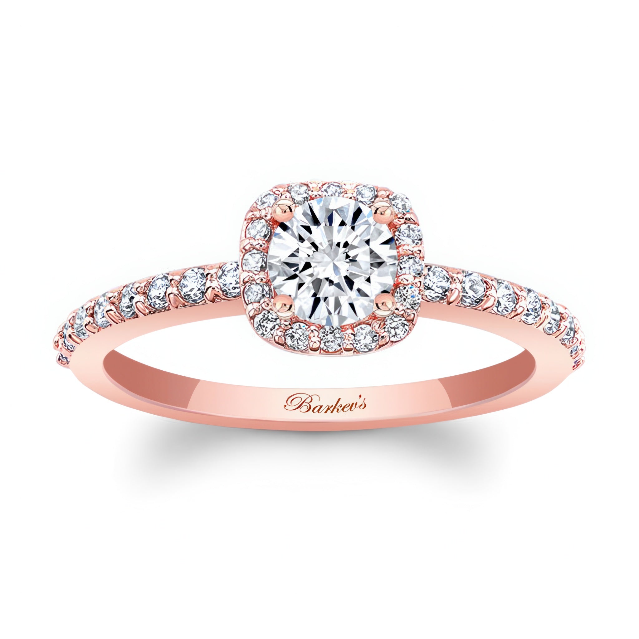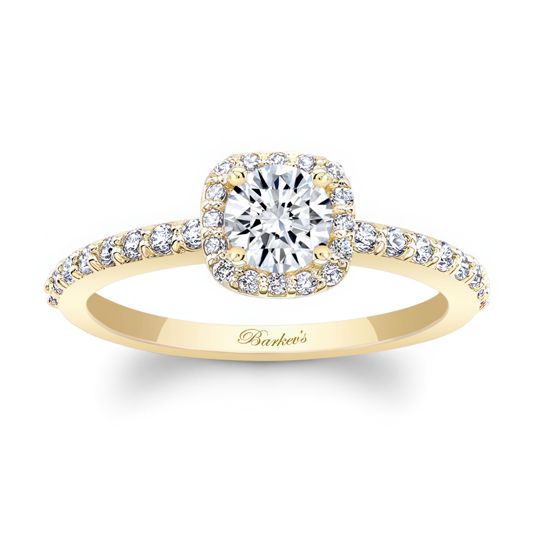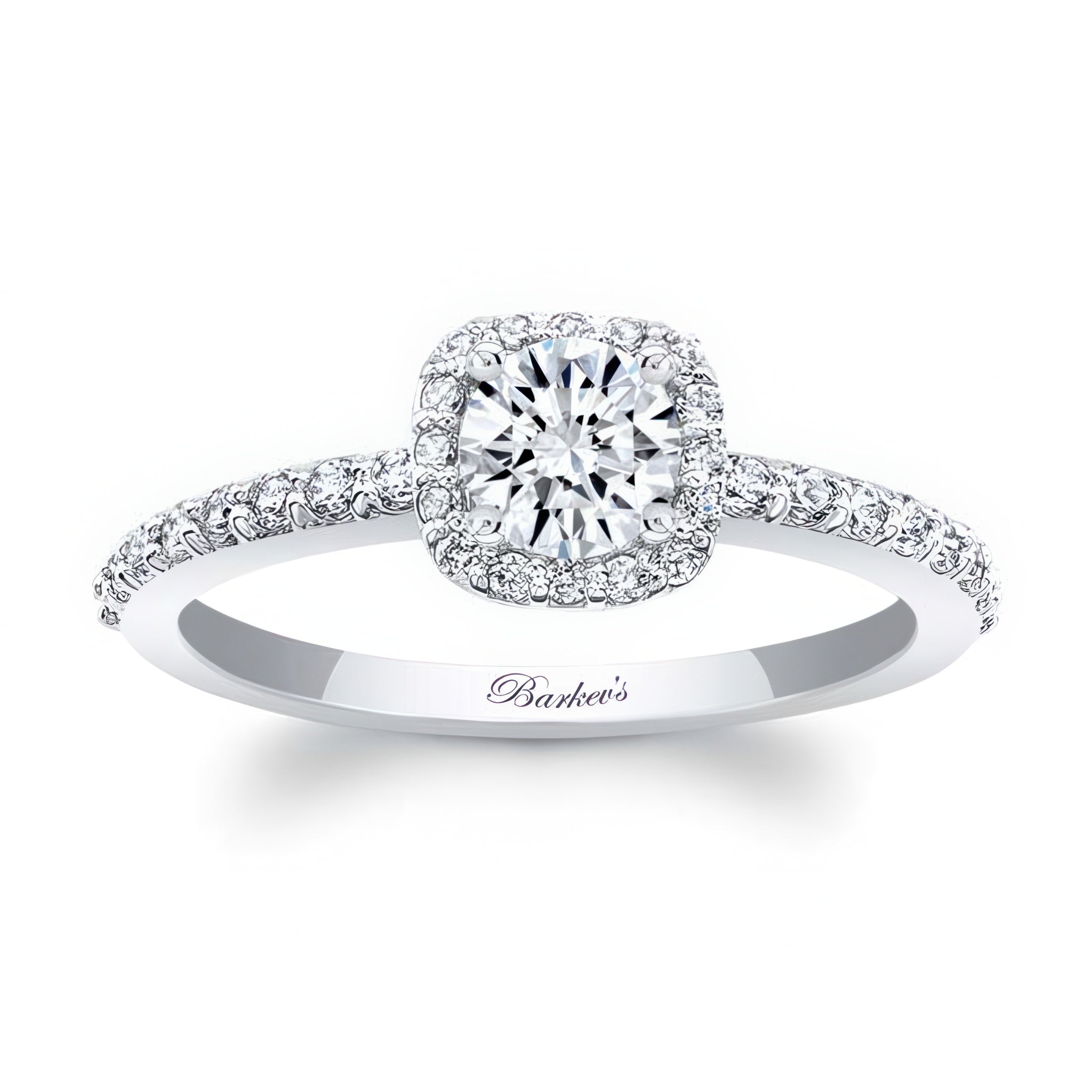 A dazzling half carat halo ring with a cushion halo surrounding the round center with pave set diamonds cascading down the slender band for a finishing touch of glamour.