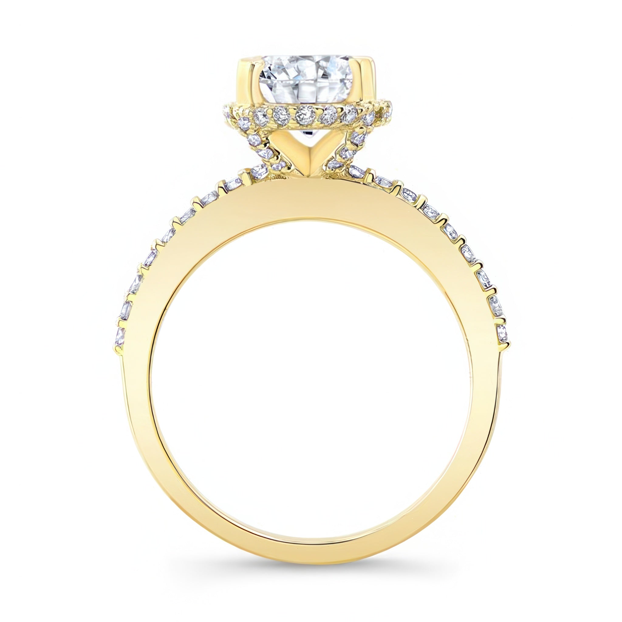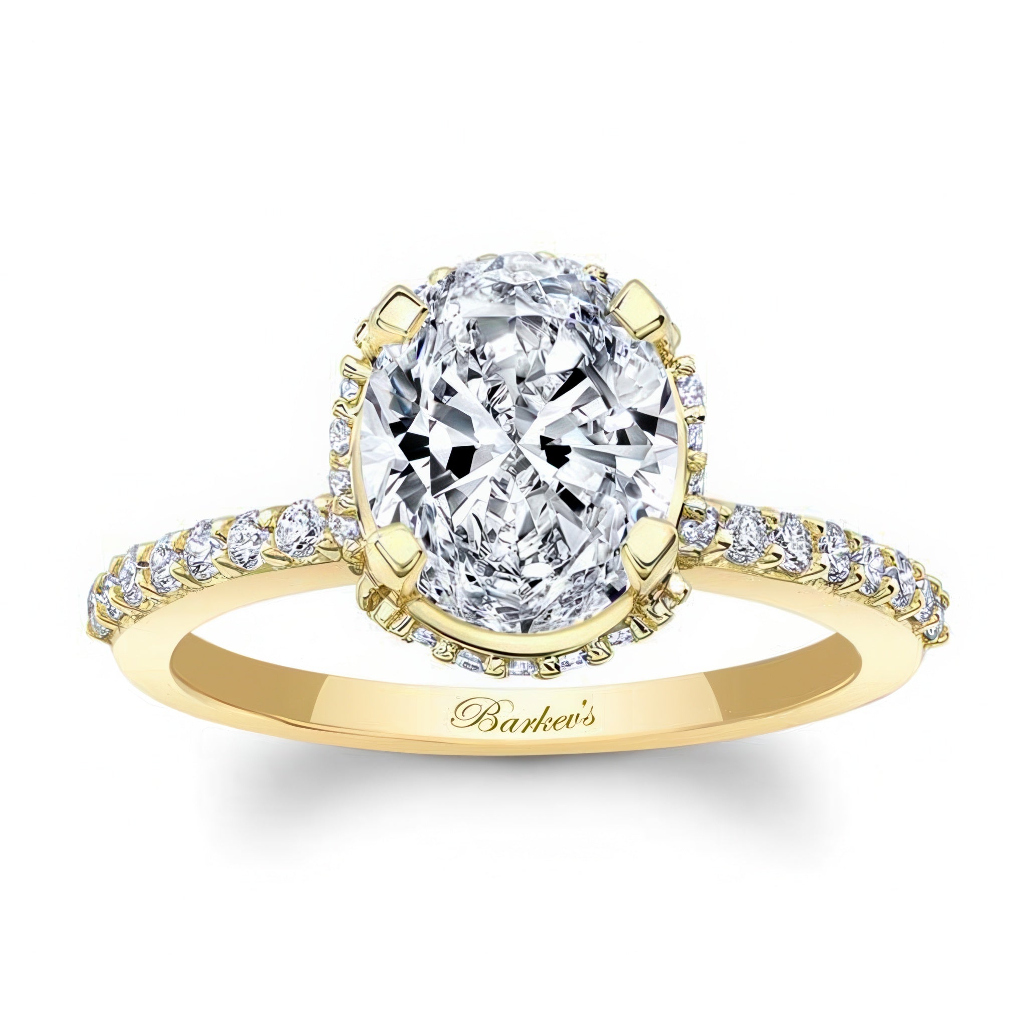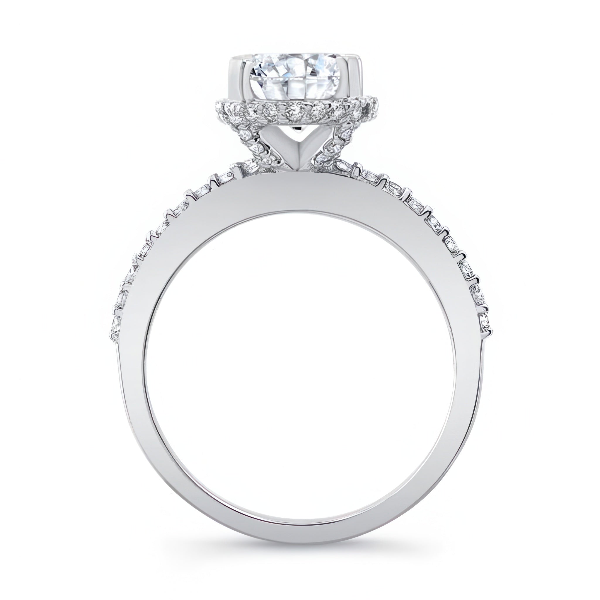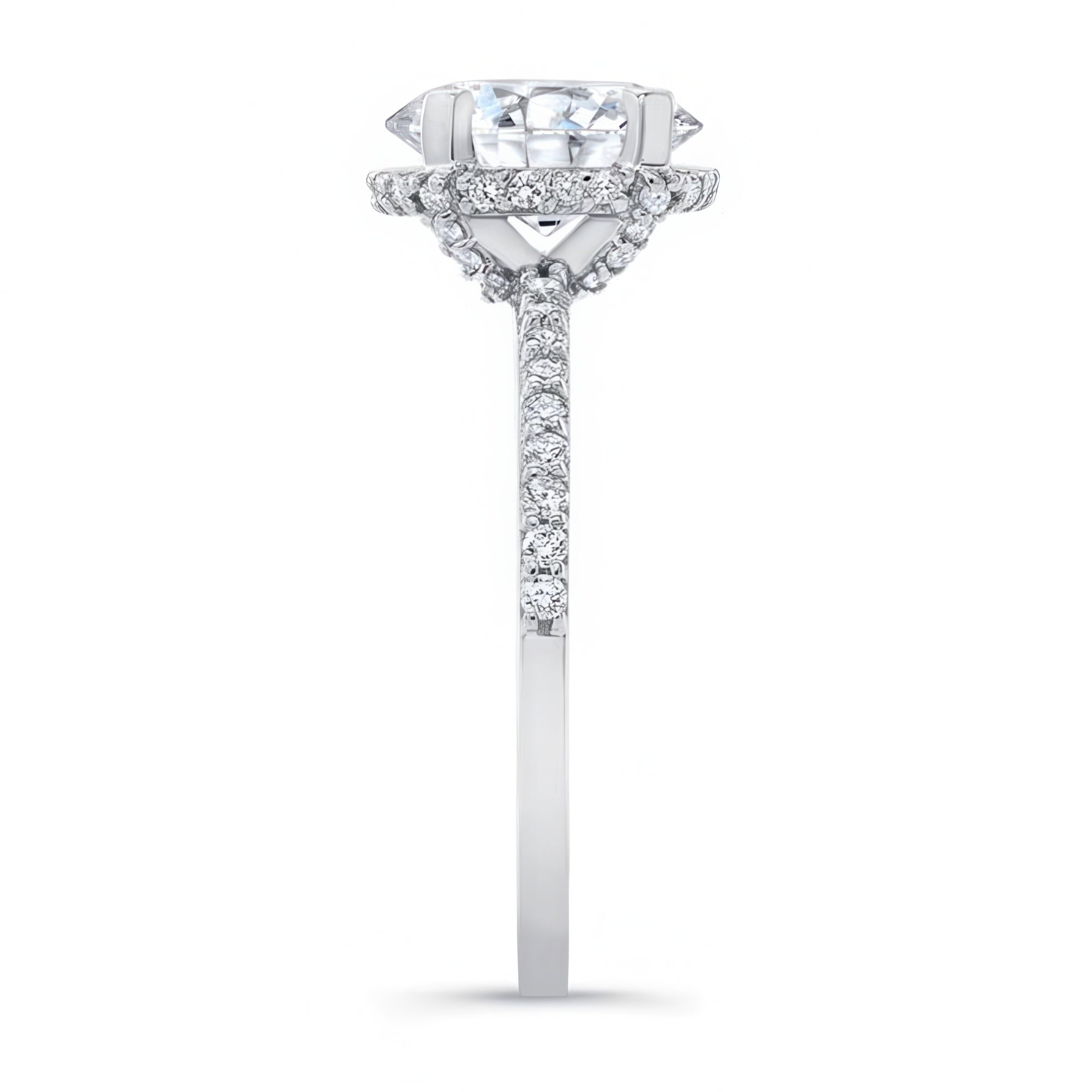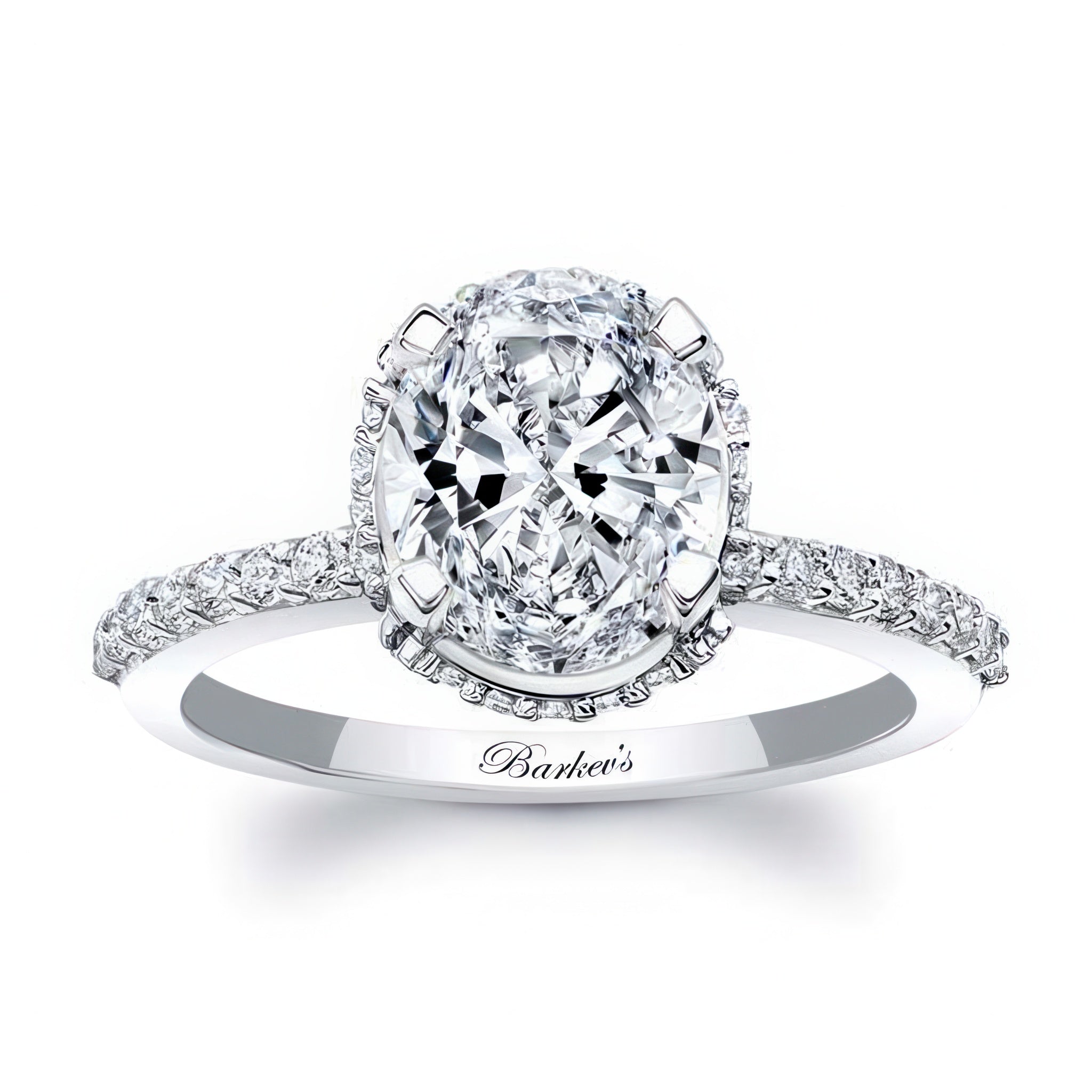 This hidden halo oval engagement ring is for those who appreciate elongated shapes. Featuring a flow of diamonds that encircle the center just underneath and then spread down along the shank for a magnificent elegant design.
