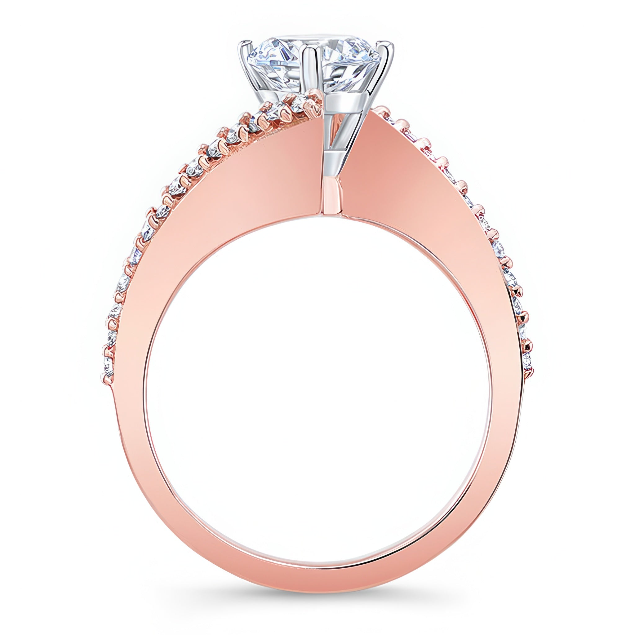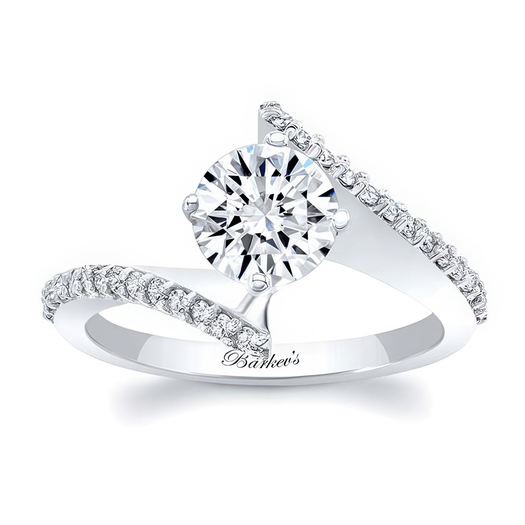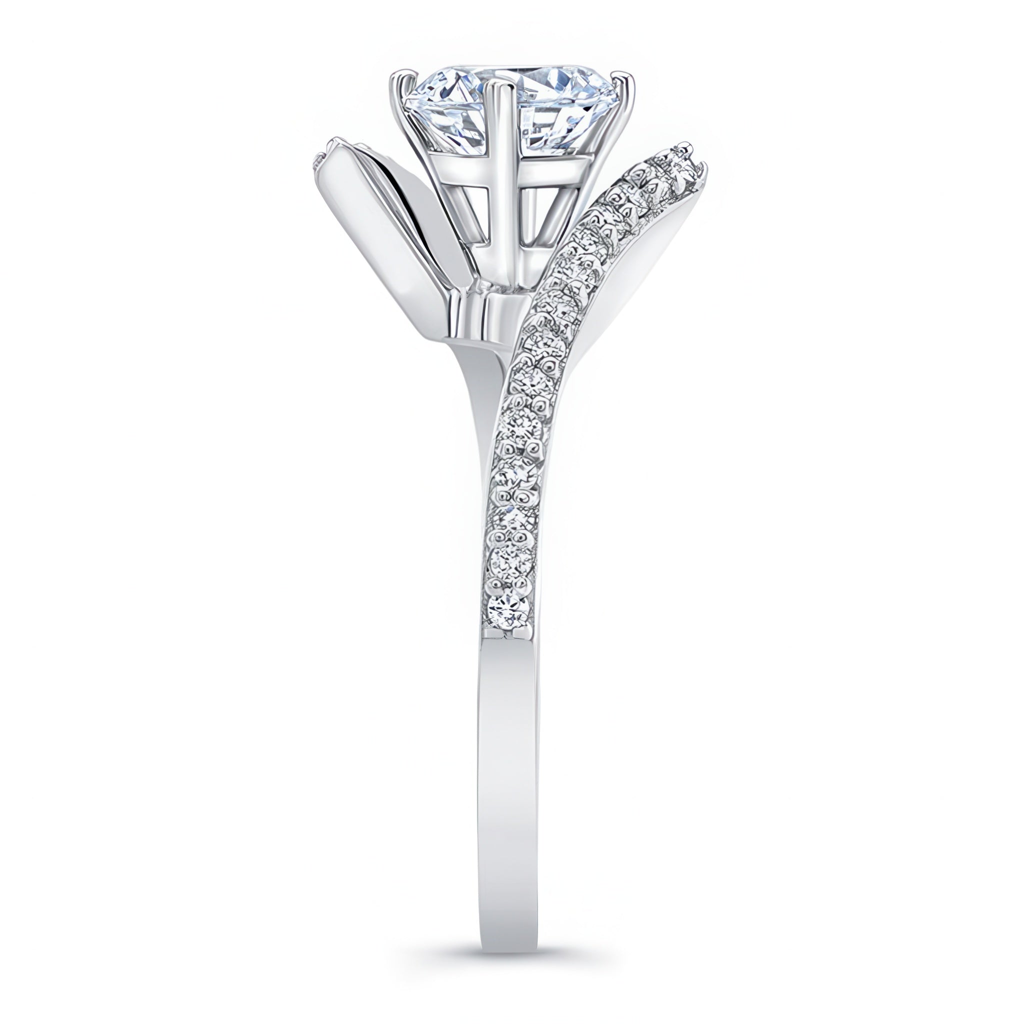 A stunning modern bypass engagement ring featuring a prong set round center with sharing prong set diamonds gracing the ridges for a dramatic look sure to catch the eye of many admirers.