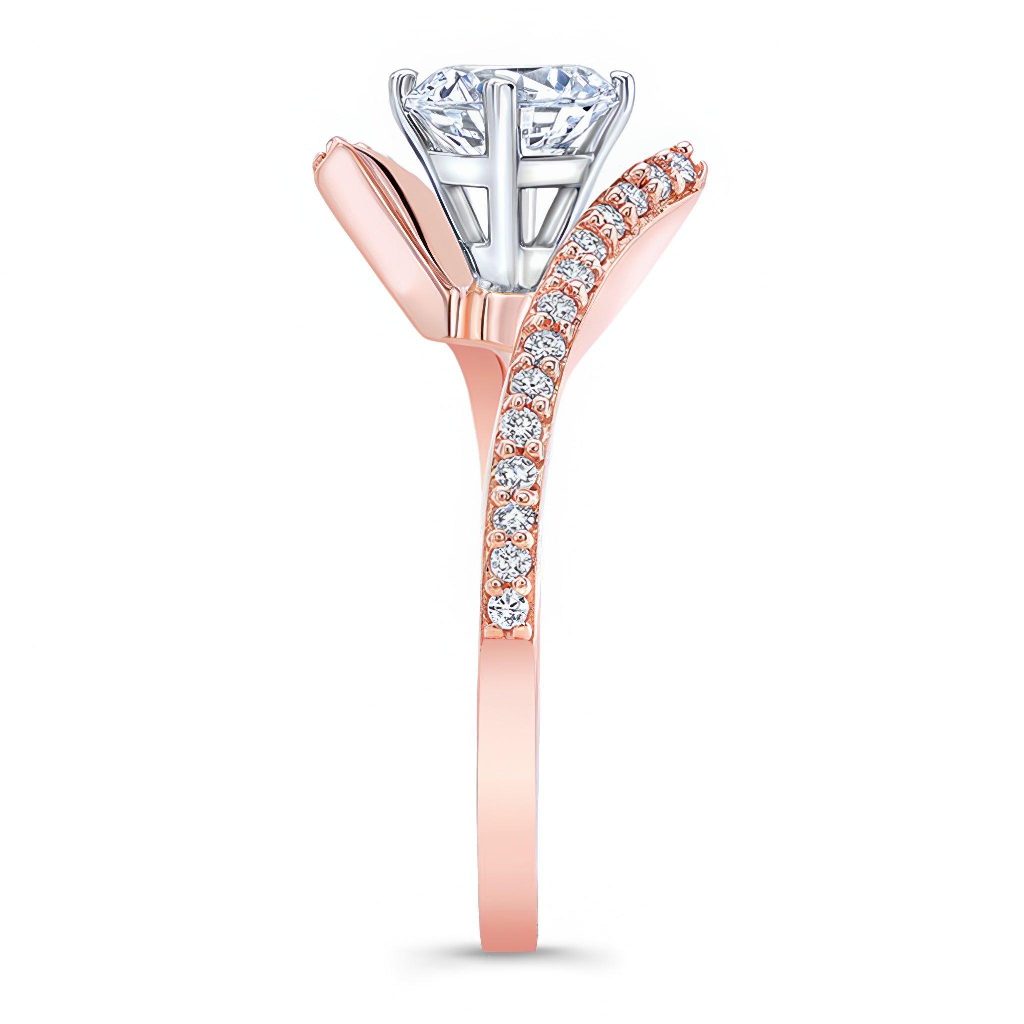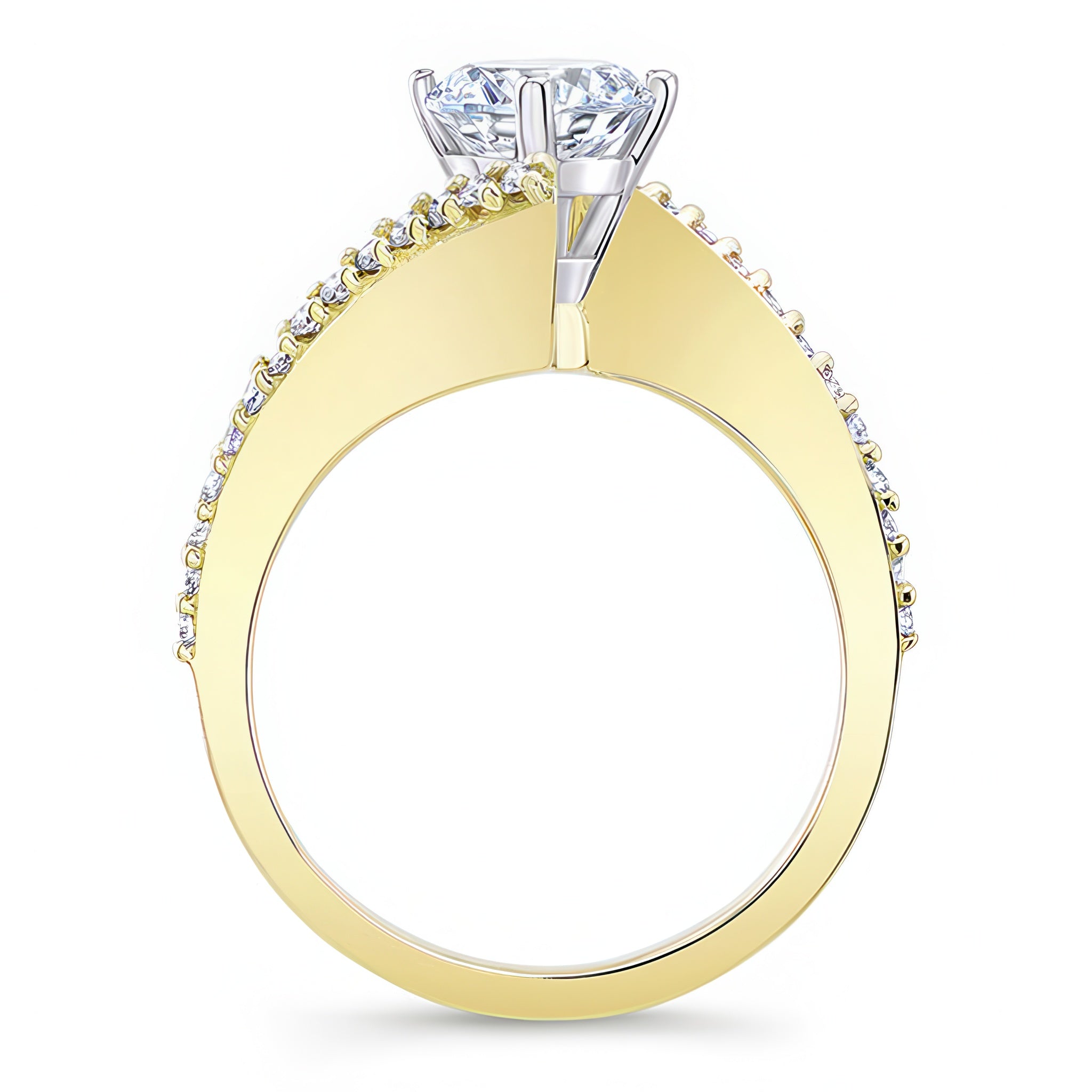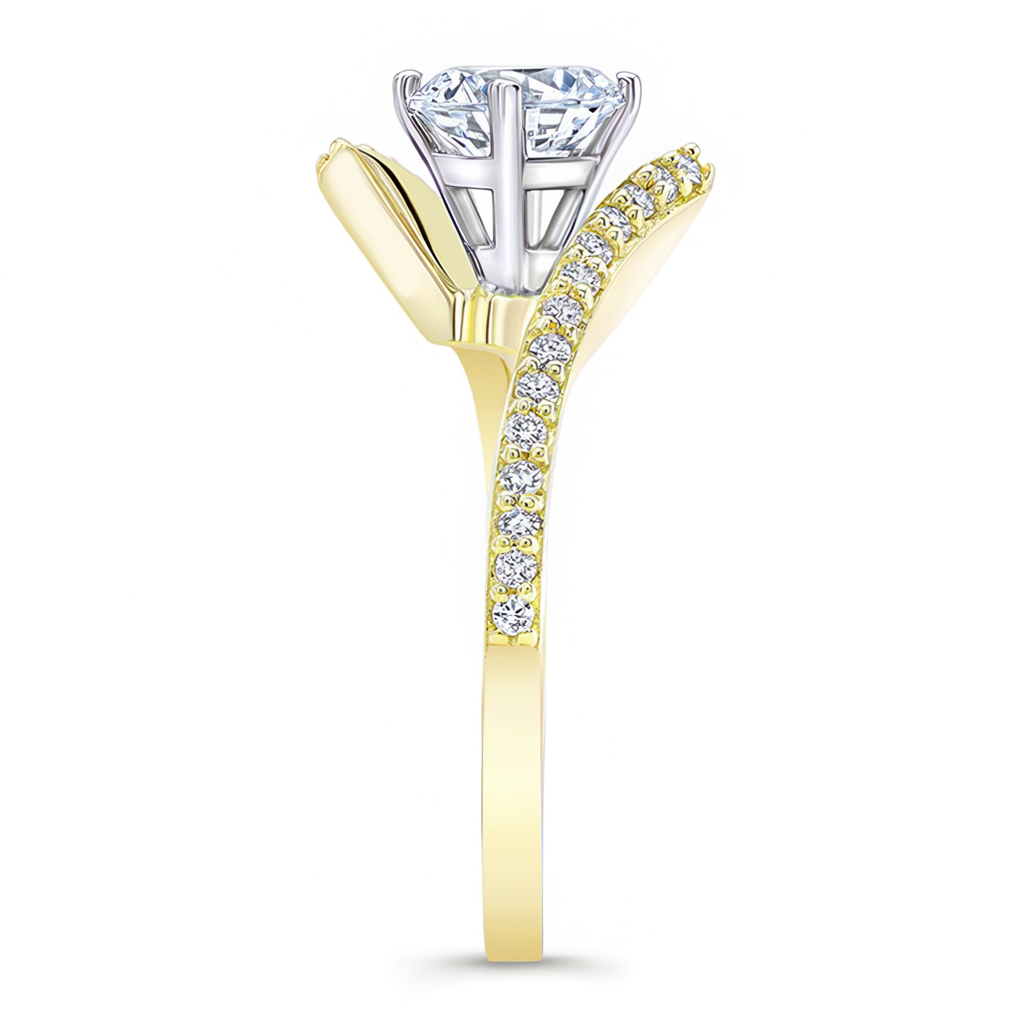 A stunning modern bypass engagement ring featuring a prong set round center with sharing prong set diamonds gracing the ridges for a dramatic look sure to catch the eye of many admirers.
