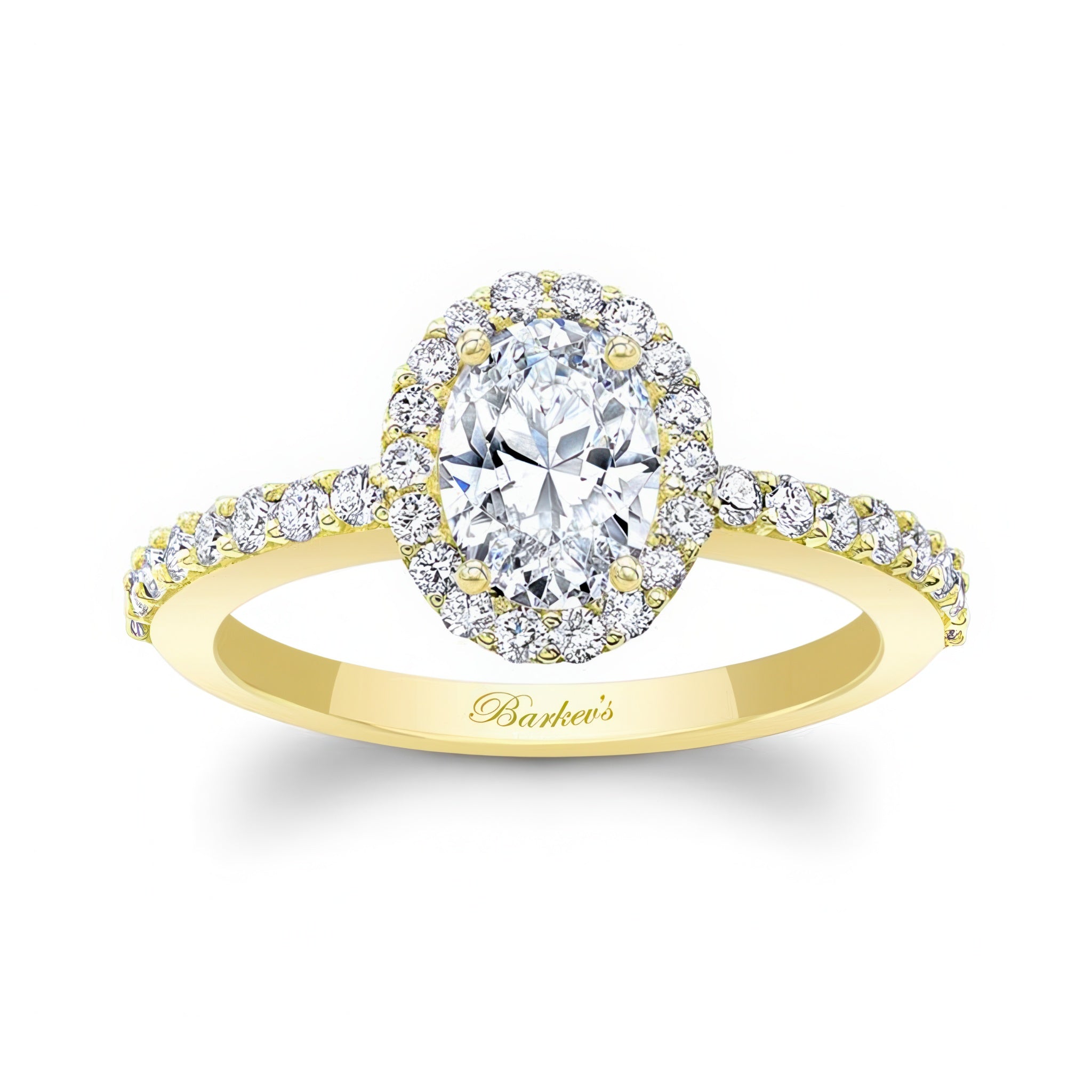 A classic oval halo engagement ring featuring a 1 carat center surrounded by diamonds and side stones on the bright polished shank.