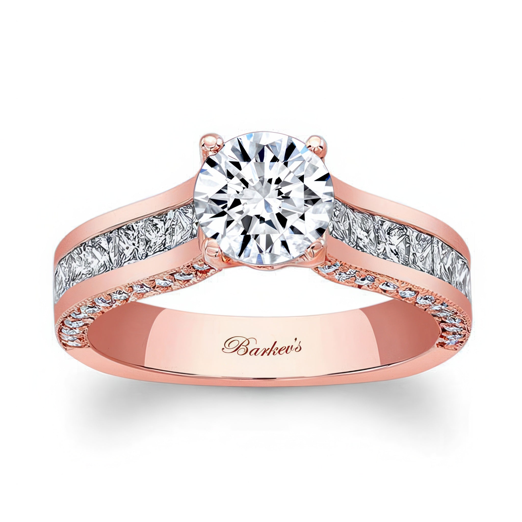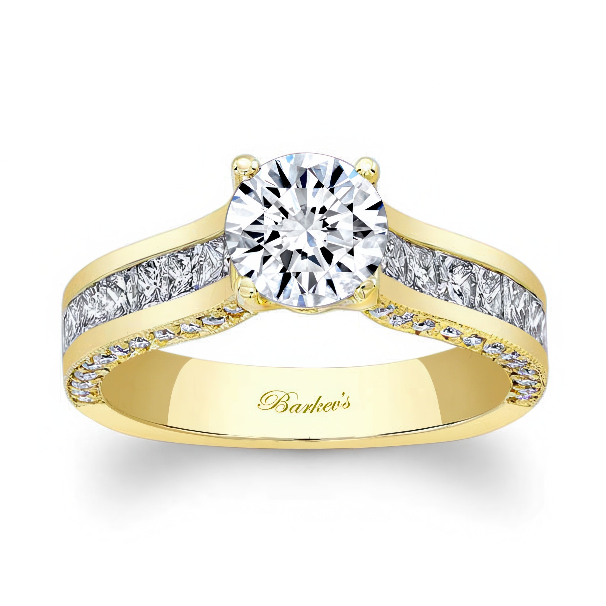 This round and princess cut diamond ring has a prong set center with a channel of princess cut diamonds on the shoulders and pave set diamonds on the sides for an elegant touch of sophistication.