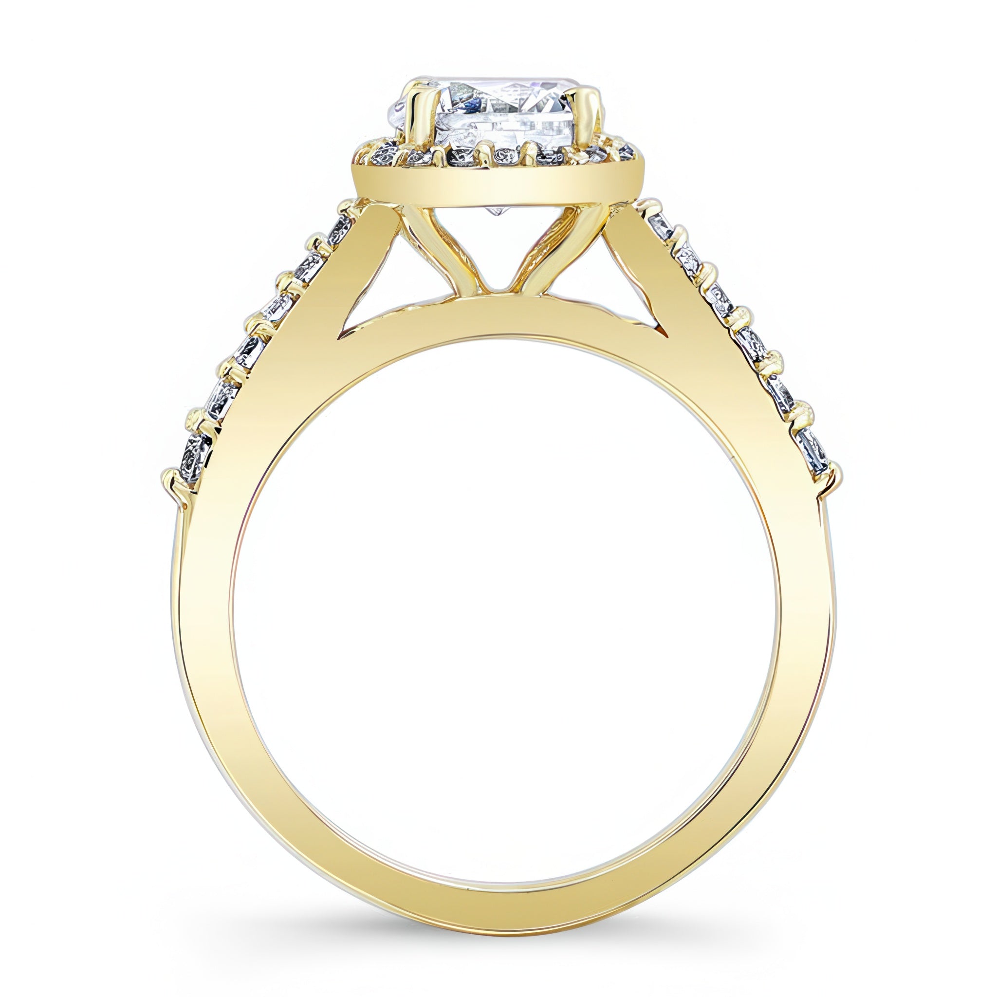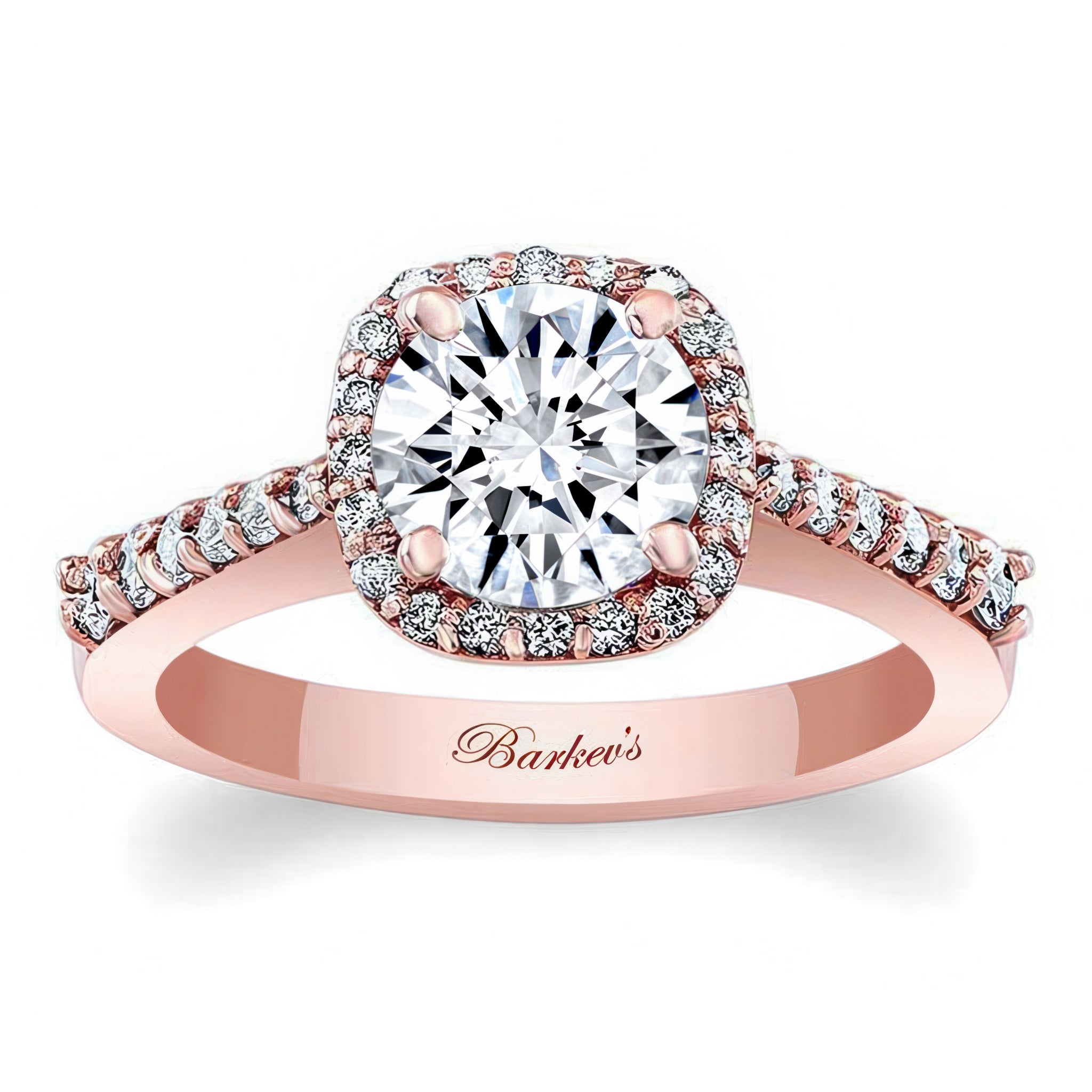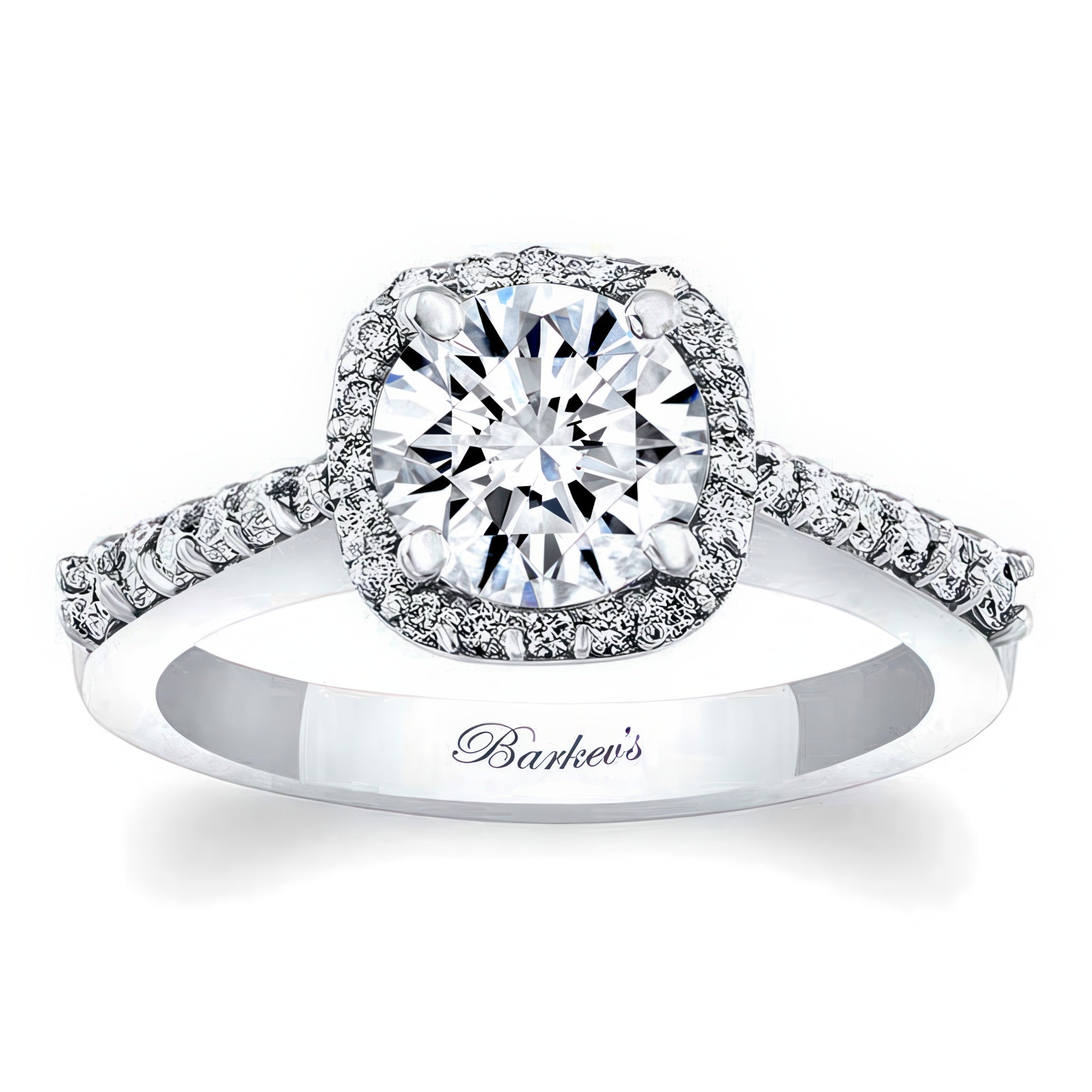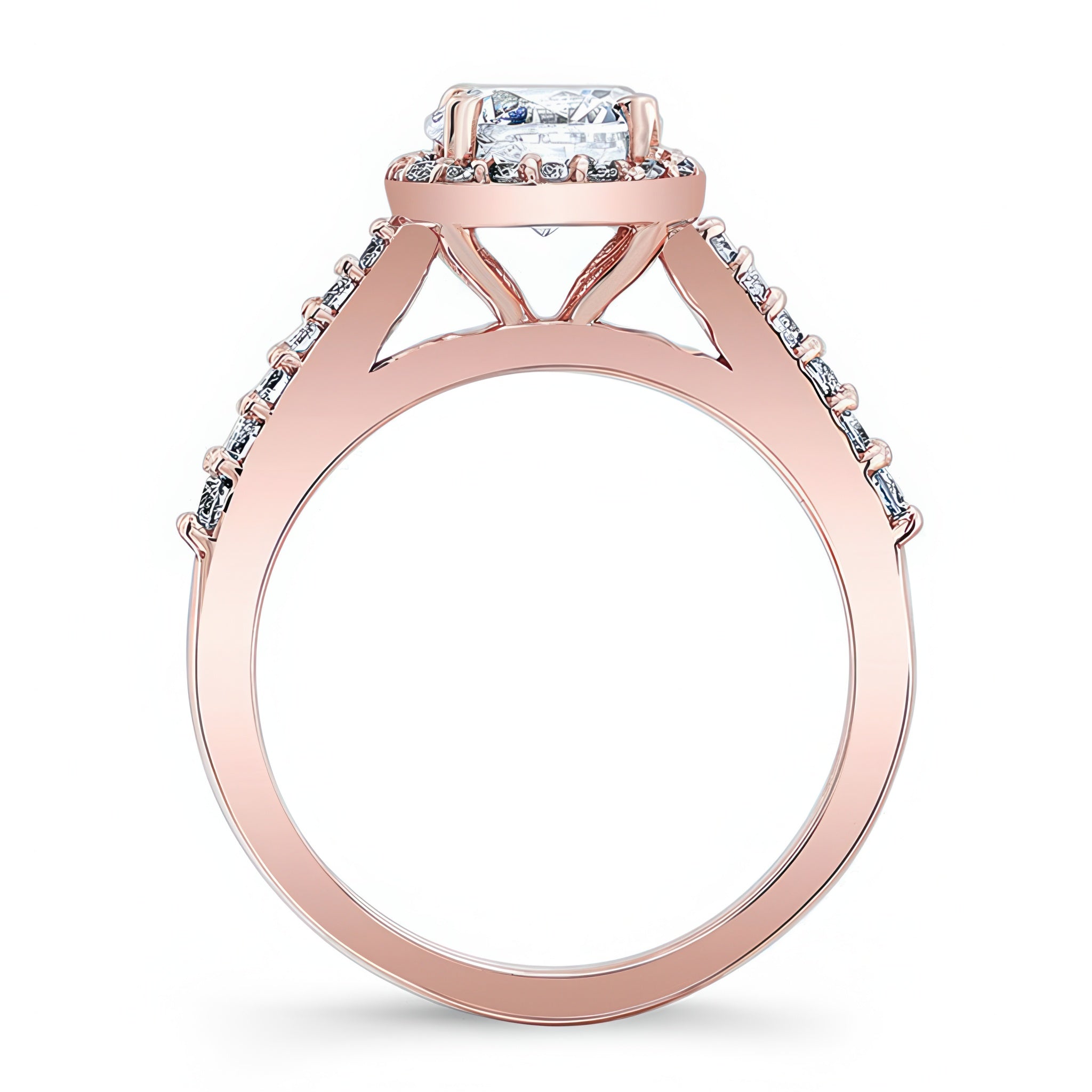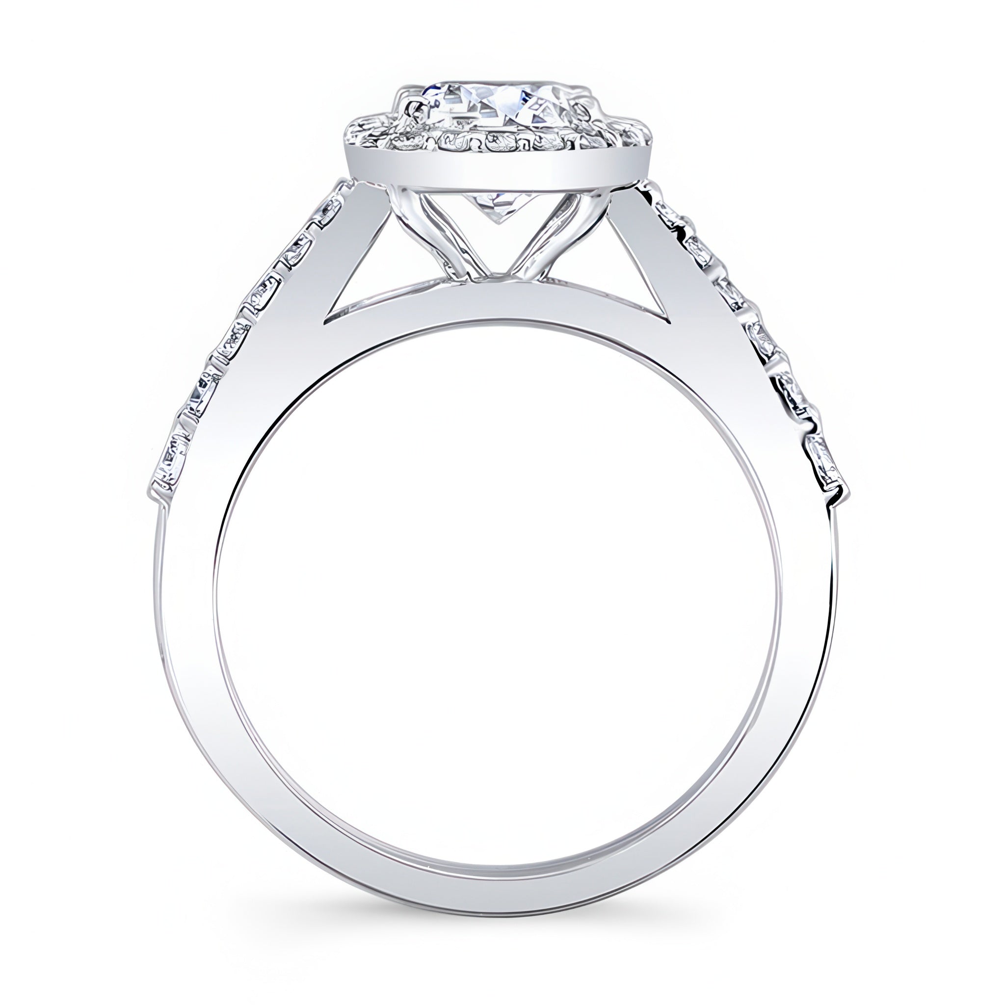 This round diamond halo ring features a cathedral shank with a prong set round center and a cushion halo while shared prong set diamonds graduate up the dainty tapering shank for a look of sheer elegance.