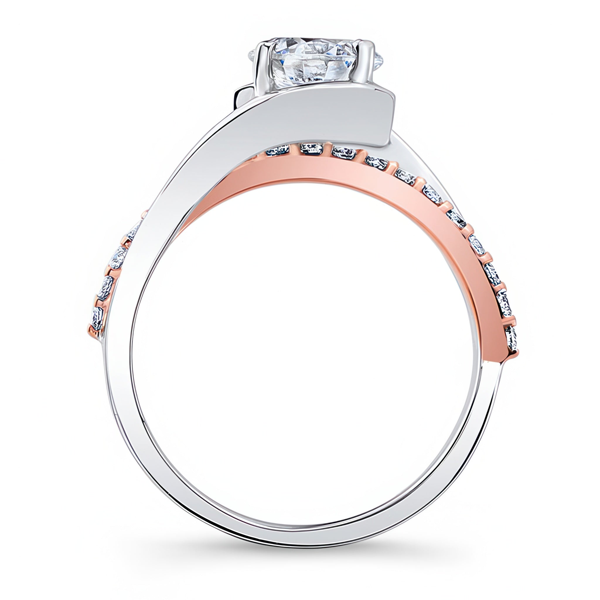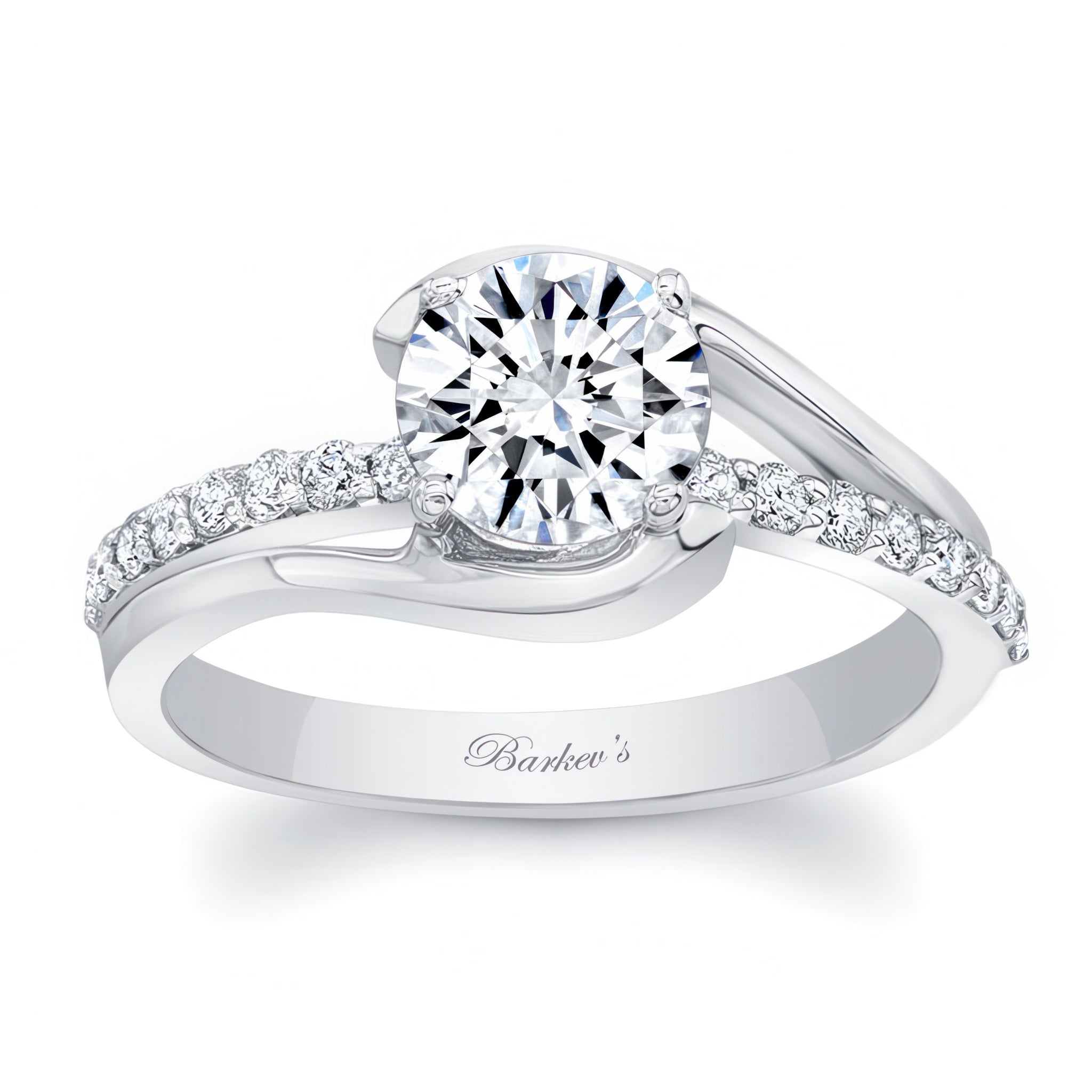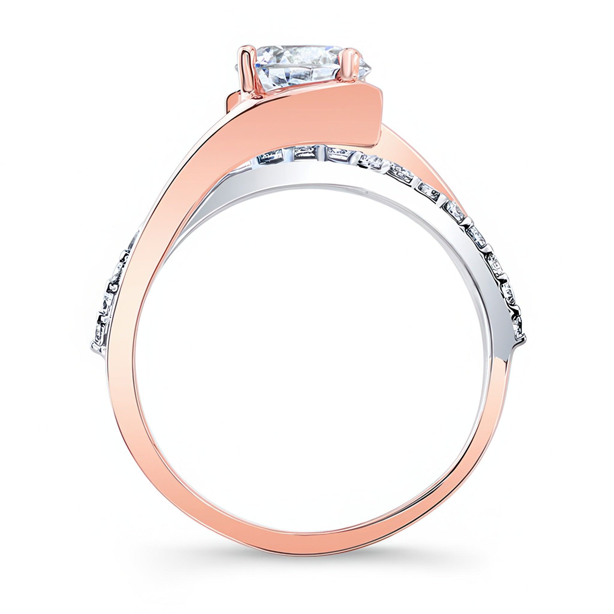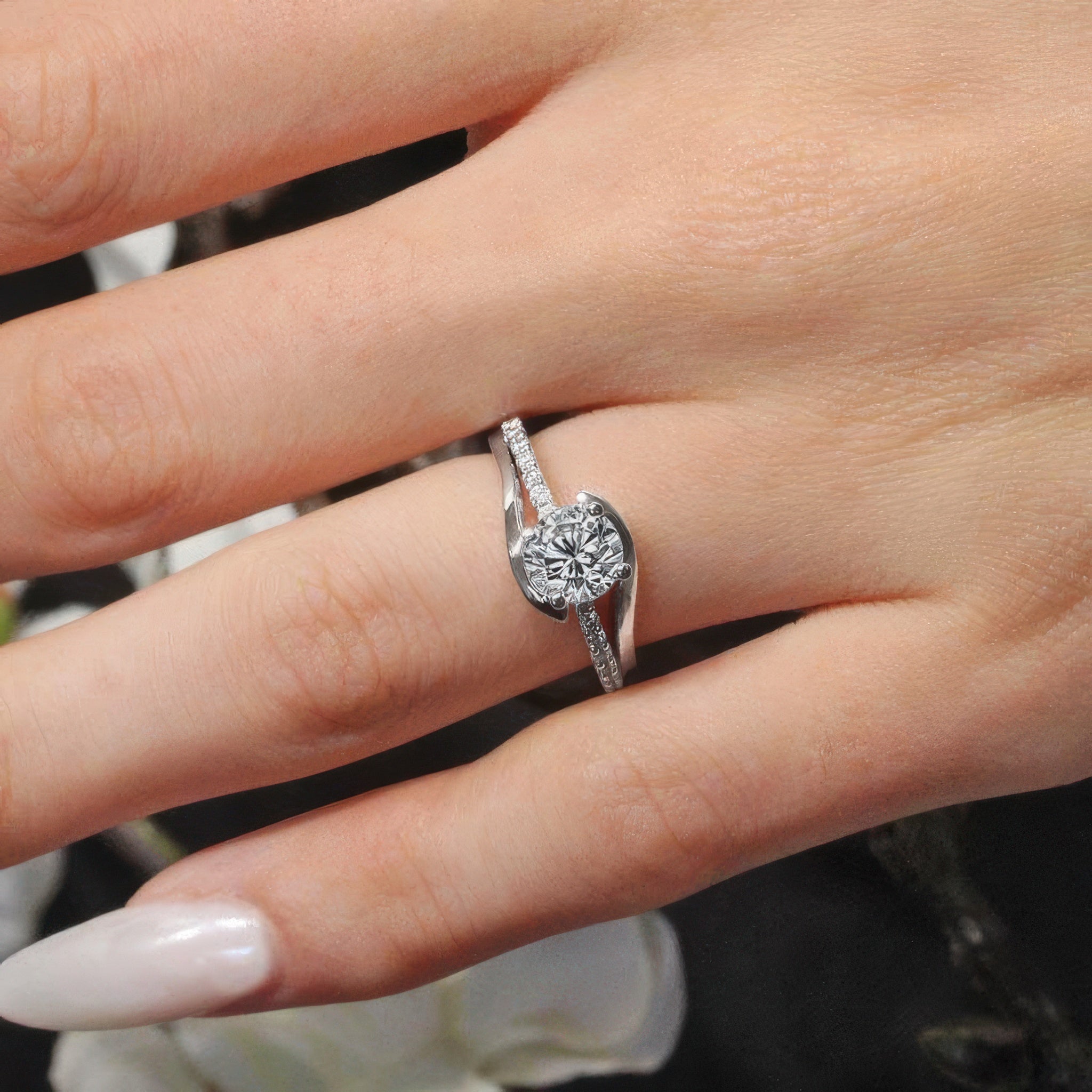 This simple 1 carat round diamond ring features a split shank that swirls to cradle the round center while a shared prong set diamond bridge crosses underneath for a dramatic fashion statement.