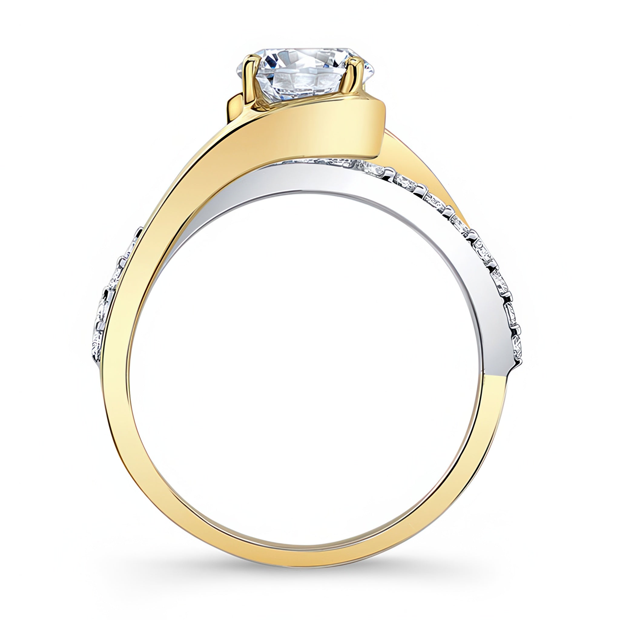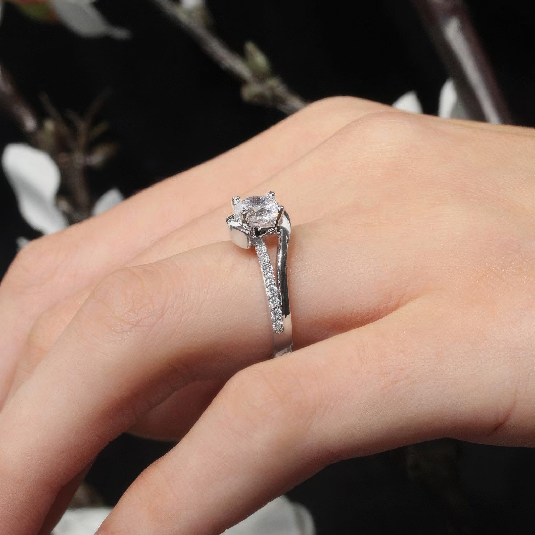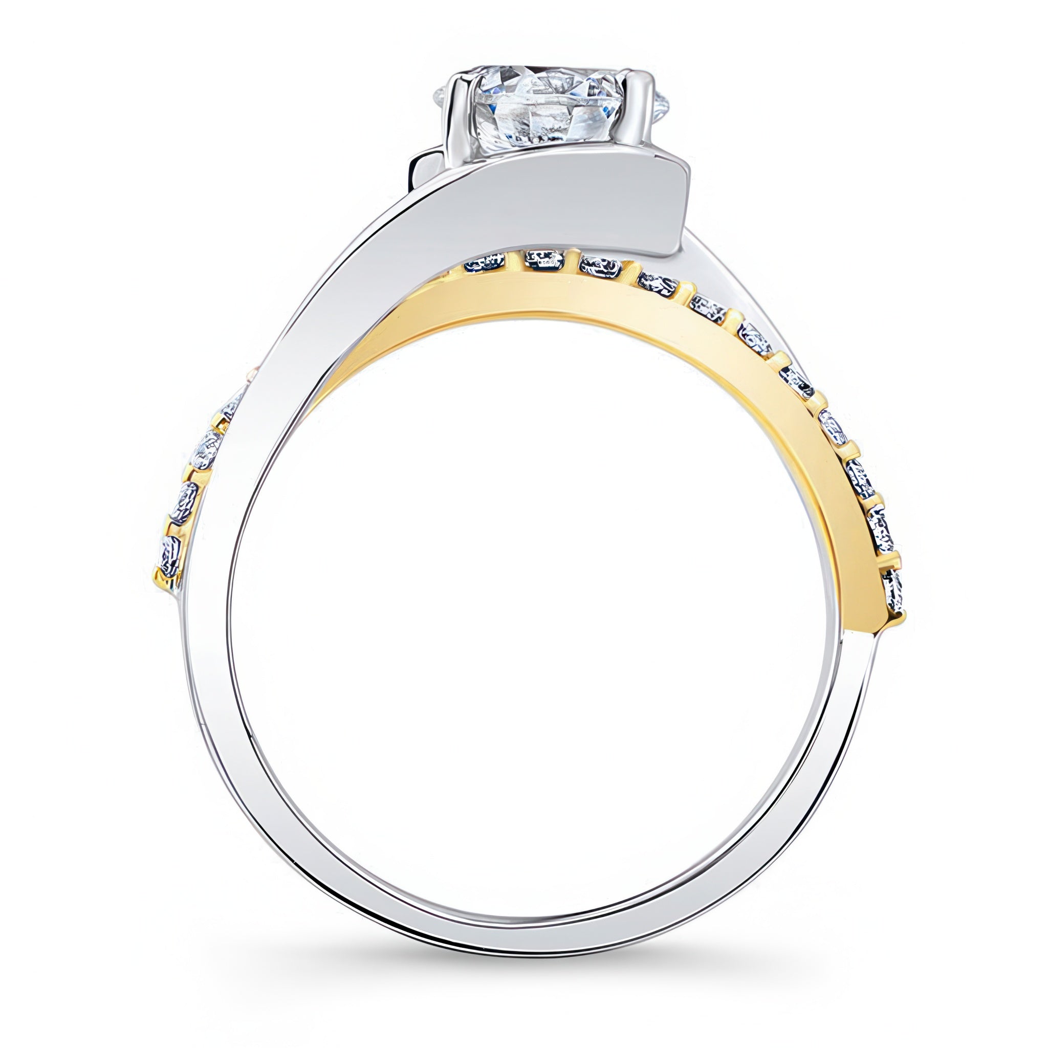 This simple 1 carat round diamond ring features a split shank that swirls to cradle the round center while a shared prong set diamond bridge crosses underneath for a dramatic fashion statement.