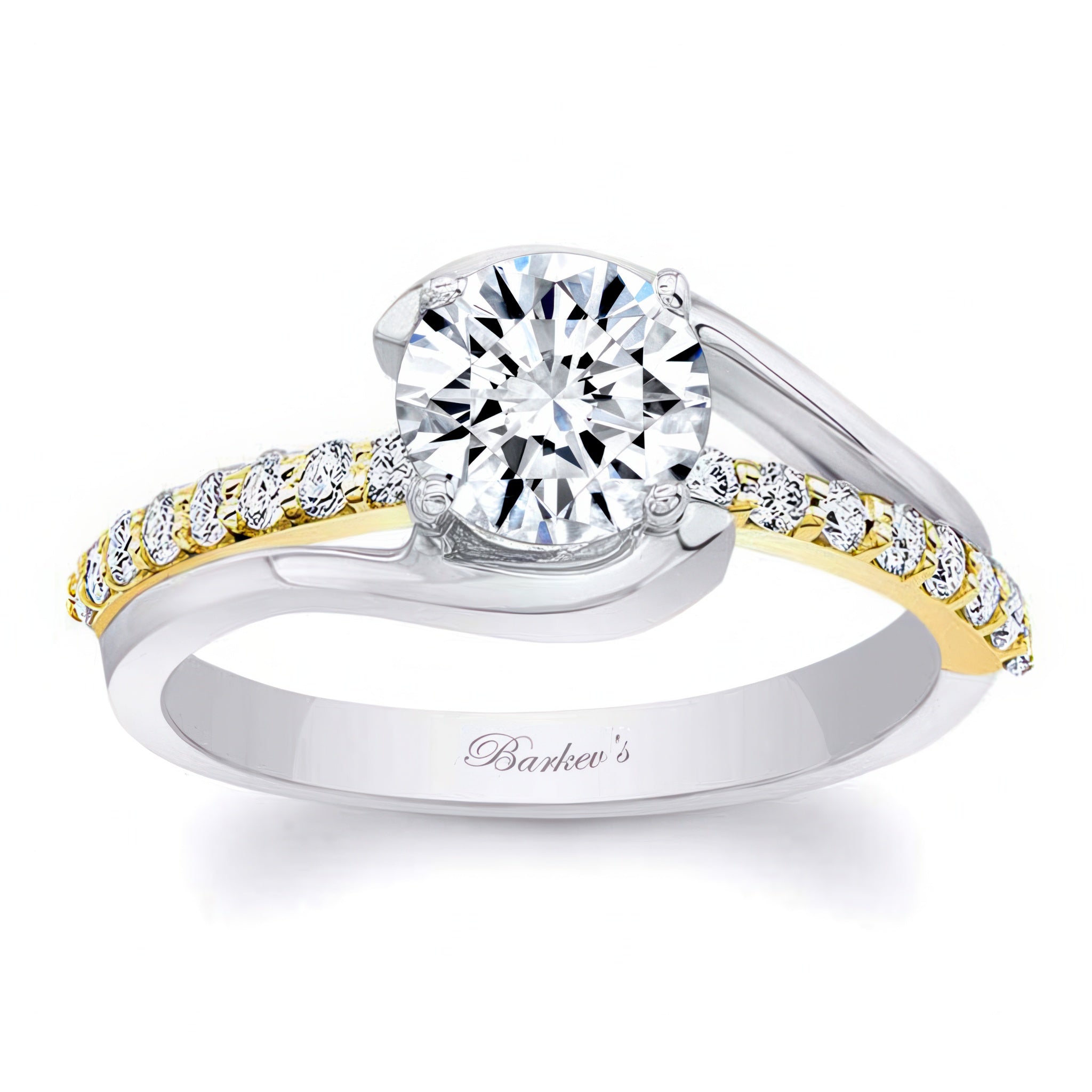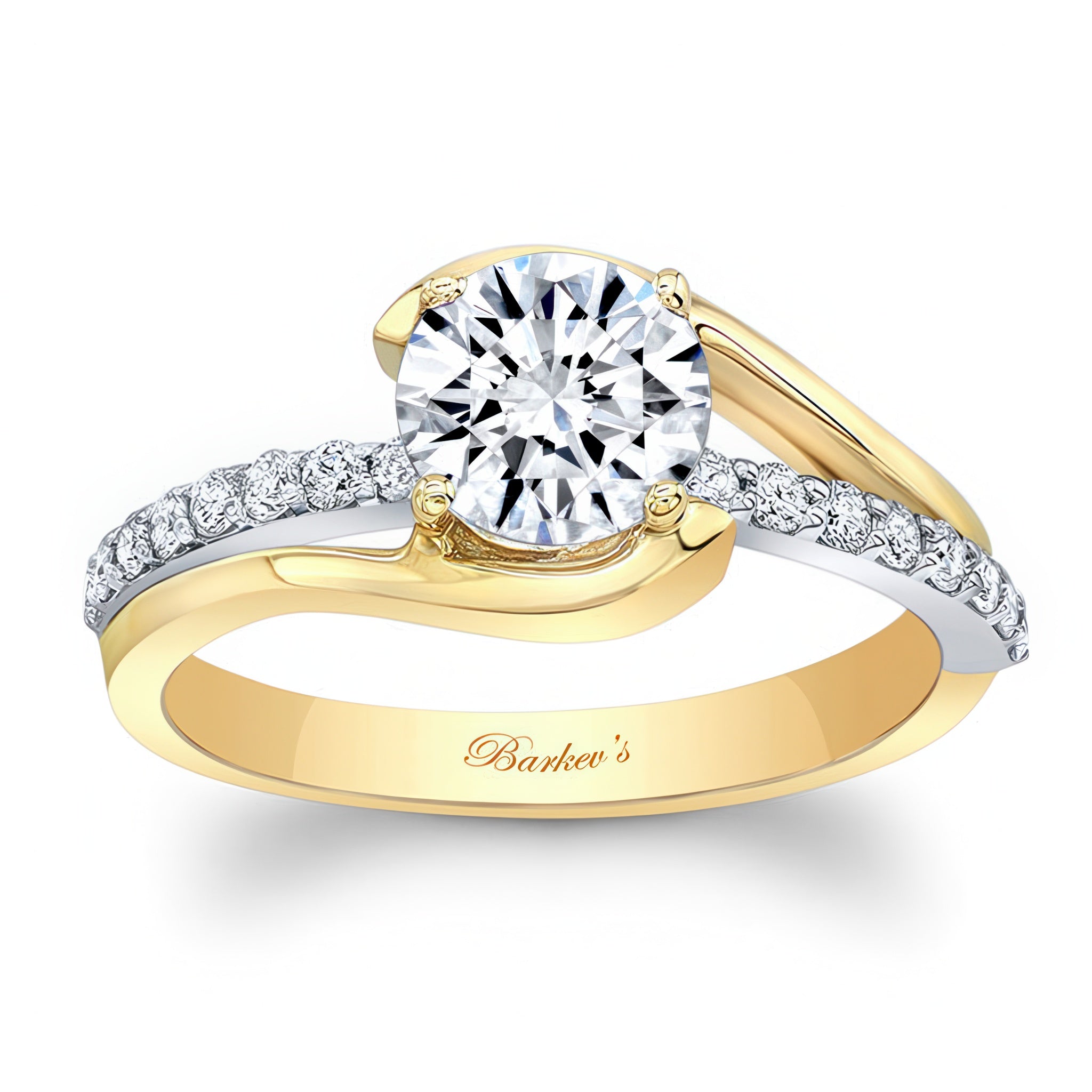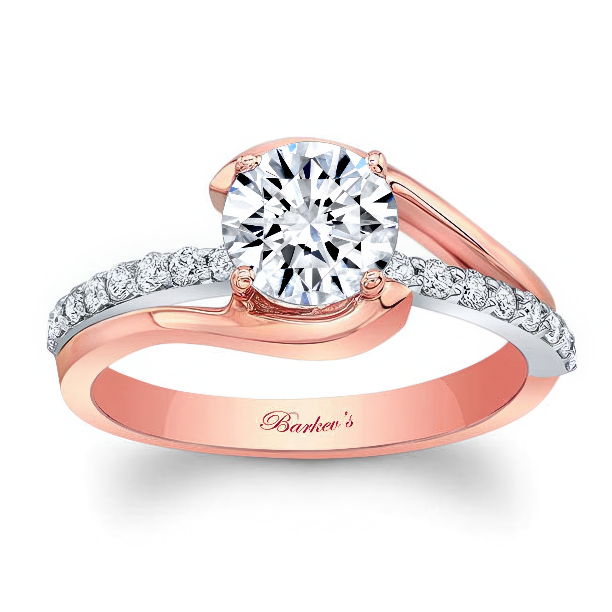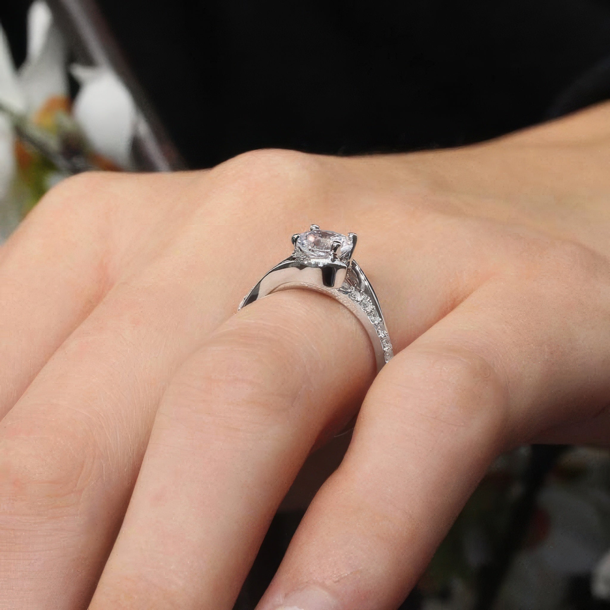 This simple 1 carat round diamond ring features a split shank that swirls to cradle the round center while a shared prong set diamond bridge crosses underneath for a dramatic fashion statement.