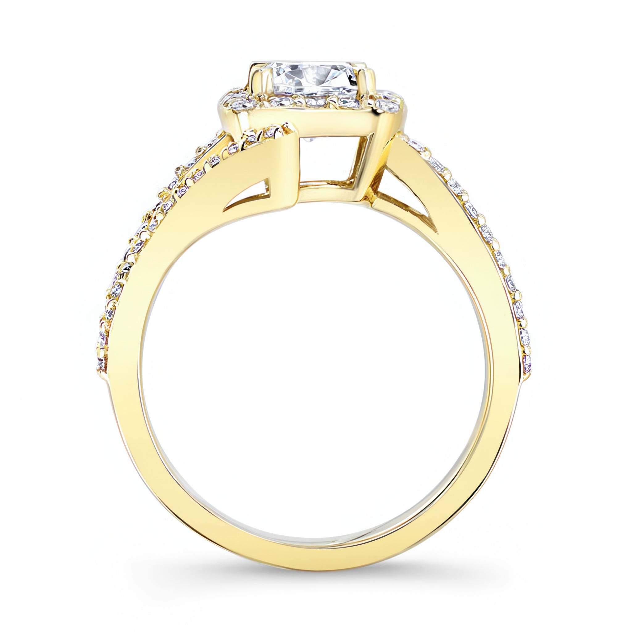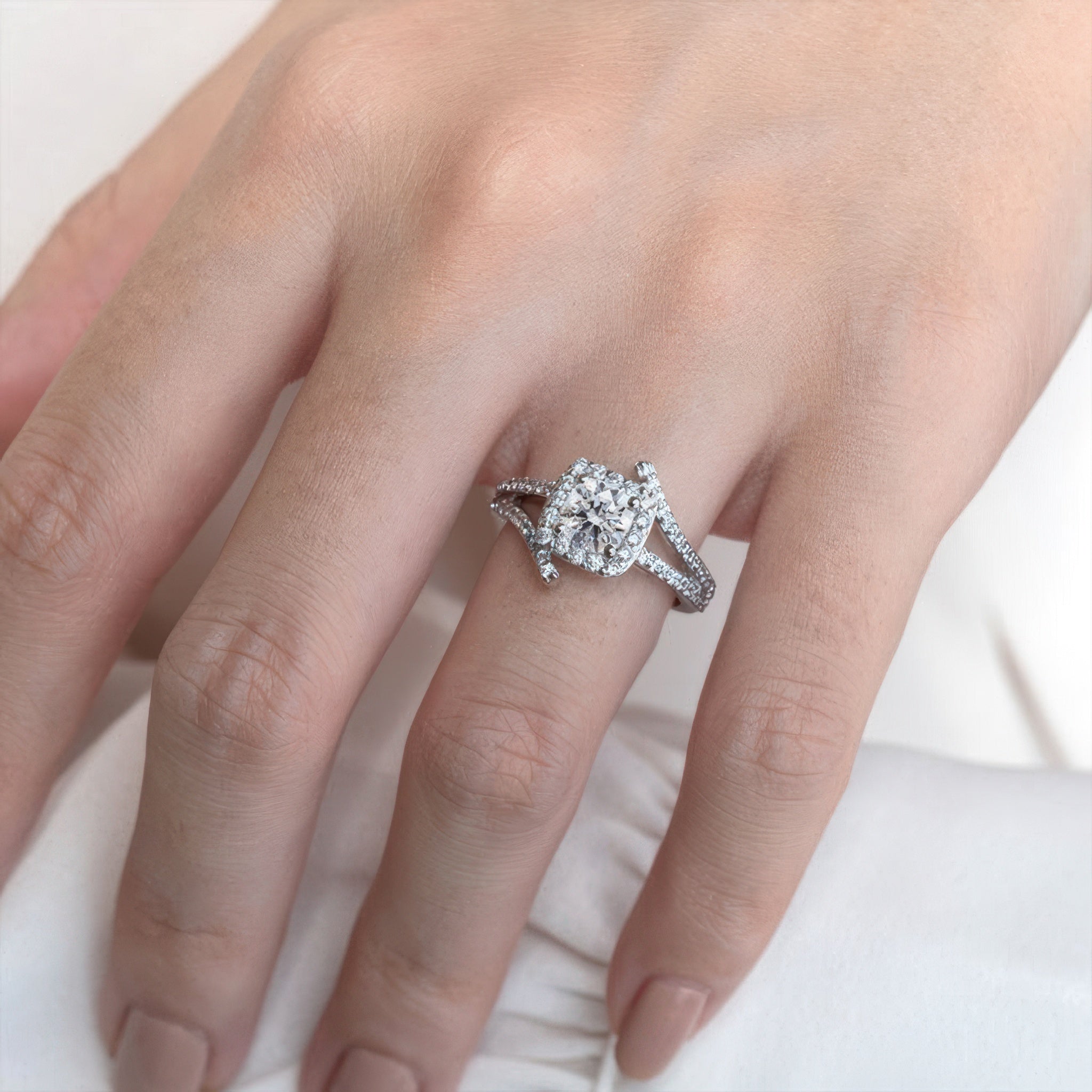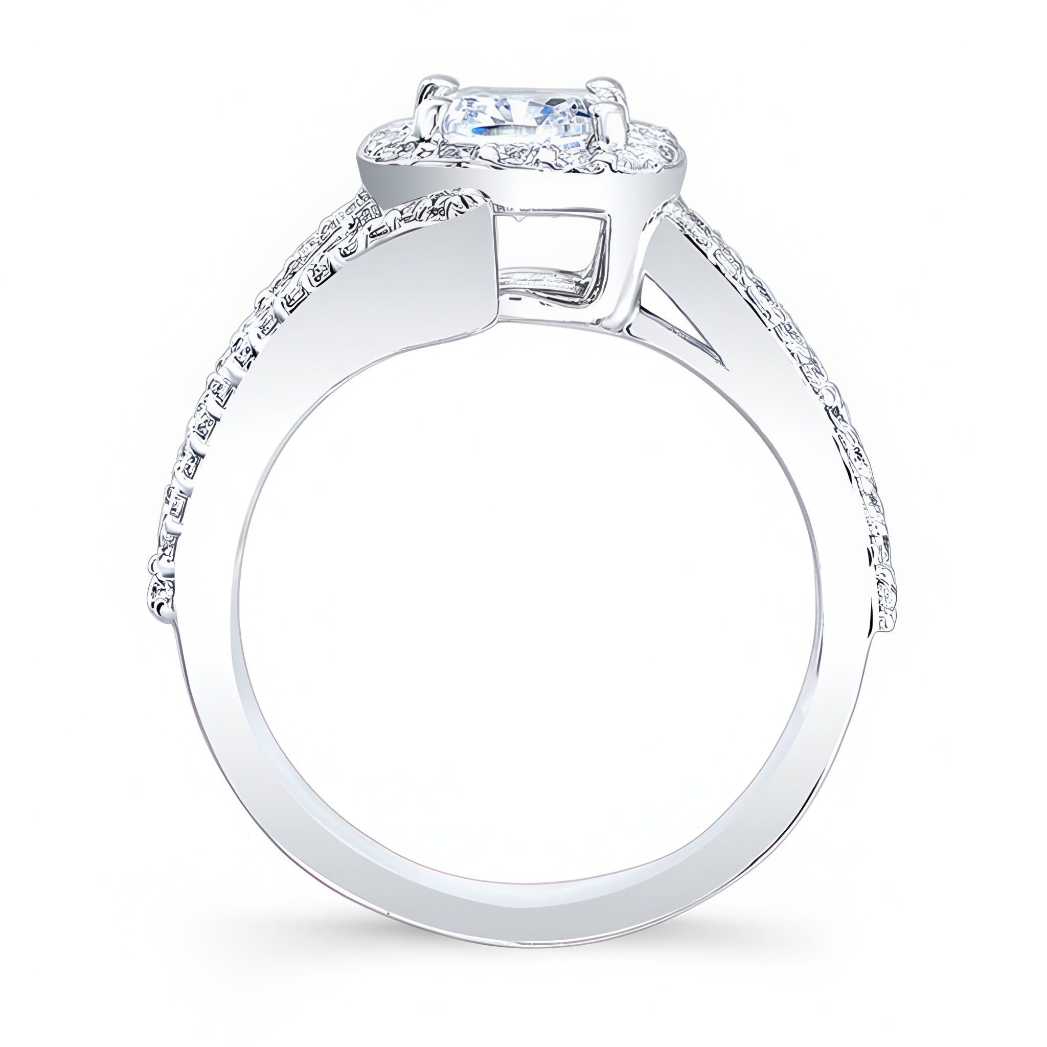 This split shank cushion cut halo ring features a prong set cushion center with a diamond halo and a split shank adorned with shared prong set diamonds for a touch of sophistication.