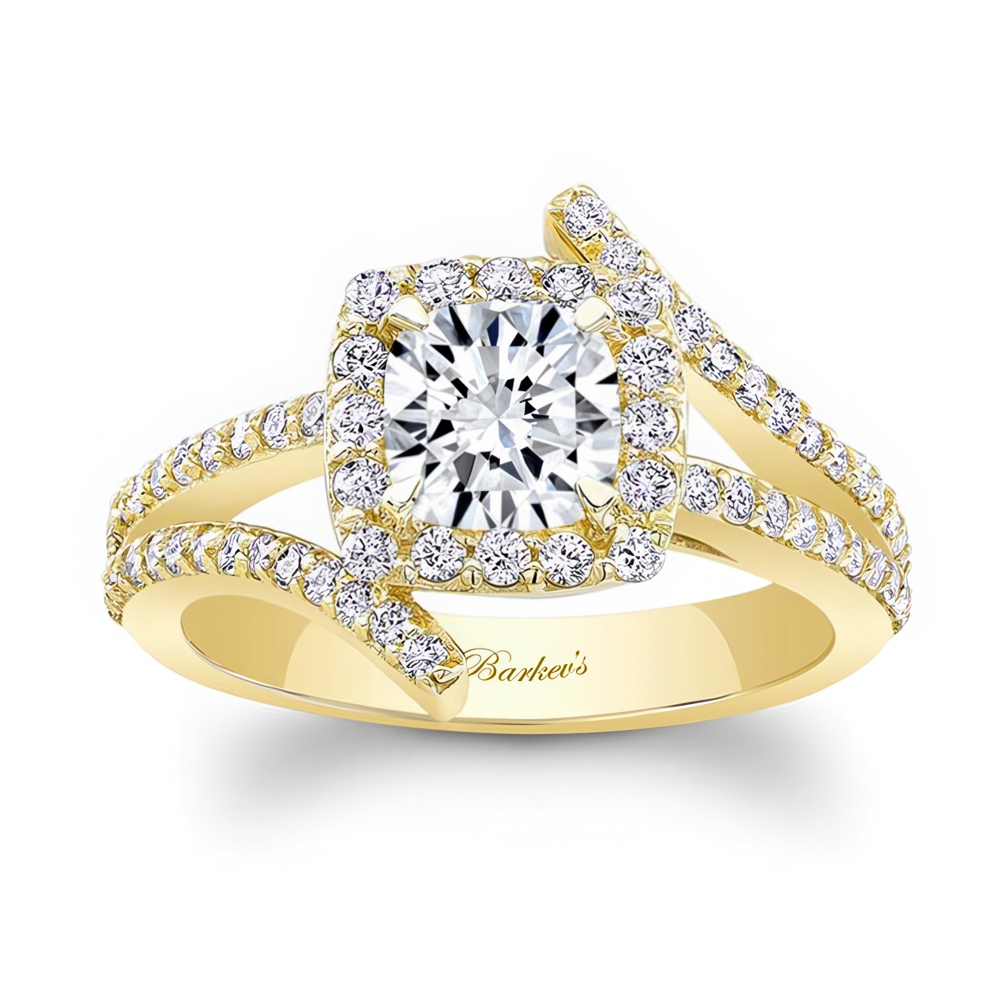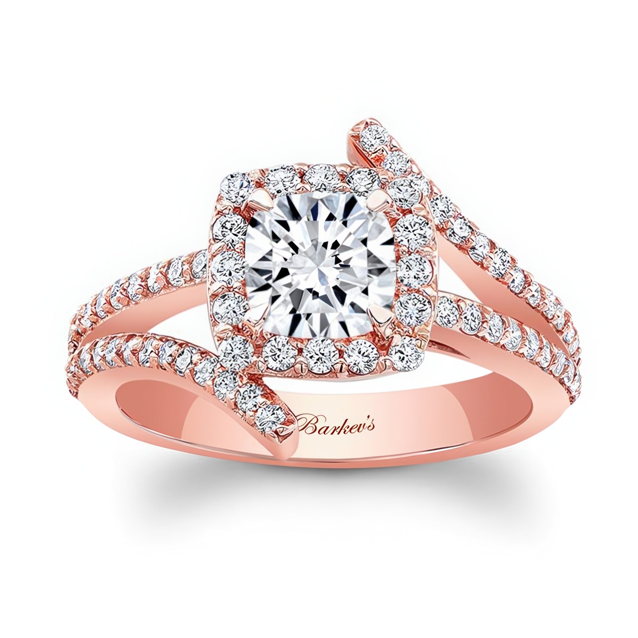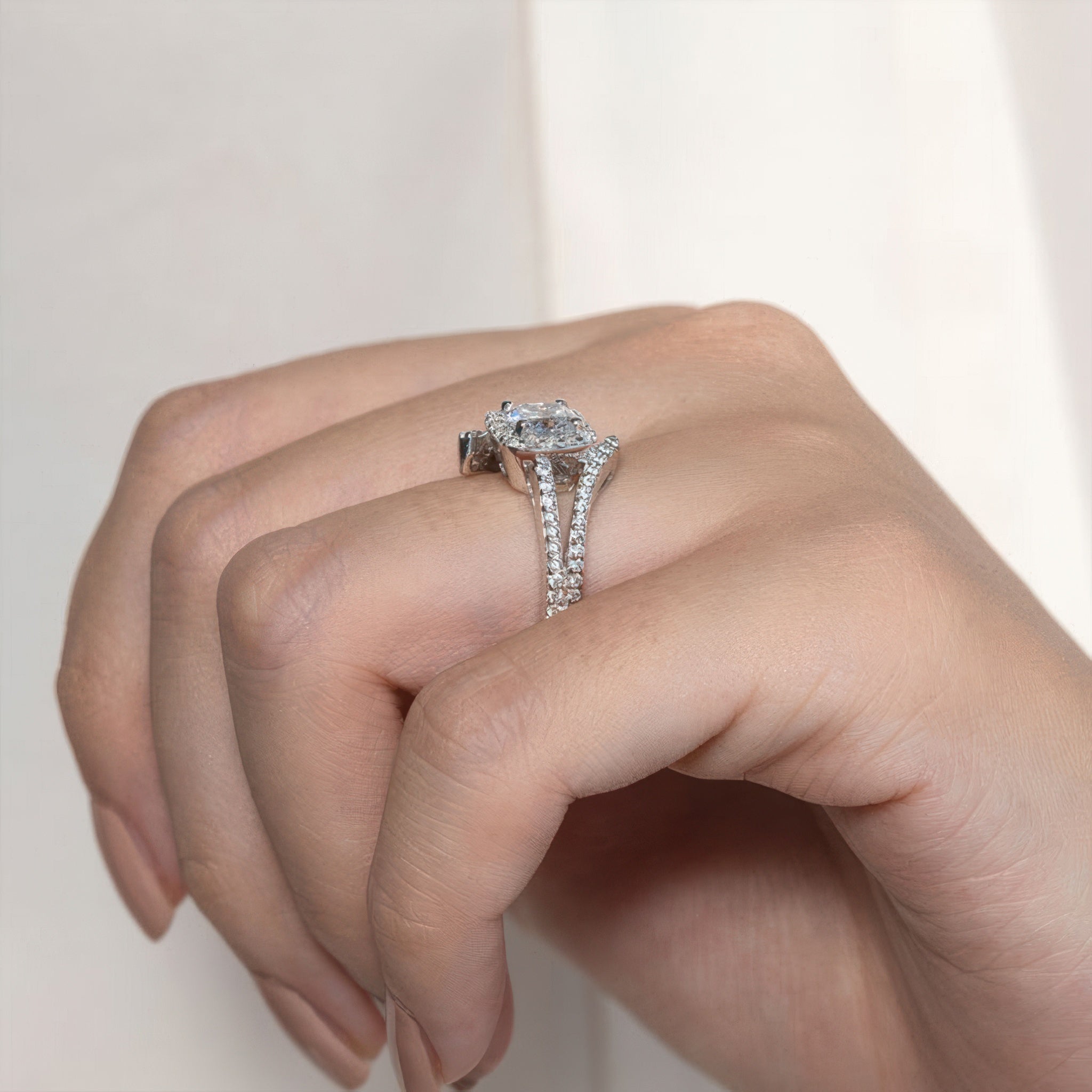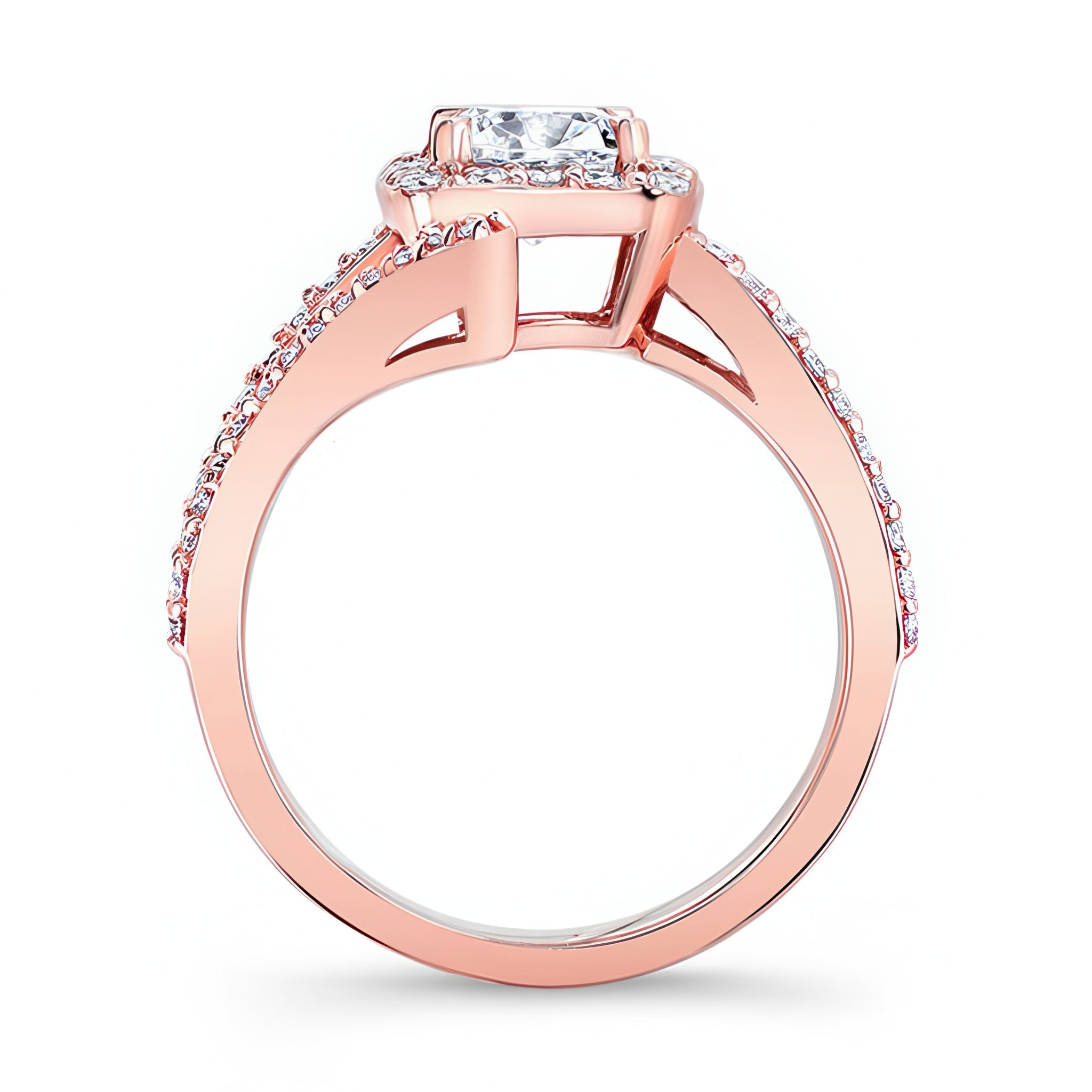 This split shank cushion cut halo ring features a prong set cushion center with a diamond halo and a split shank adorned with shared prong set diamonds for a touch of sophistication.