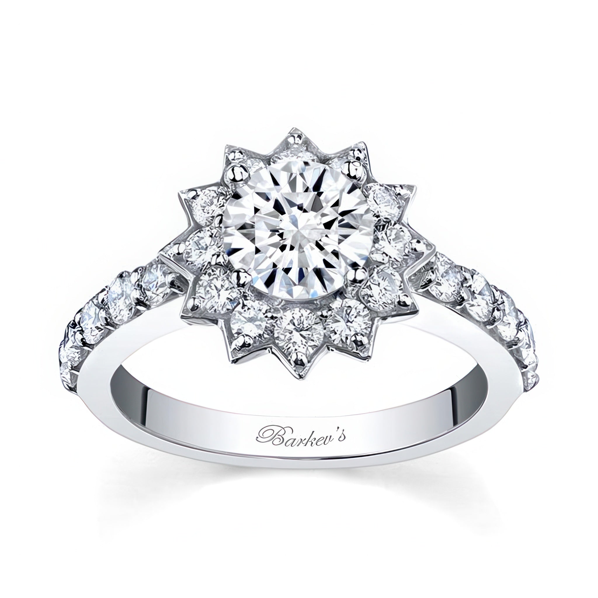 This starnish halo engagement ring features our exclusive star design with a prong set round center encircled in a starburst halo of diamonds and shared prong set diamonds flowing down the shoulders for a finishing touch of elegance.