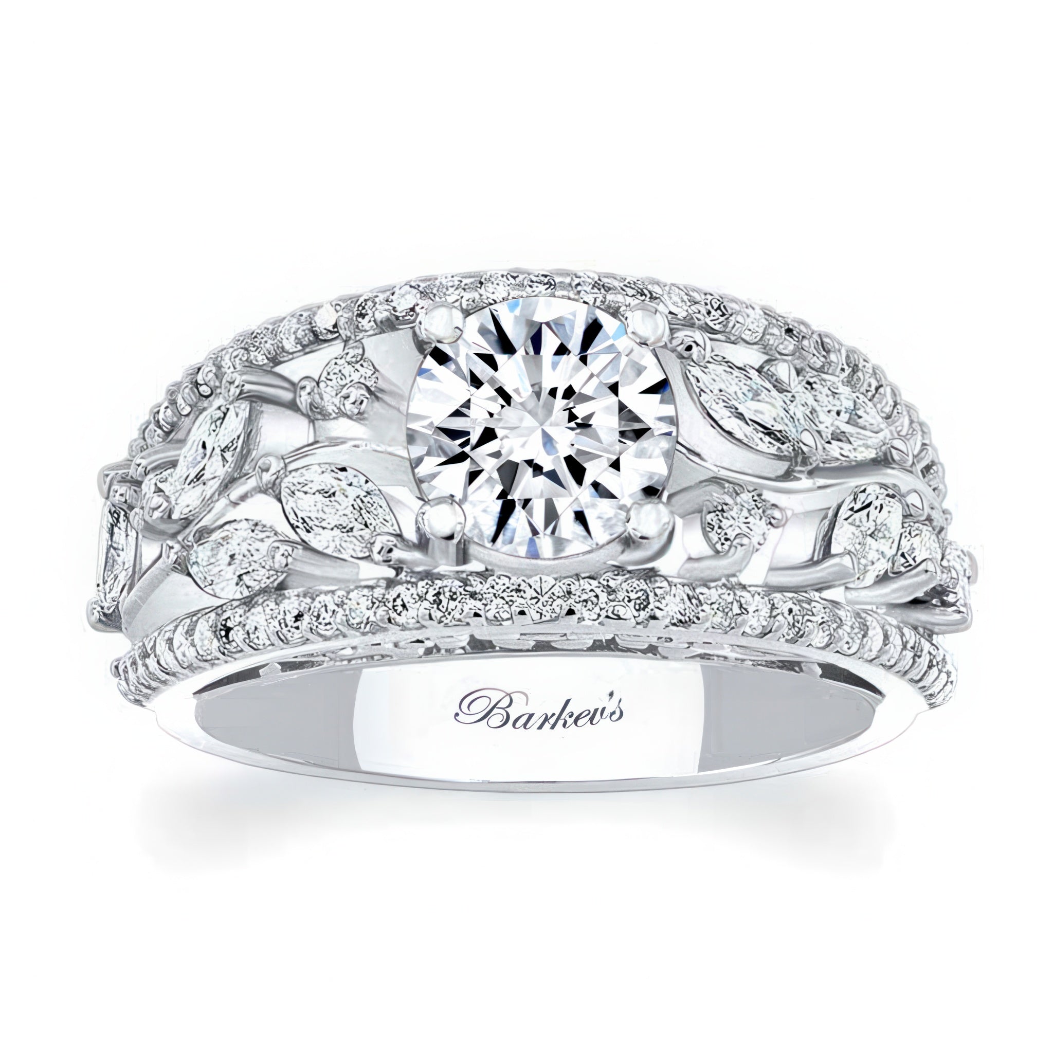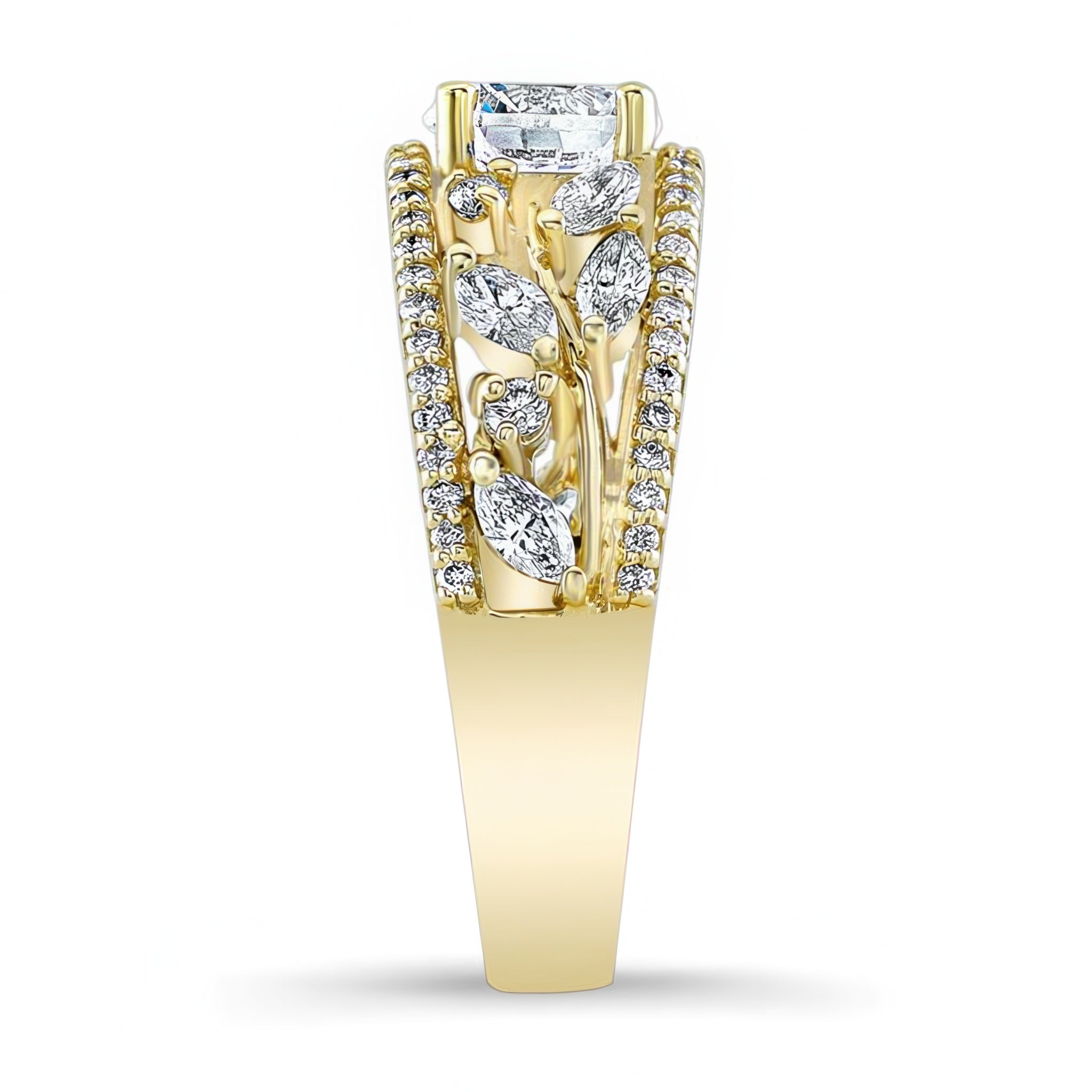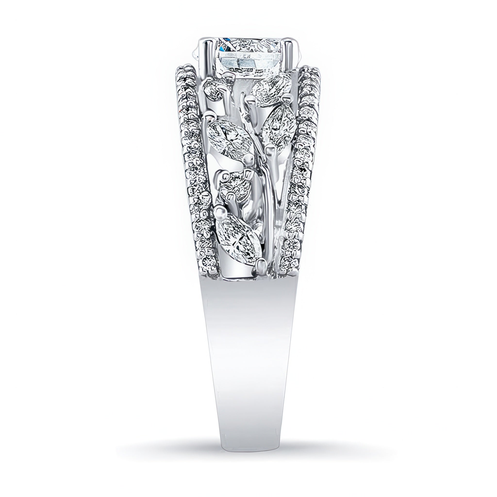 This vine ring features a prong set round center embellished on the shoulders with a leaf and vine design with marquise cut diamonds and a ridge of shared prong set diamonds frame the artful shoulders for an elegant touch of glamour.