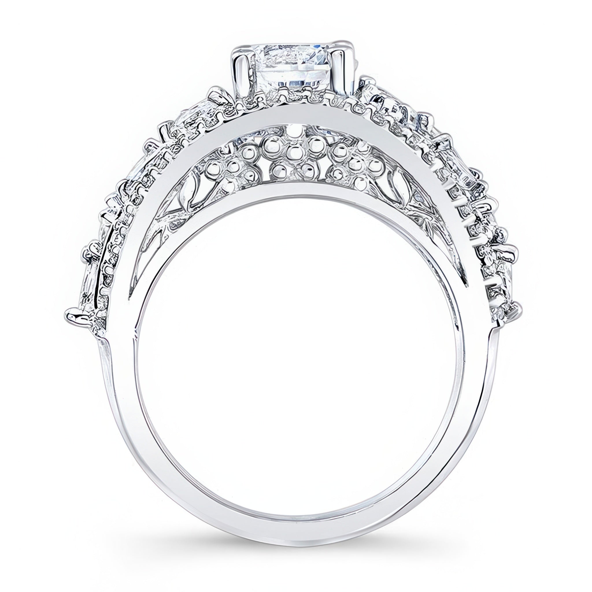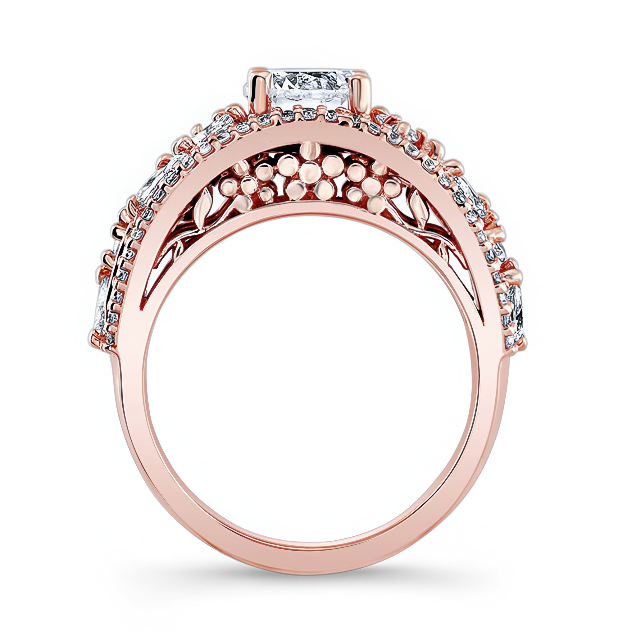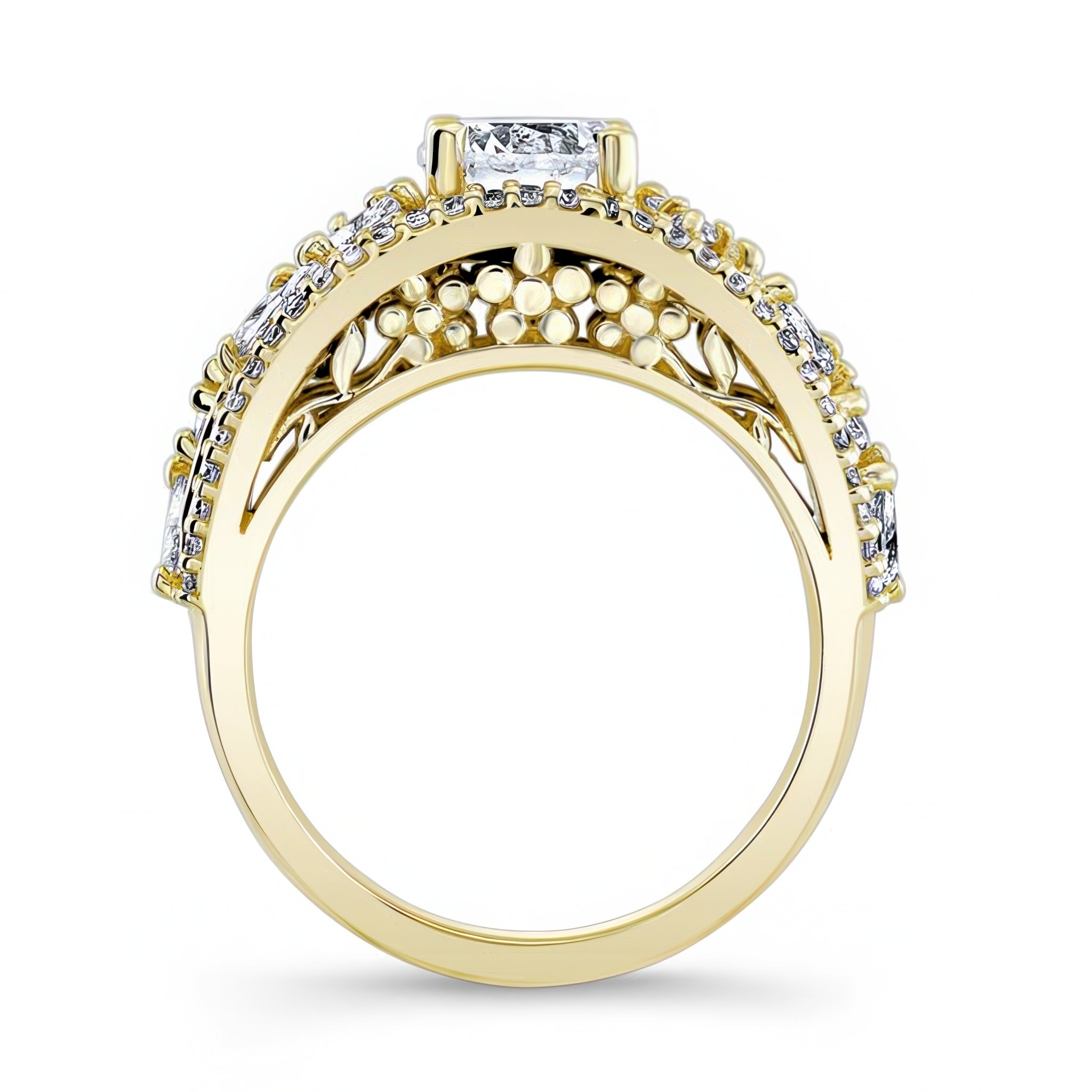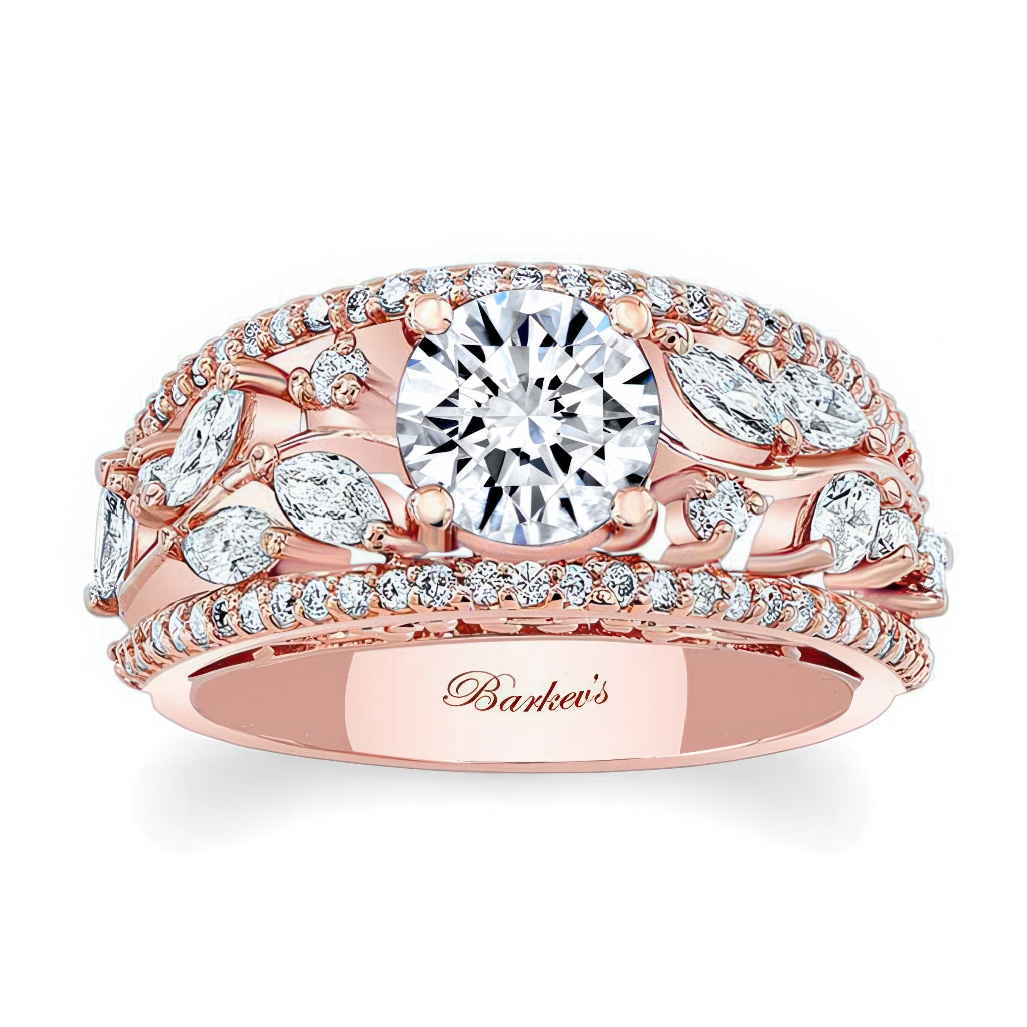 This vine ring features a prong set round center embellished on the shoulders with a leaf and vine design with marquise cut diamonds and a ridge of shared prong set diamonds frame the artful shoulders for an elegant touch of glamour.