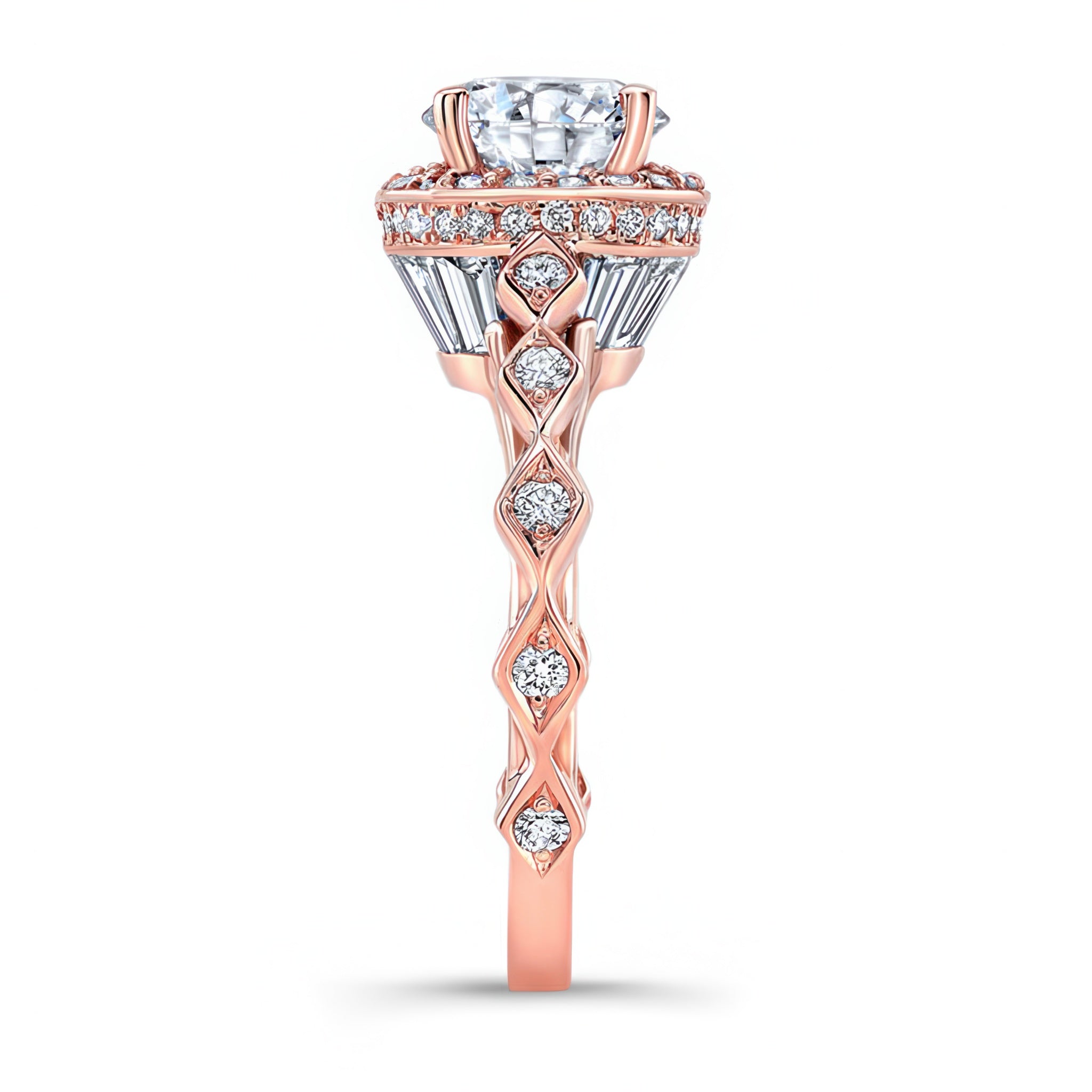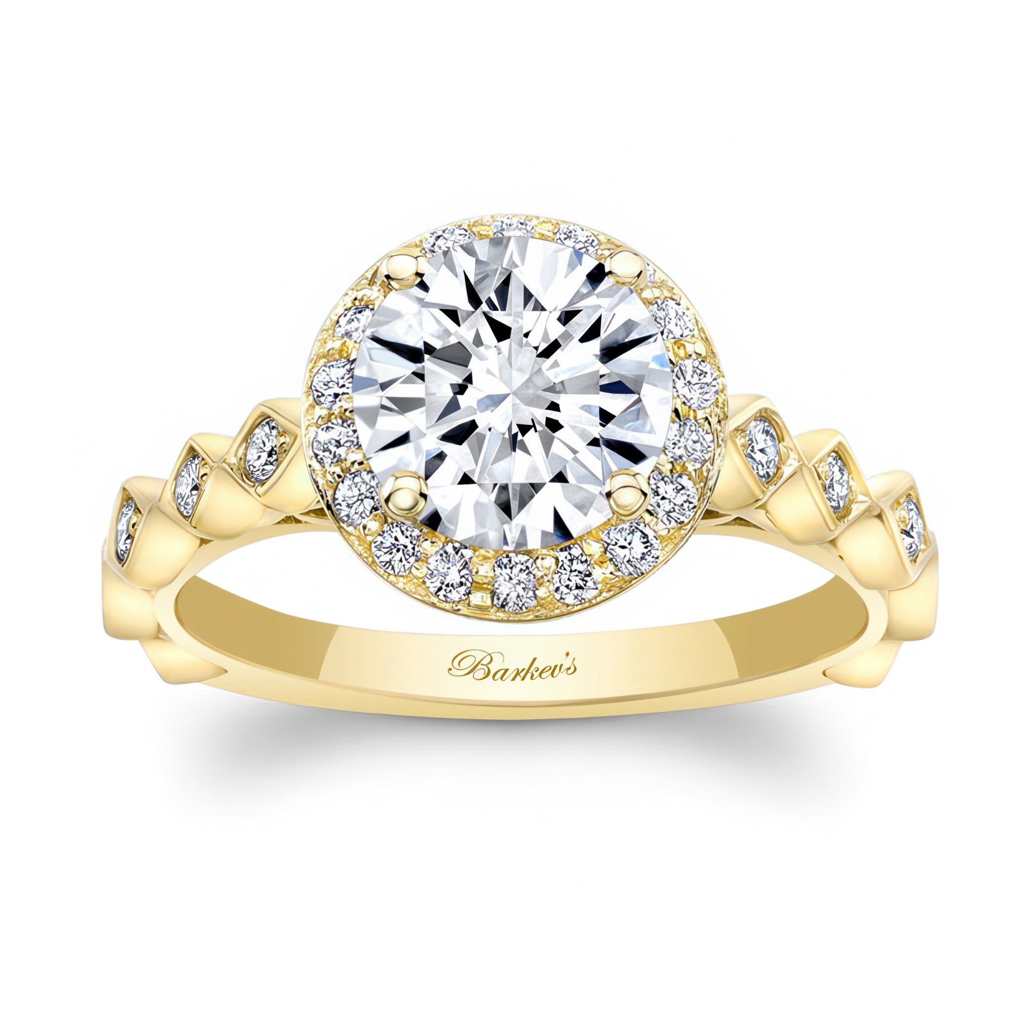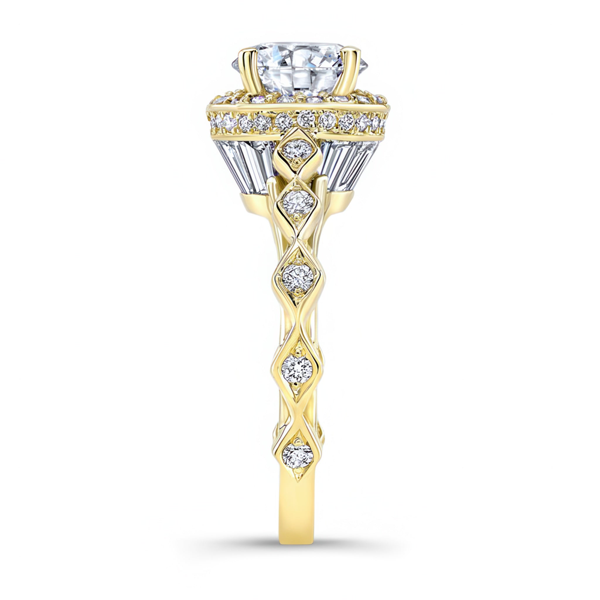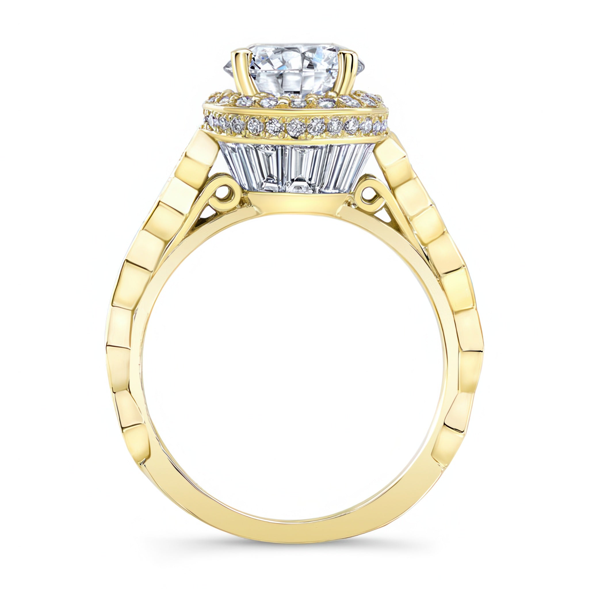 This vintage halo engagement ring truly sparkles from every angle. The round prong set center is framed by micro pave set diamonds on top, and channel set baguette diamonds from the side. The ring is further embellished with shared prong set melees that grace down the cathedral shank.
