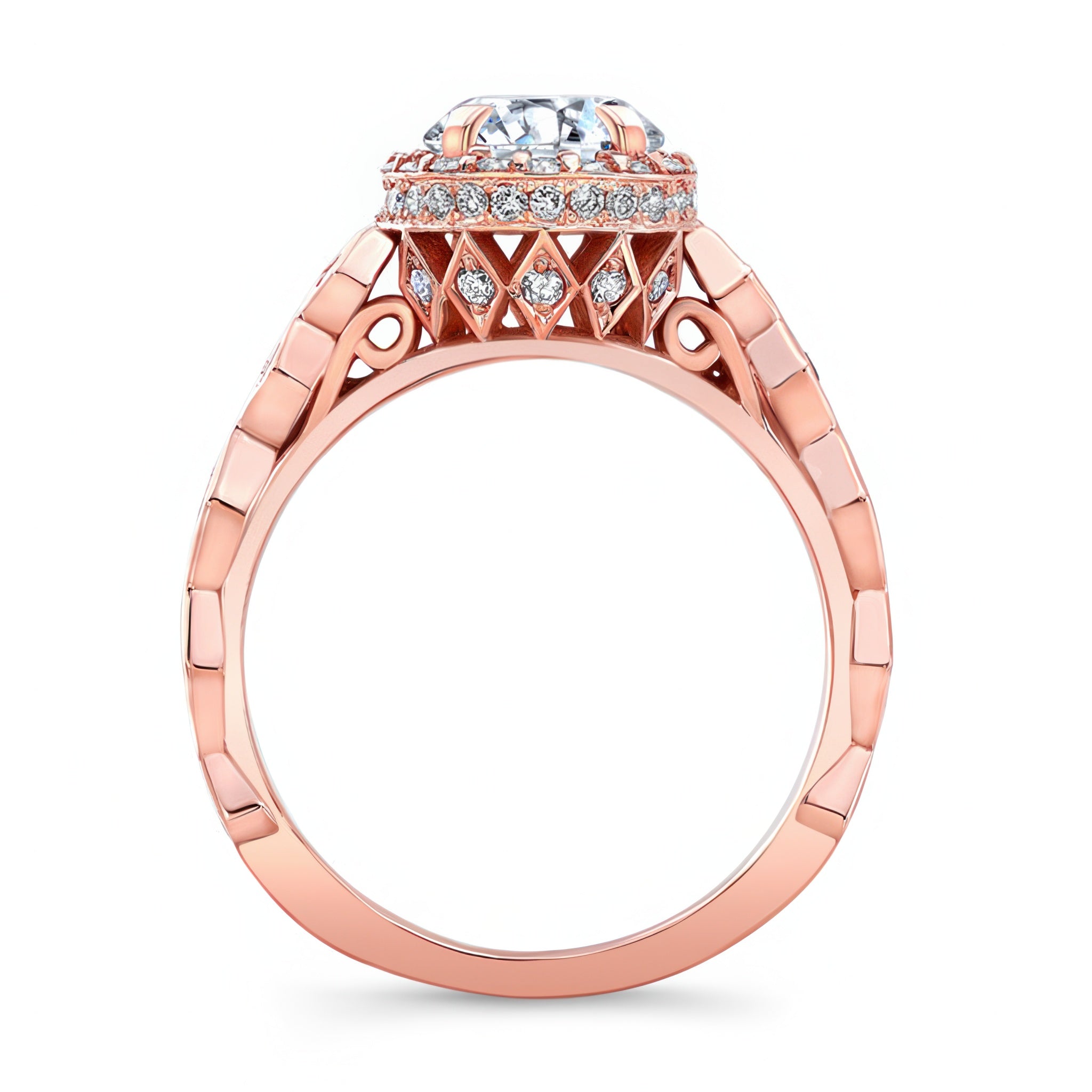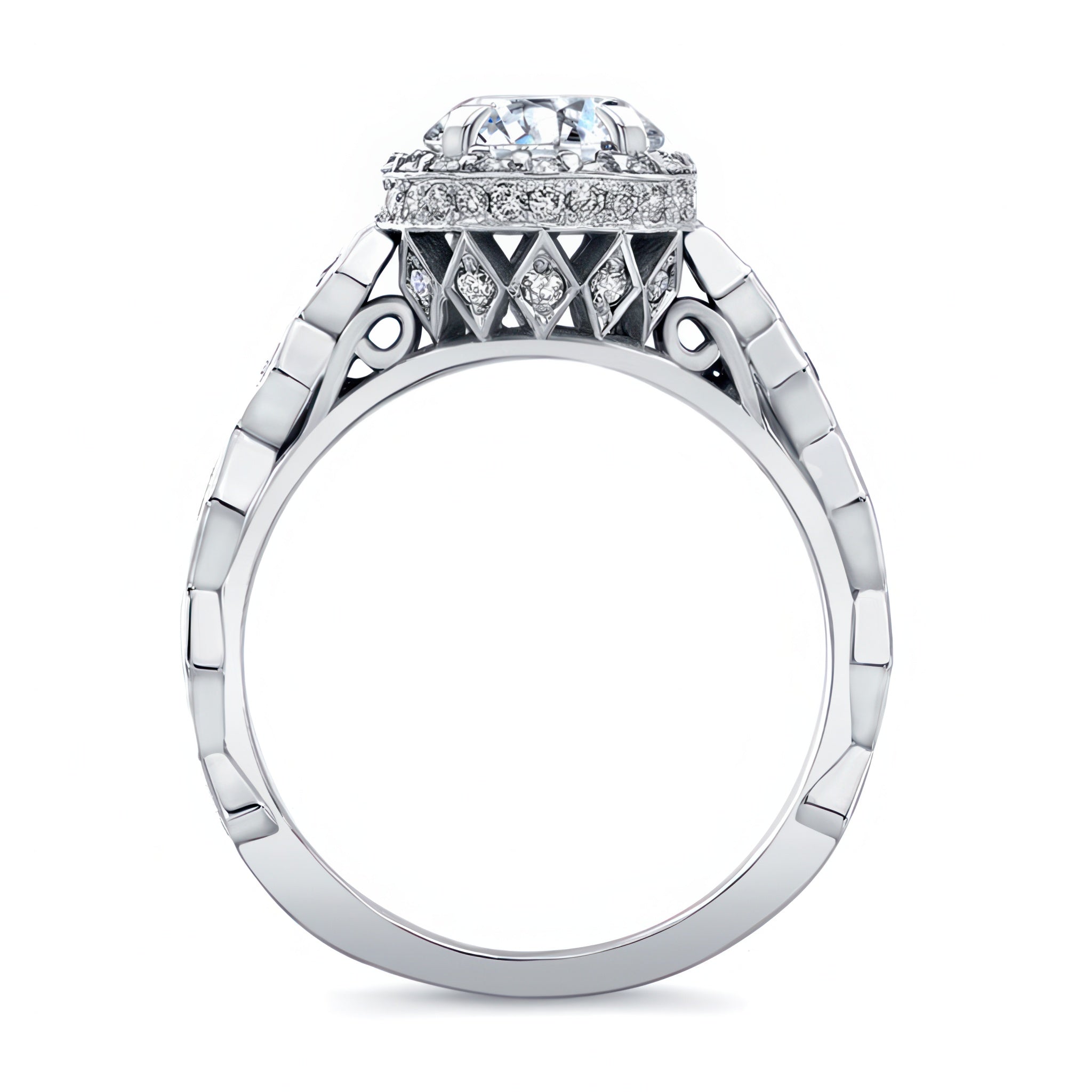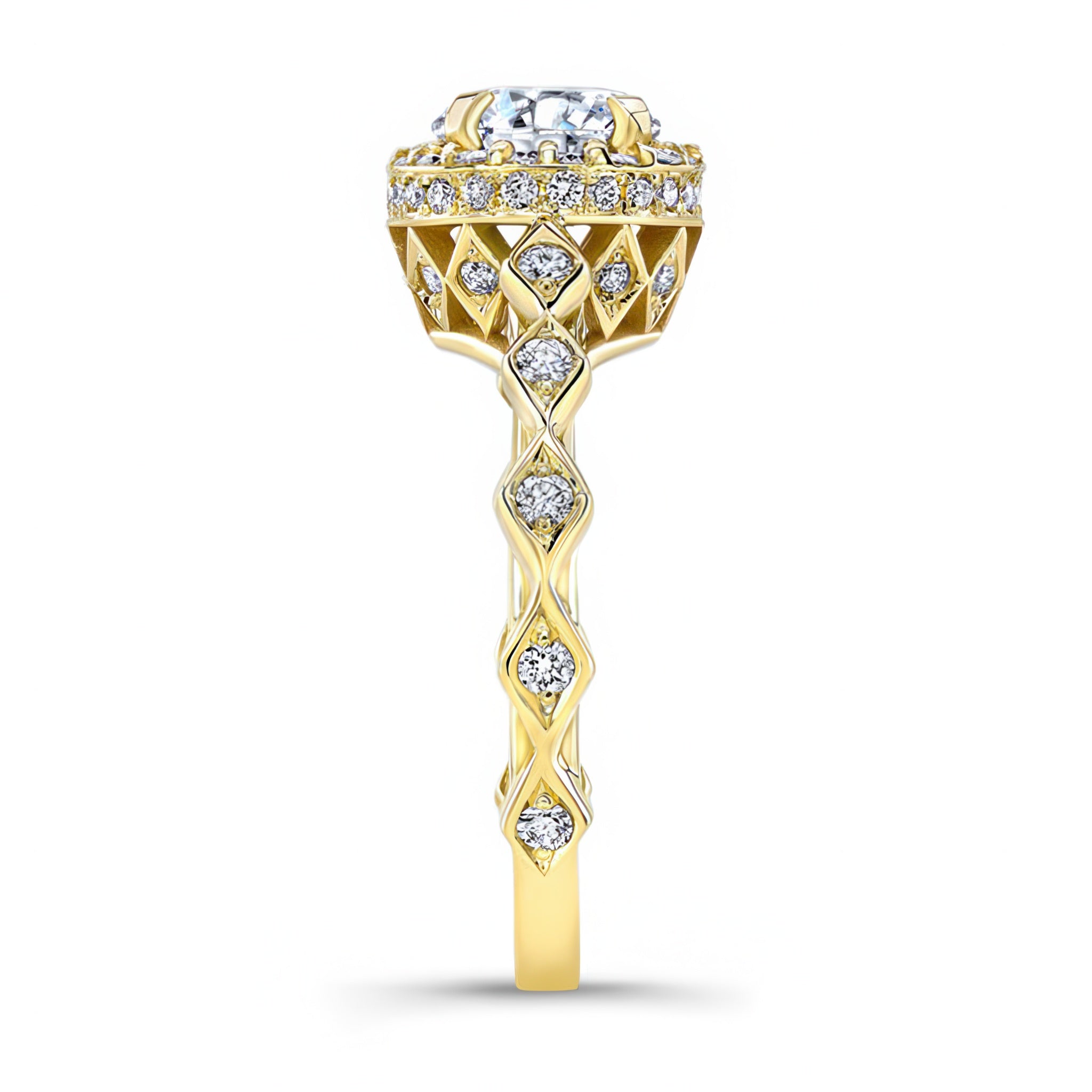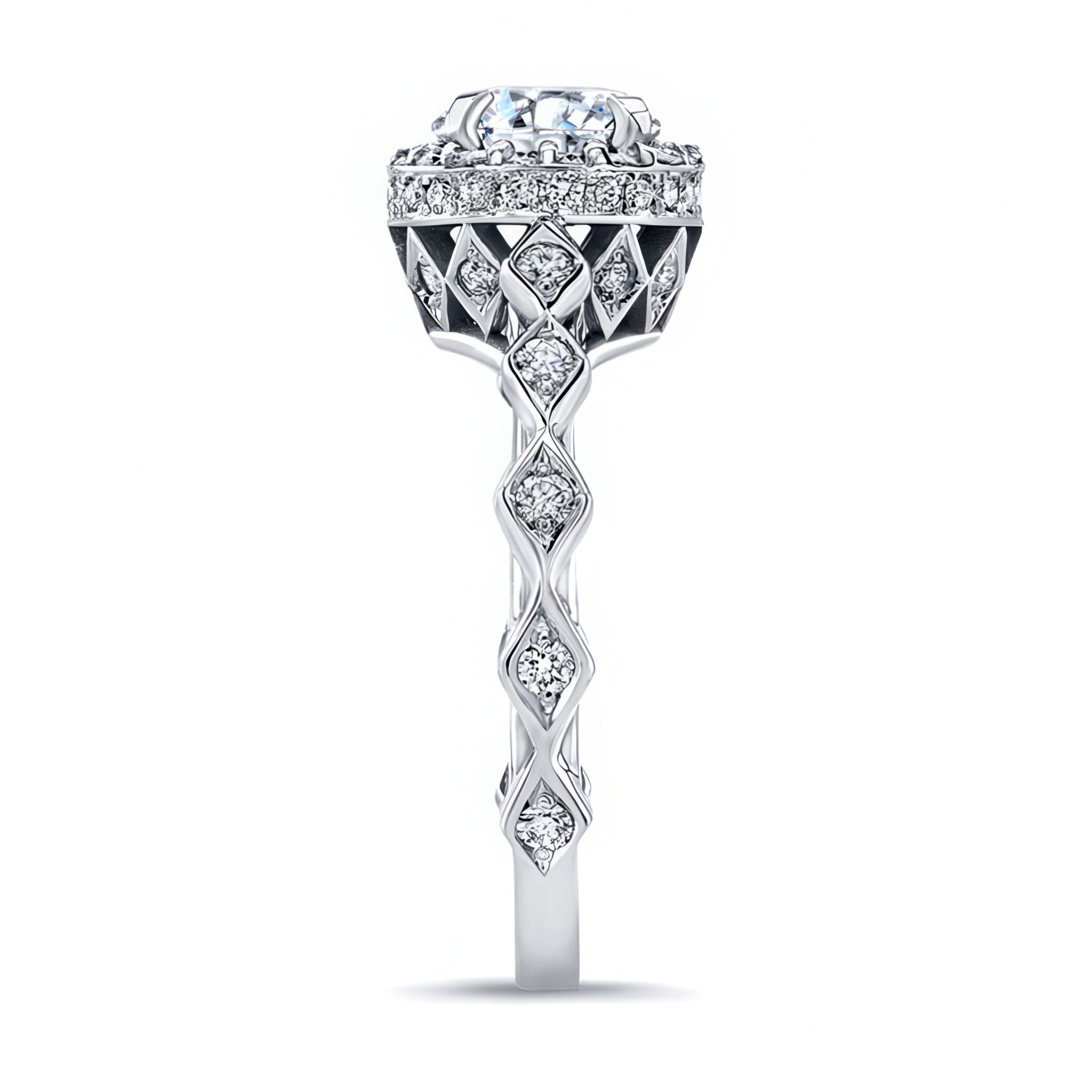 A vintage halo ring featuring a prong set round center with a pave set diamond halo and a shank adorned with diamonds set in marquise shaped frames that add graceful sparkle to this brilliant ring.