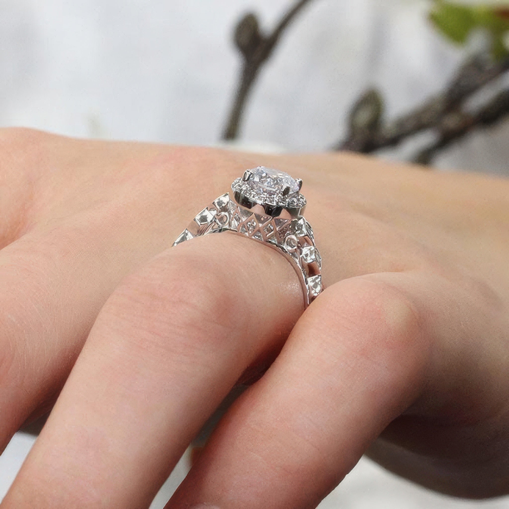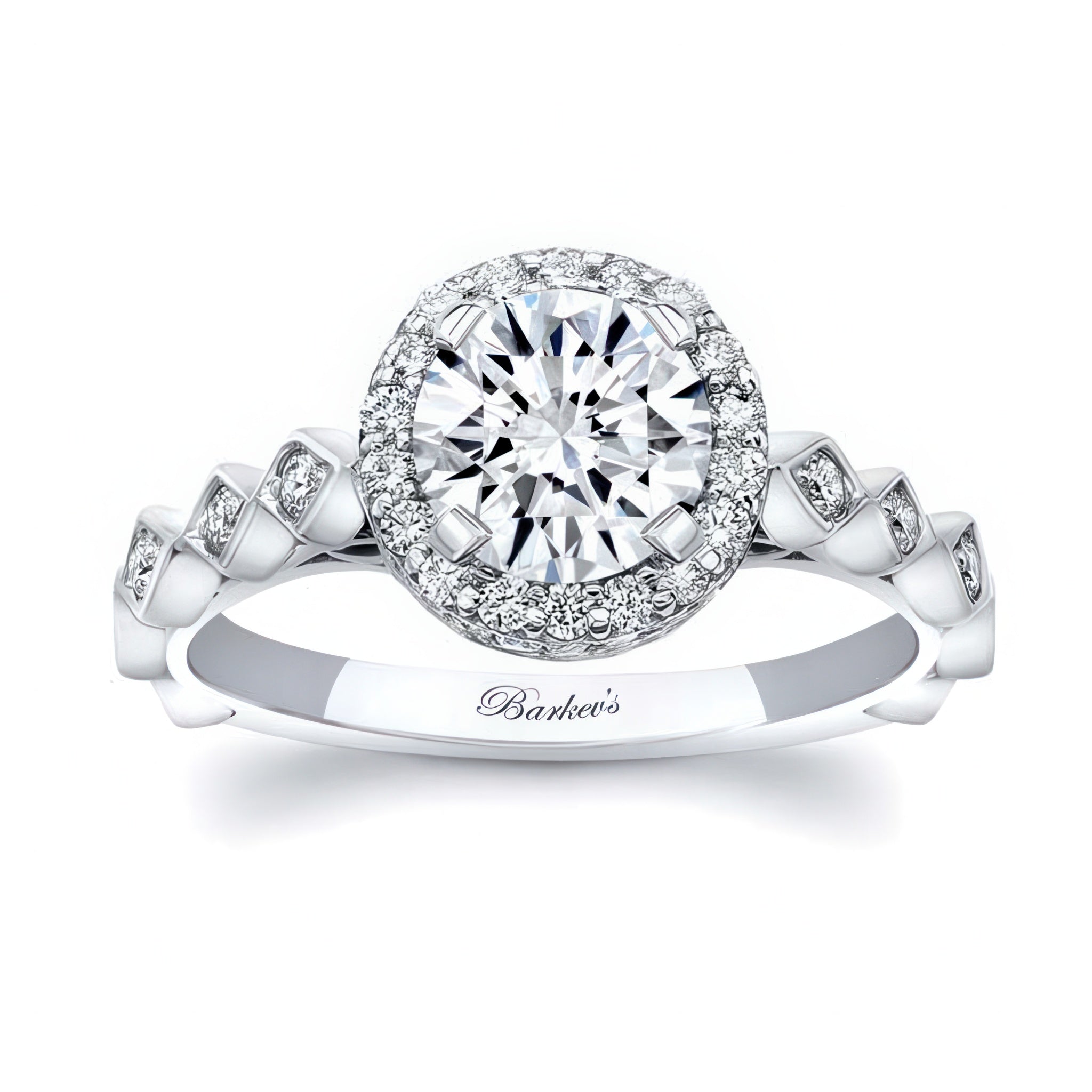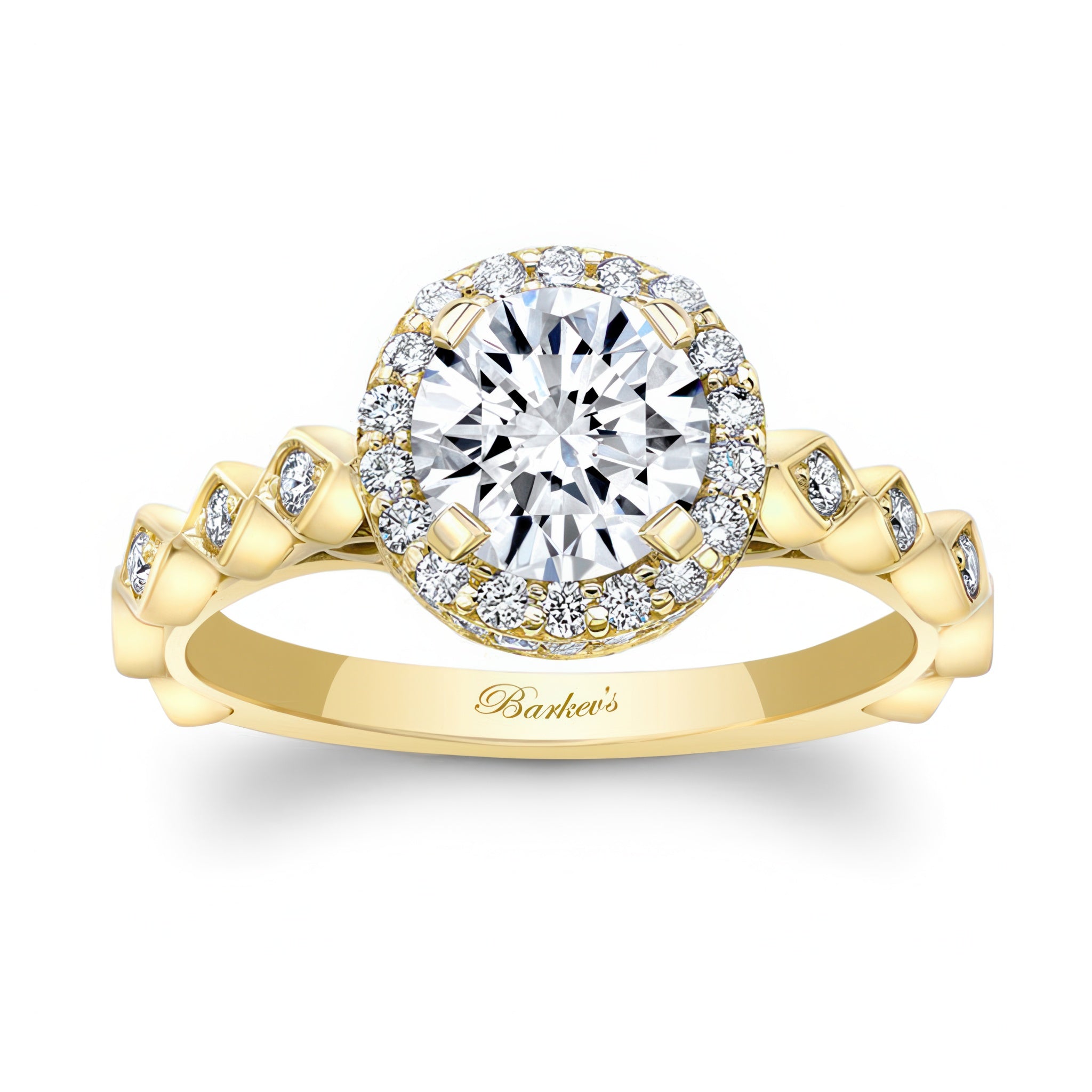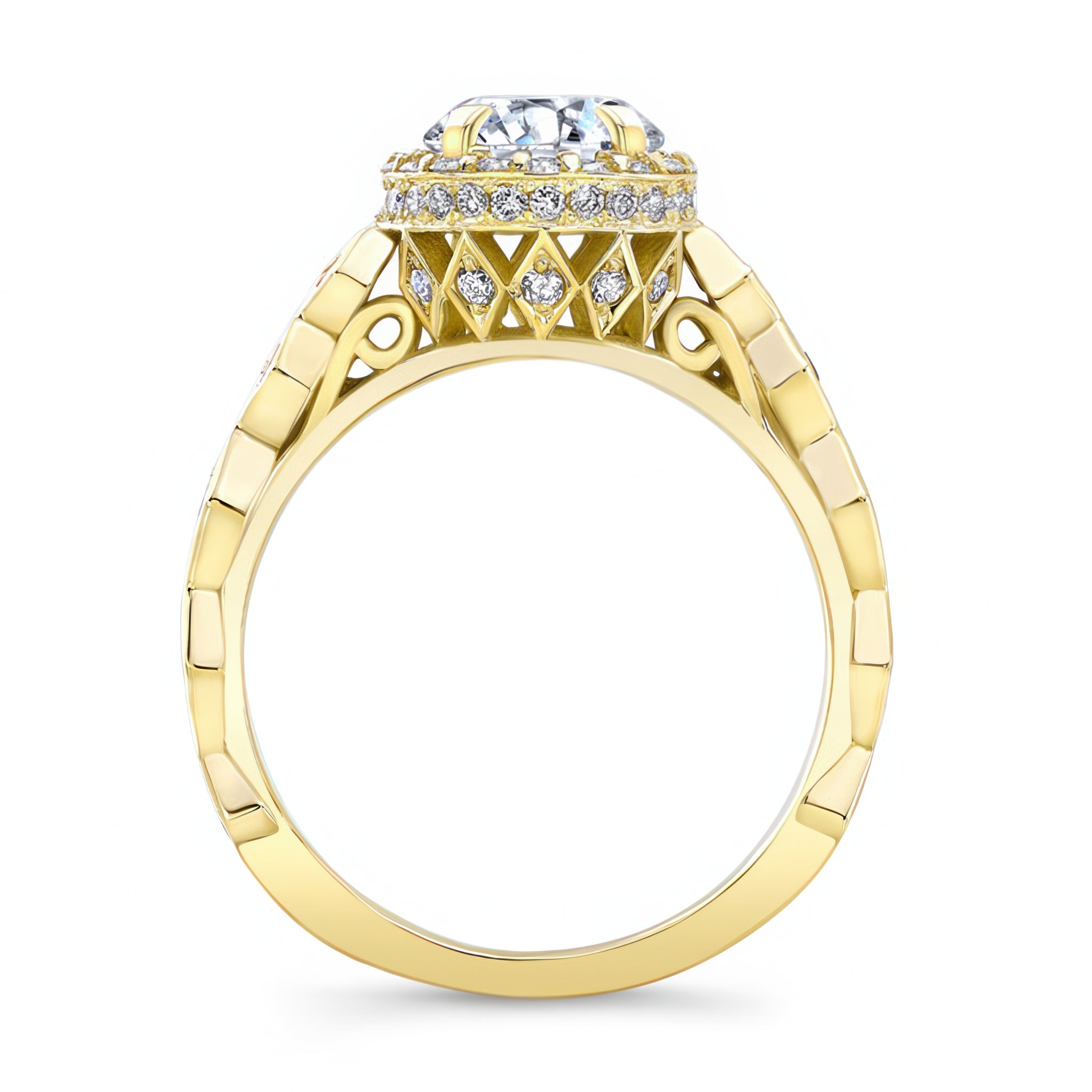A vintage halo ring featuring a prong set round center with a pave set diamond halo and a shank adorned with diamonds set in marquise shaped frames that add graceful sparkle to this brilliant ring.