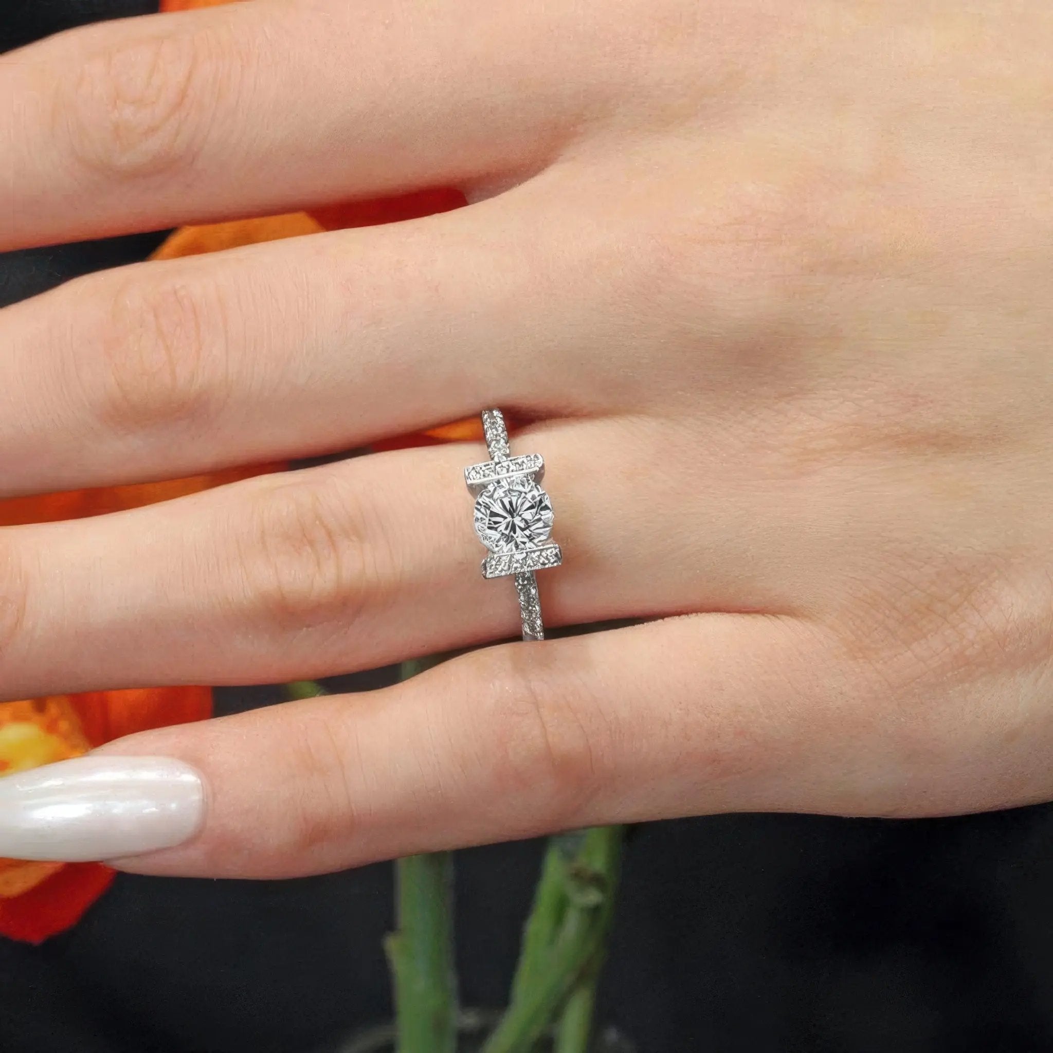 A vintage pave diamond ring sporting a channel set round center with pave set diamonds gracing the top and side walls and more diamonds cascading down the shank adding a touch of drama.