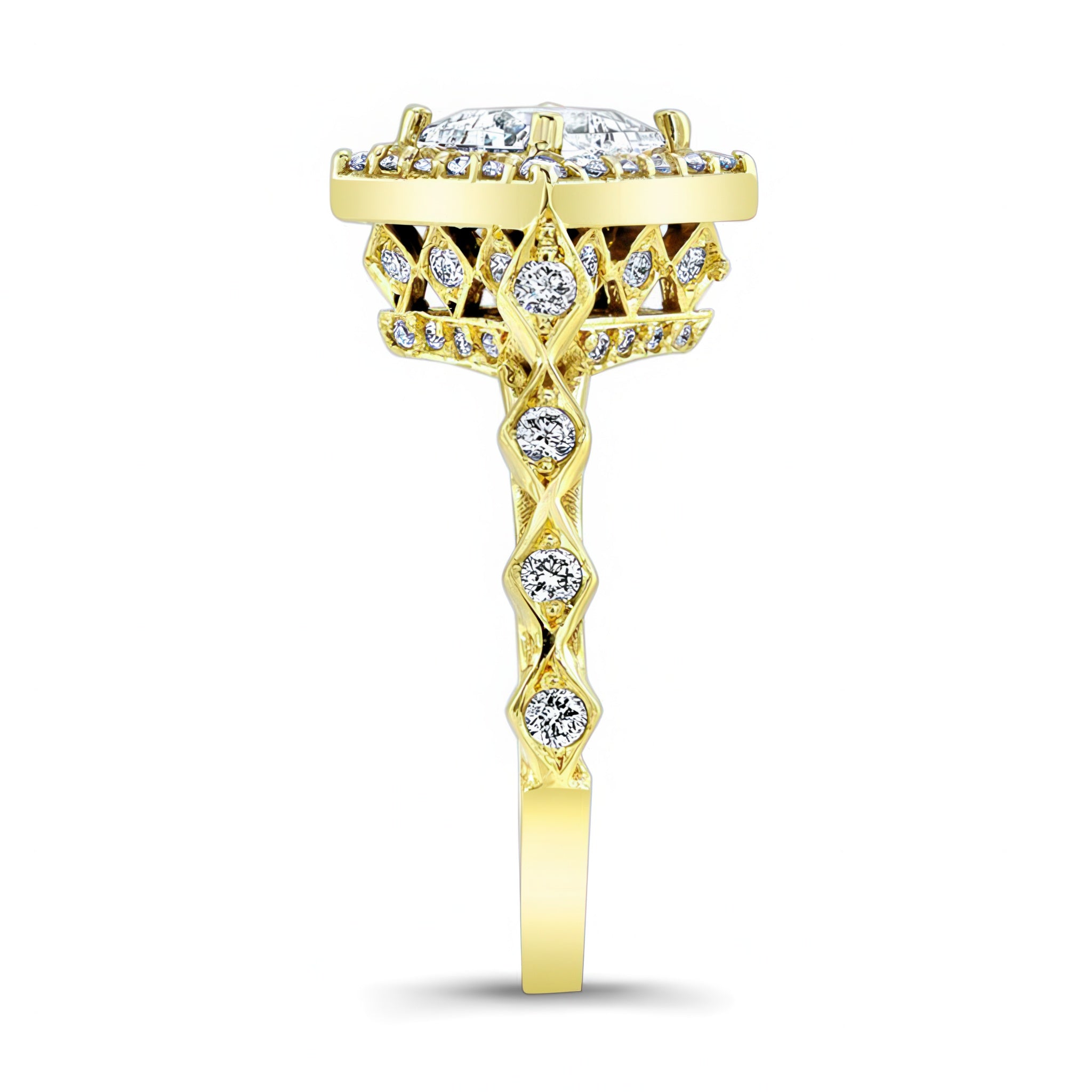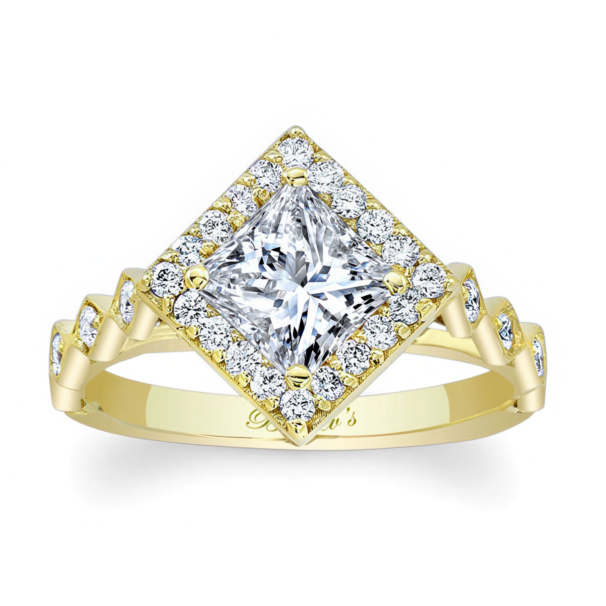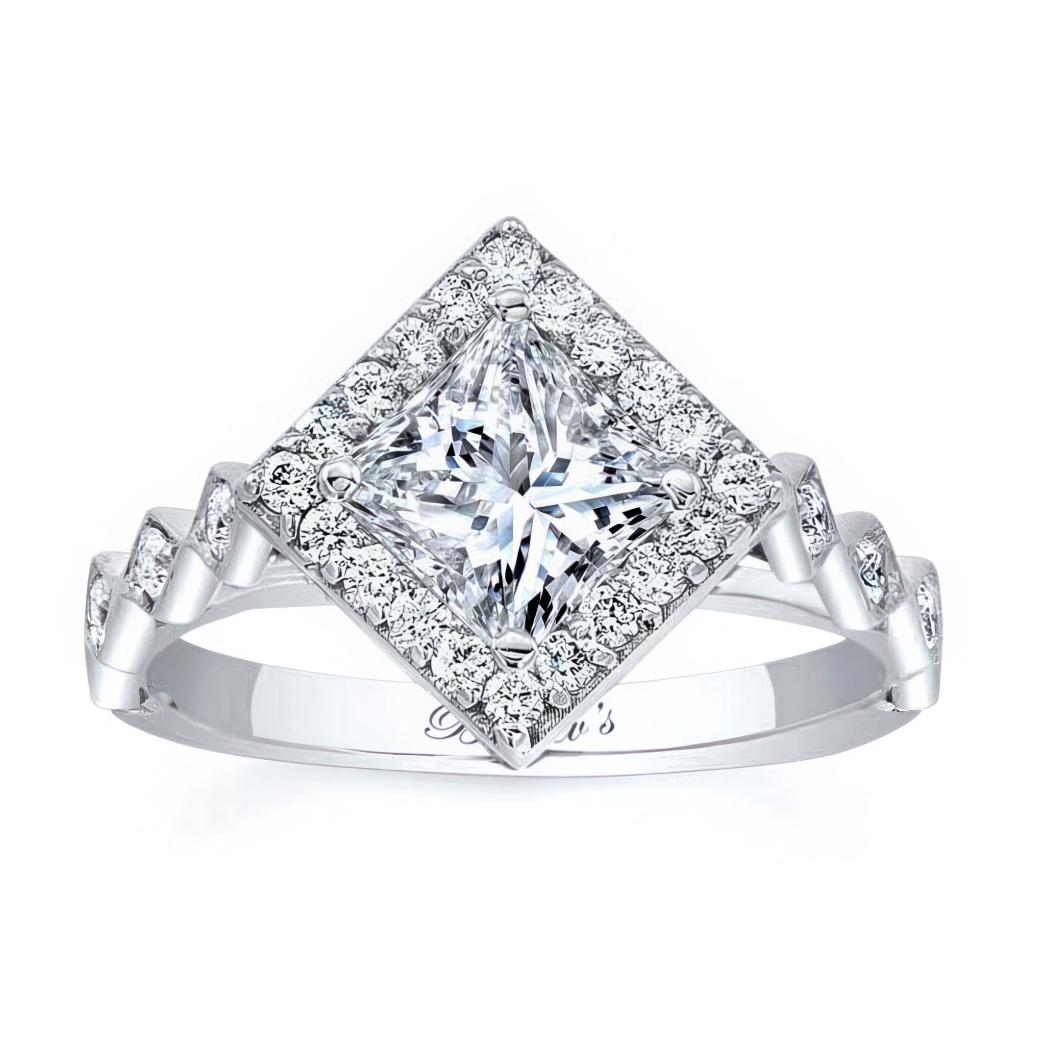 This vintage princess cut halo ring features a prong set center encircled with a halo of shared prong set diamonds and a detailed antique style shank artfully embellished with diamonds.