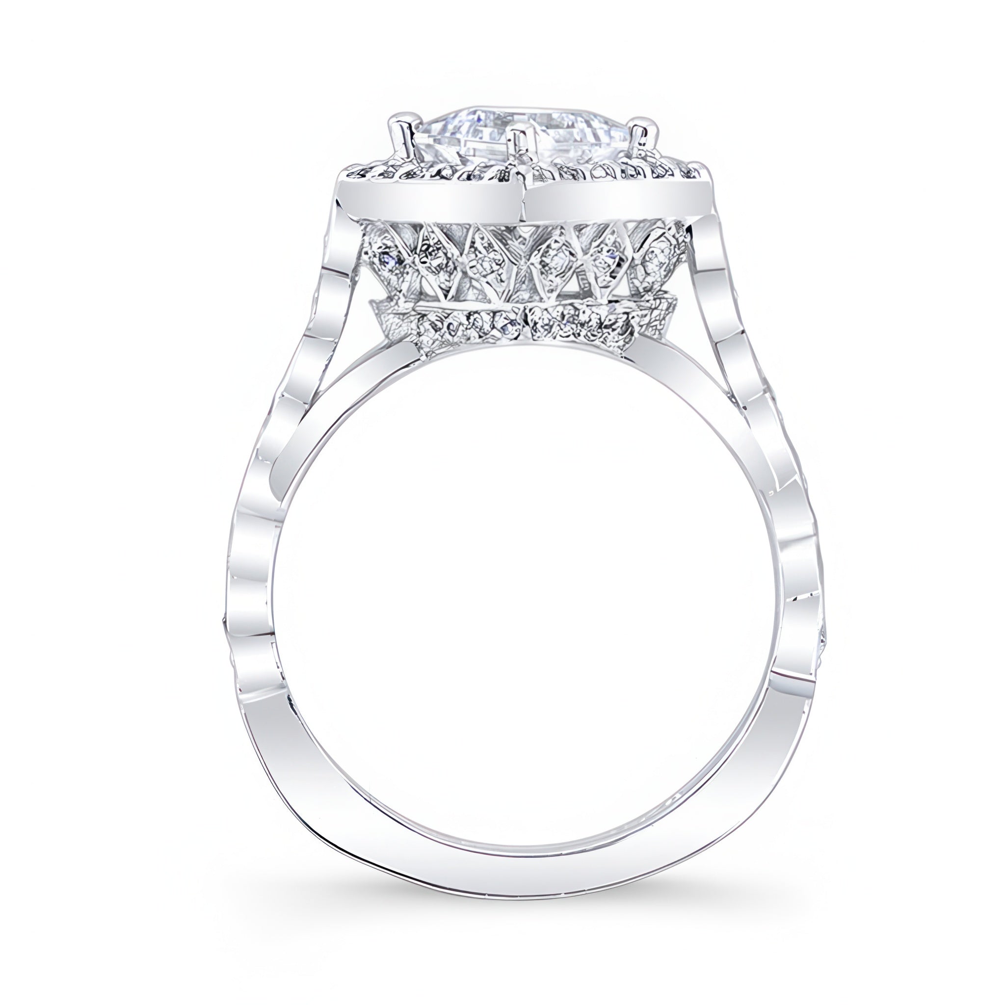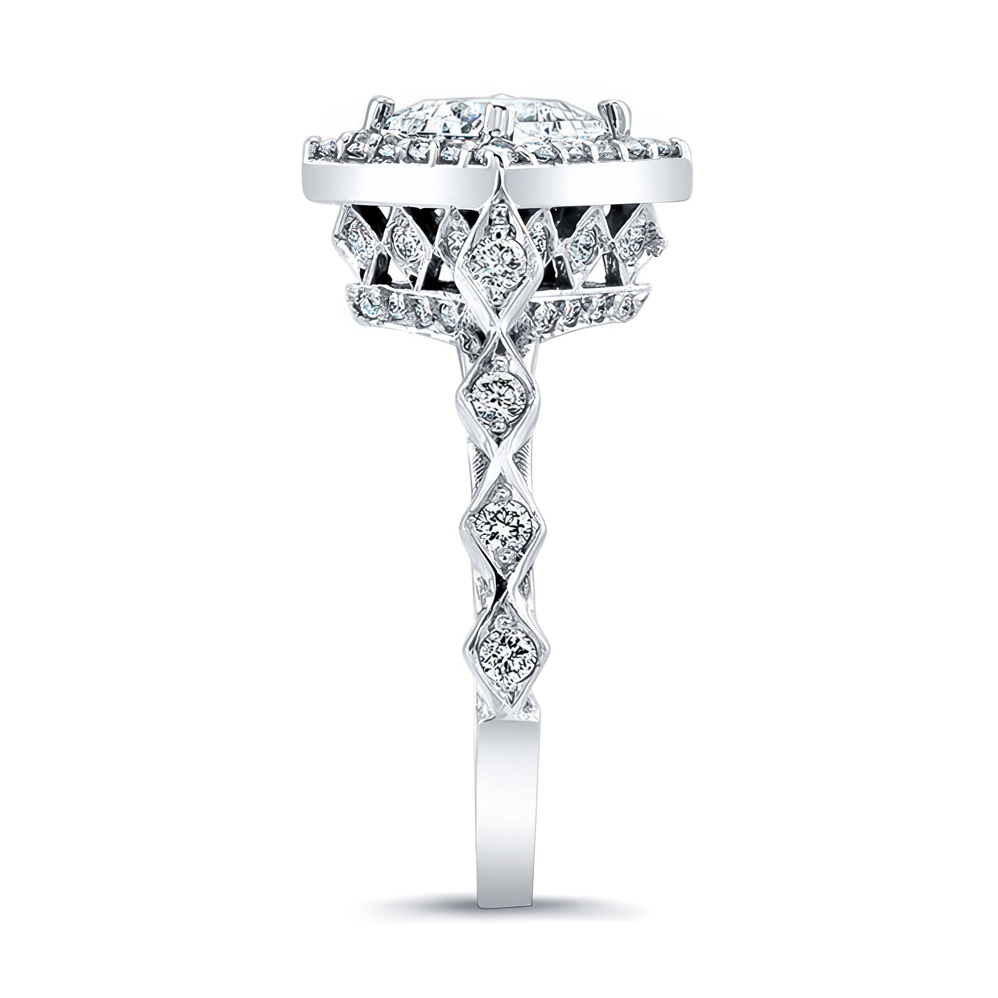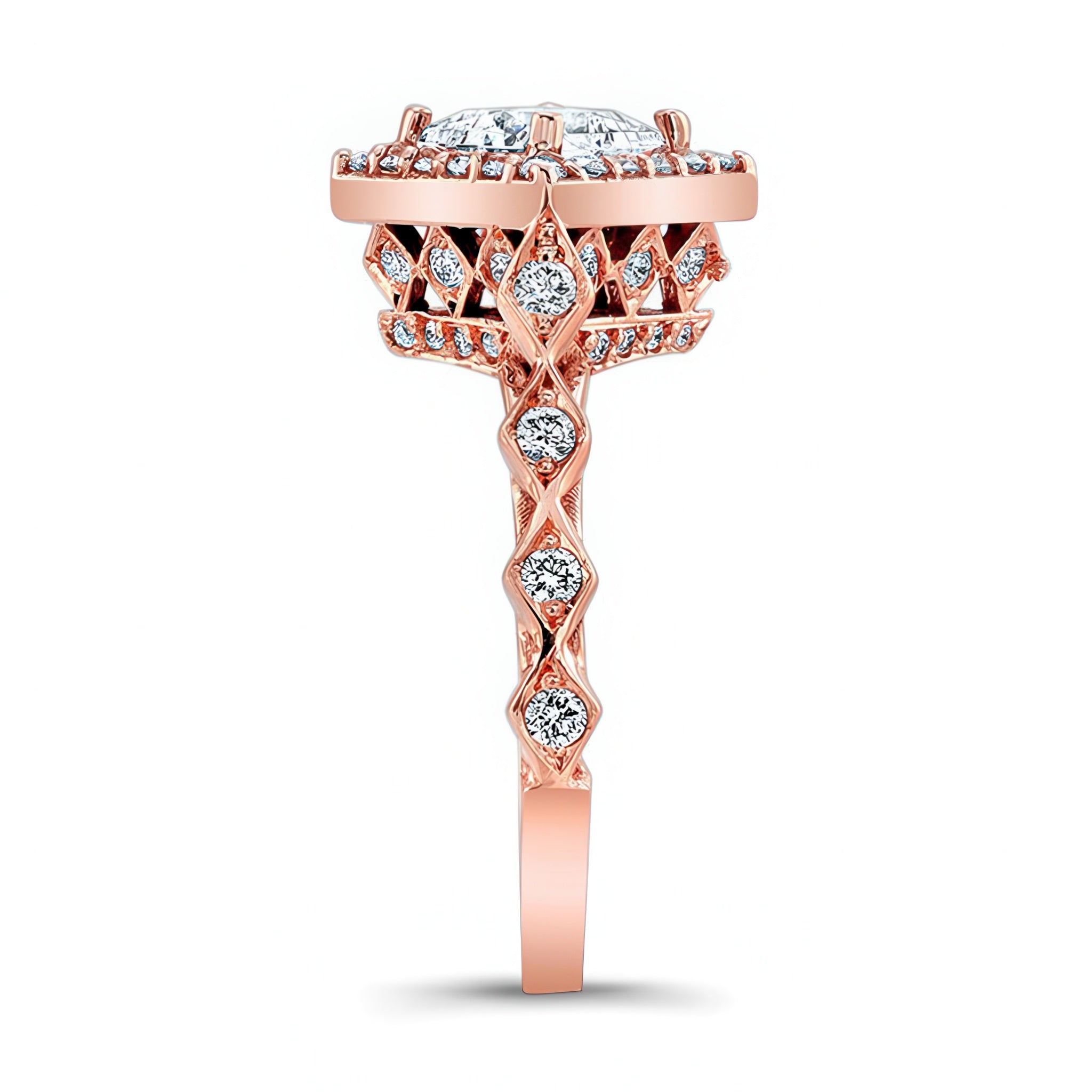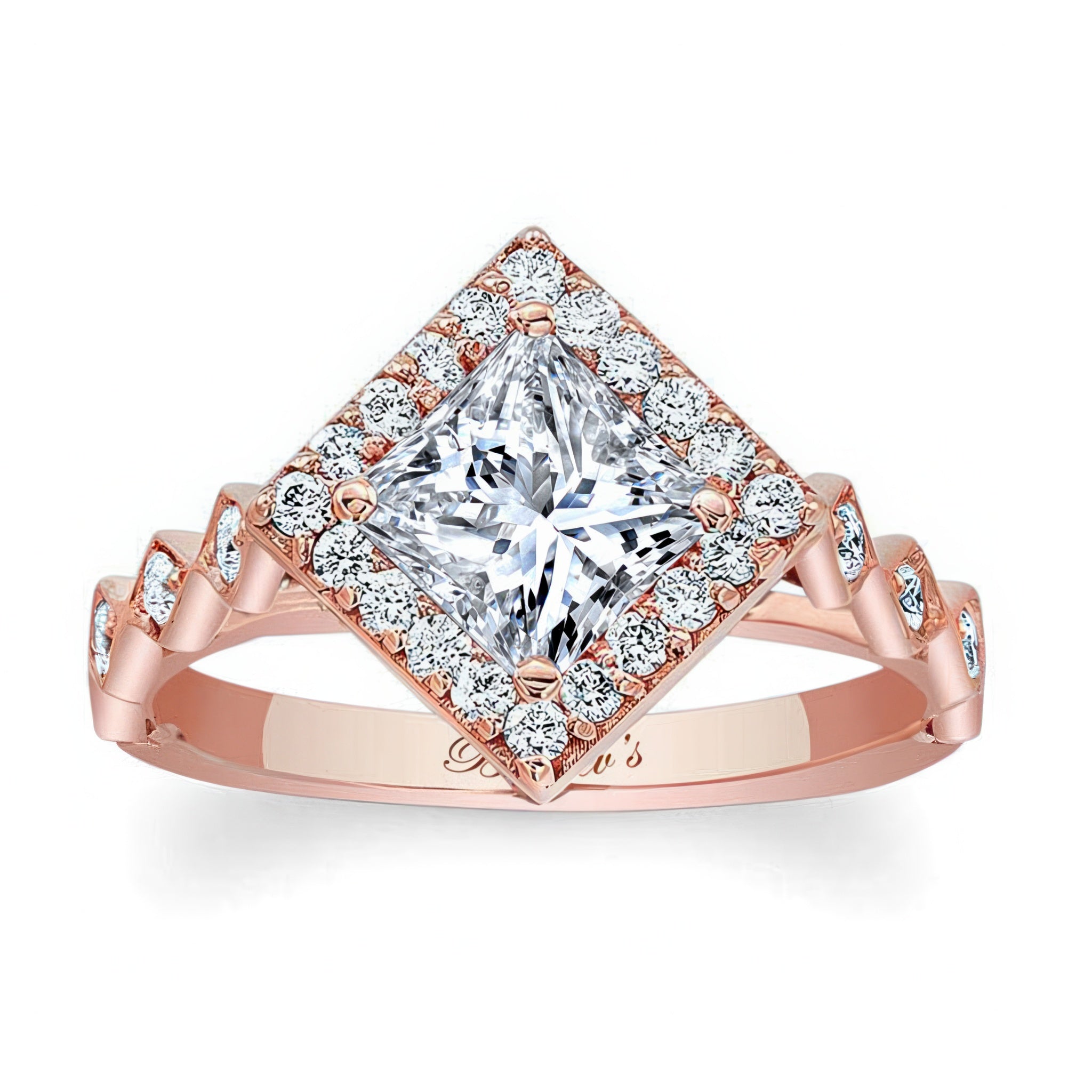 This vintage princess cut halo ring features a prong set center encircled with a halo of shared prong set diamonds and a detailed antique style shank artfully embellished with diamonds.
