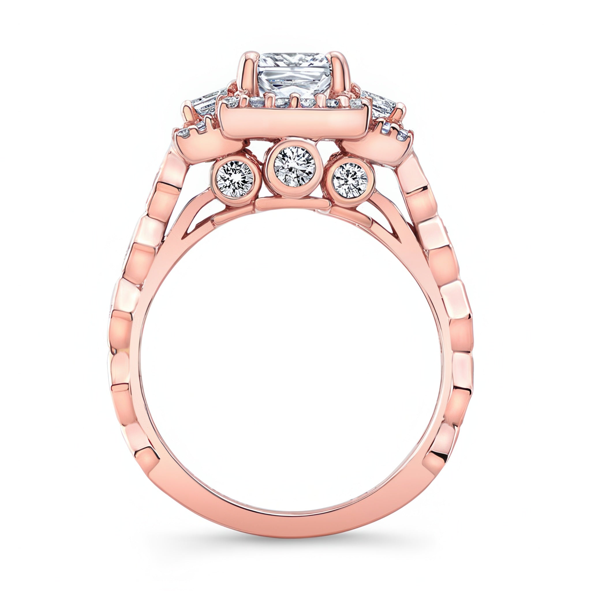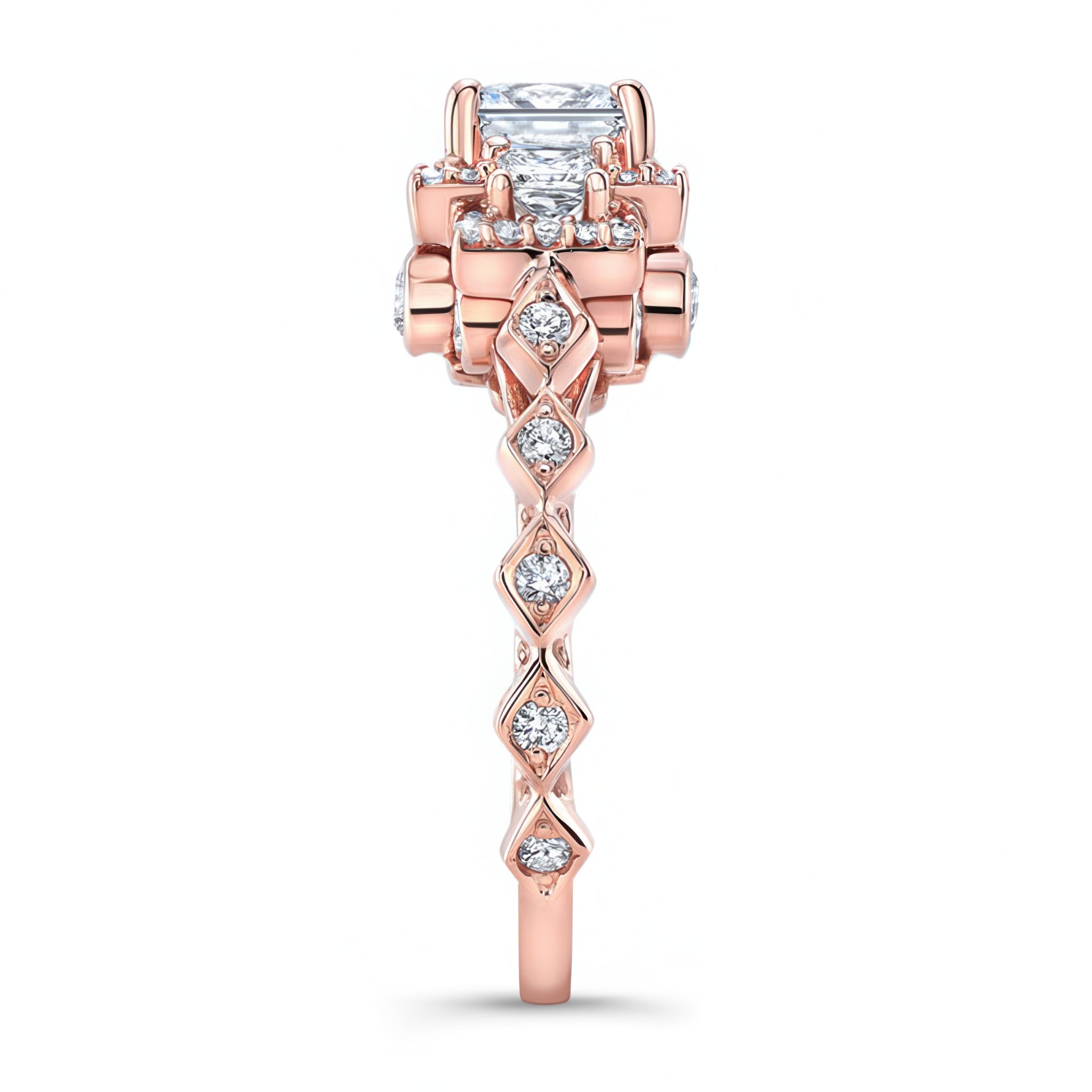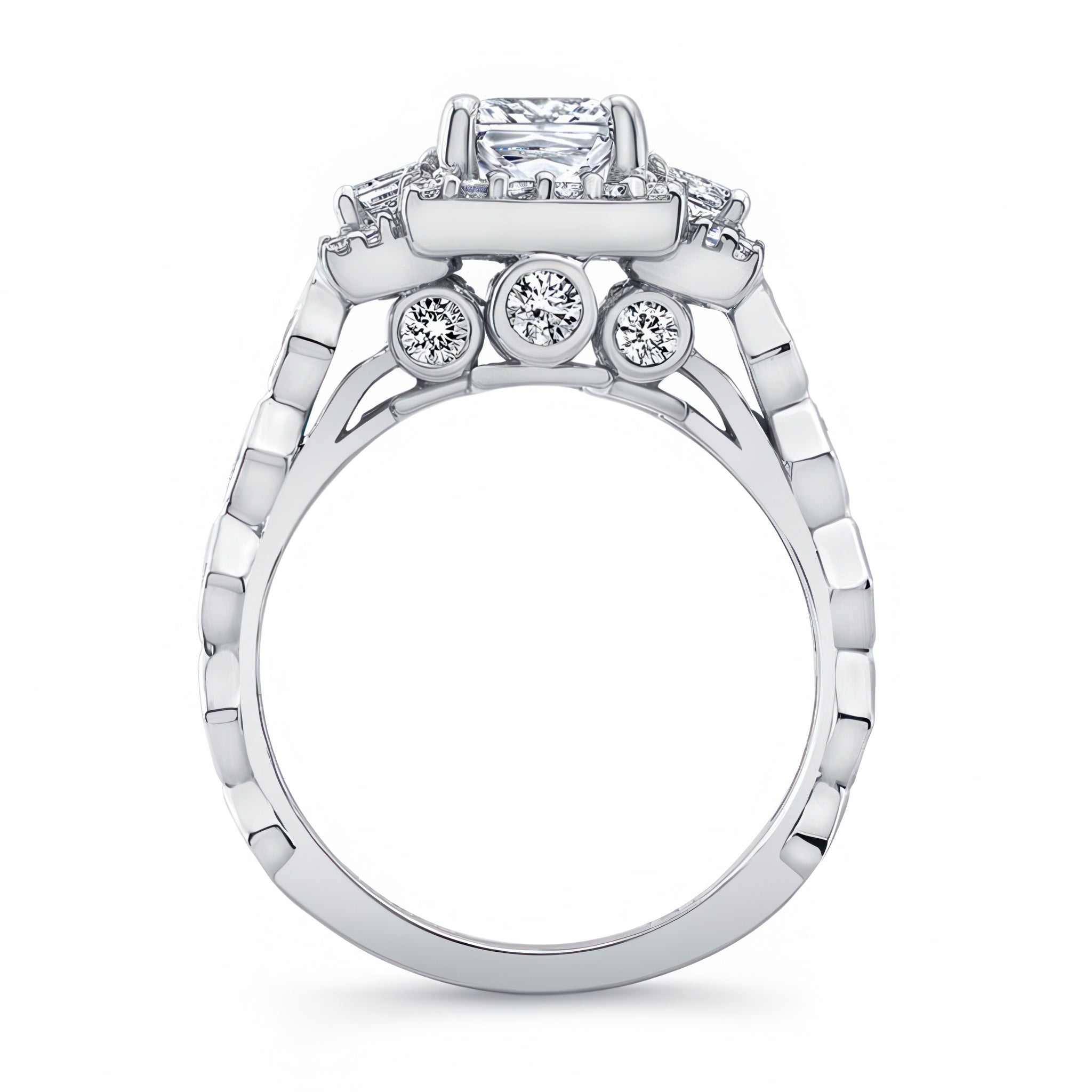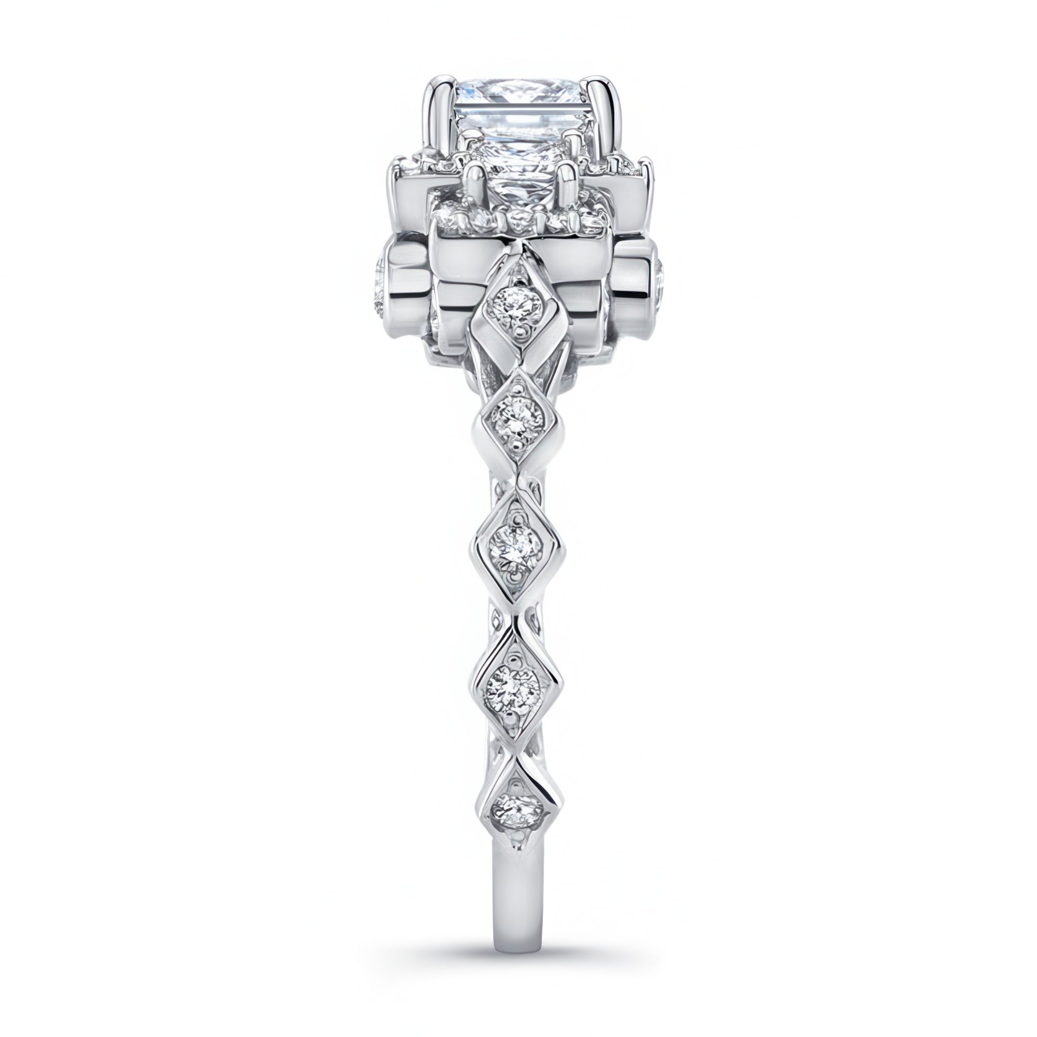 A vintage three stone engagement ring featuring a princess cut center with a diamond halo and two smaller diamonds on each side. The profile displays an arch of bezel set round diamonds and the side view shows the true brilliance of this ring with it's unique shank adorned with diamond melees.