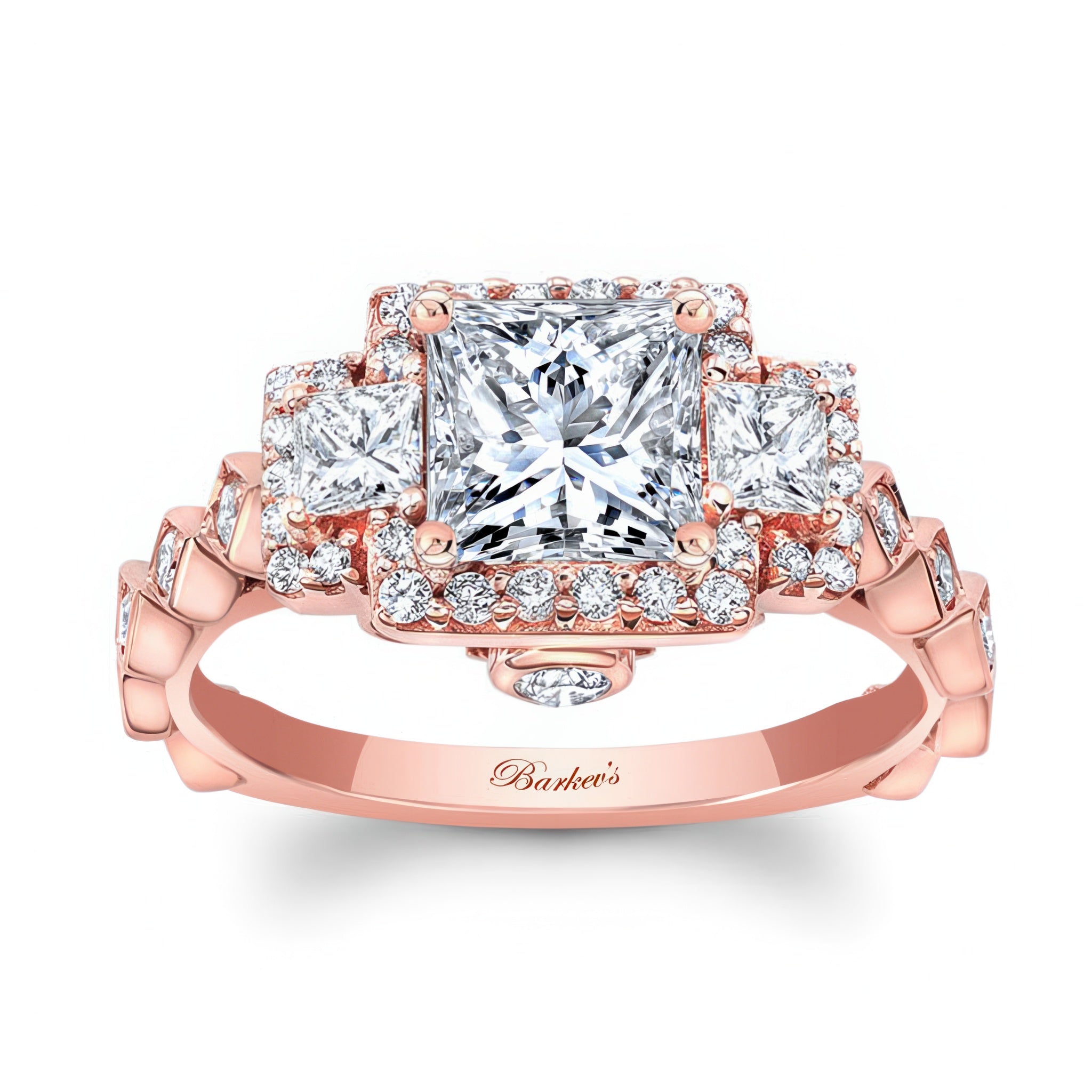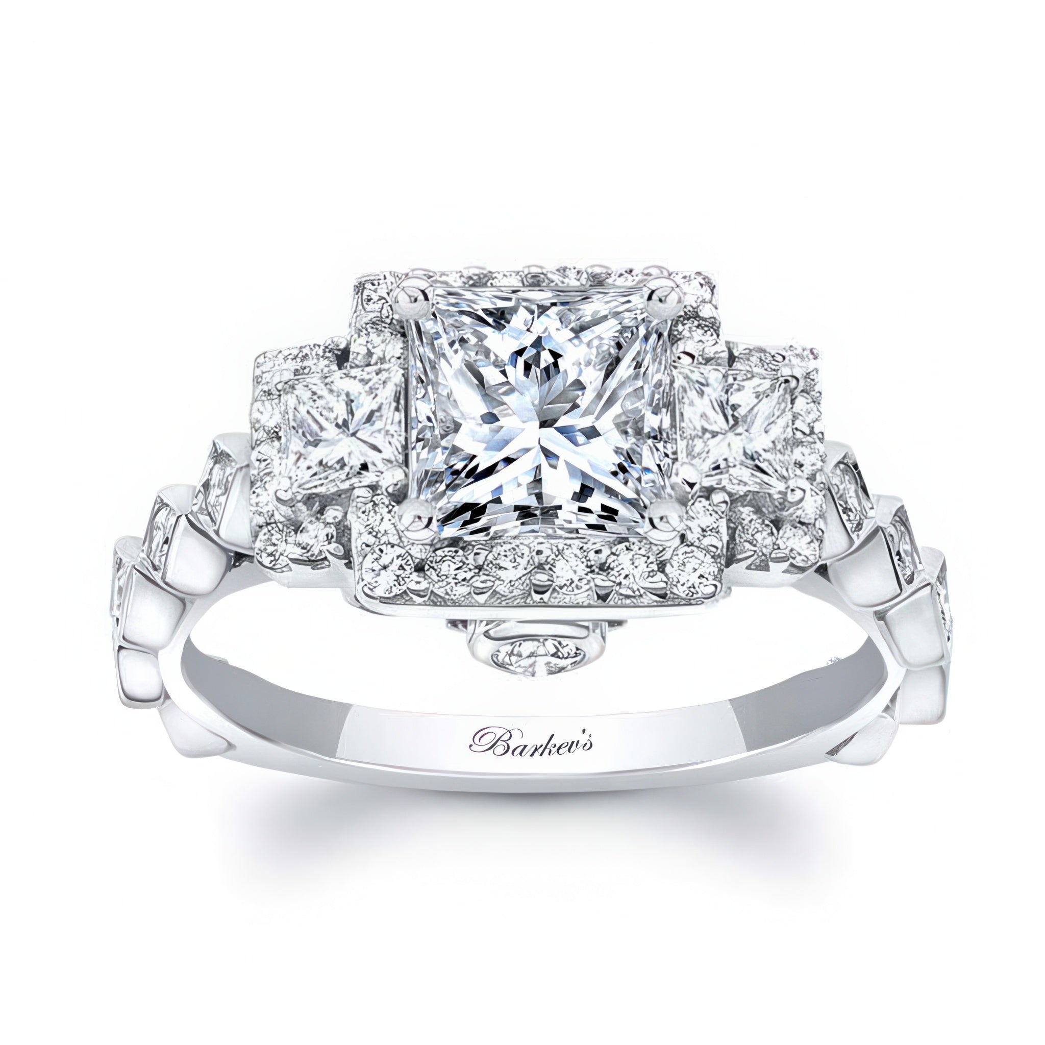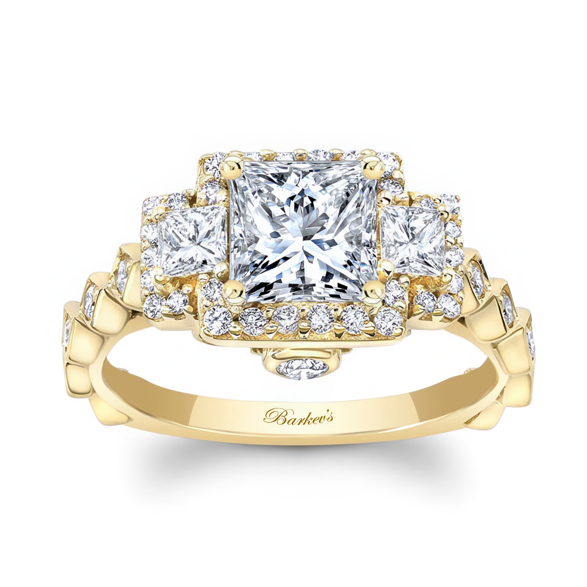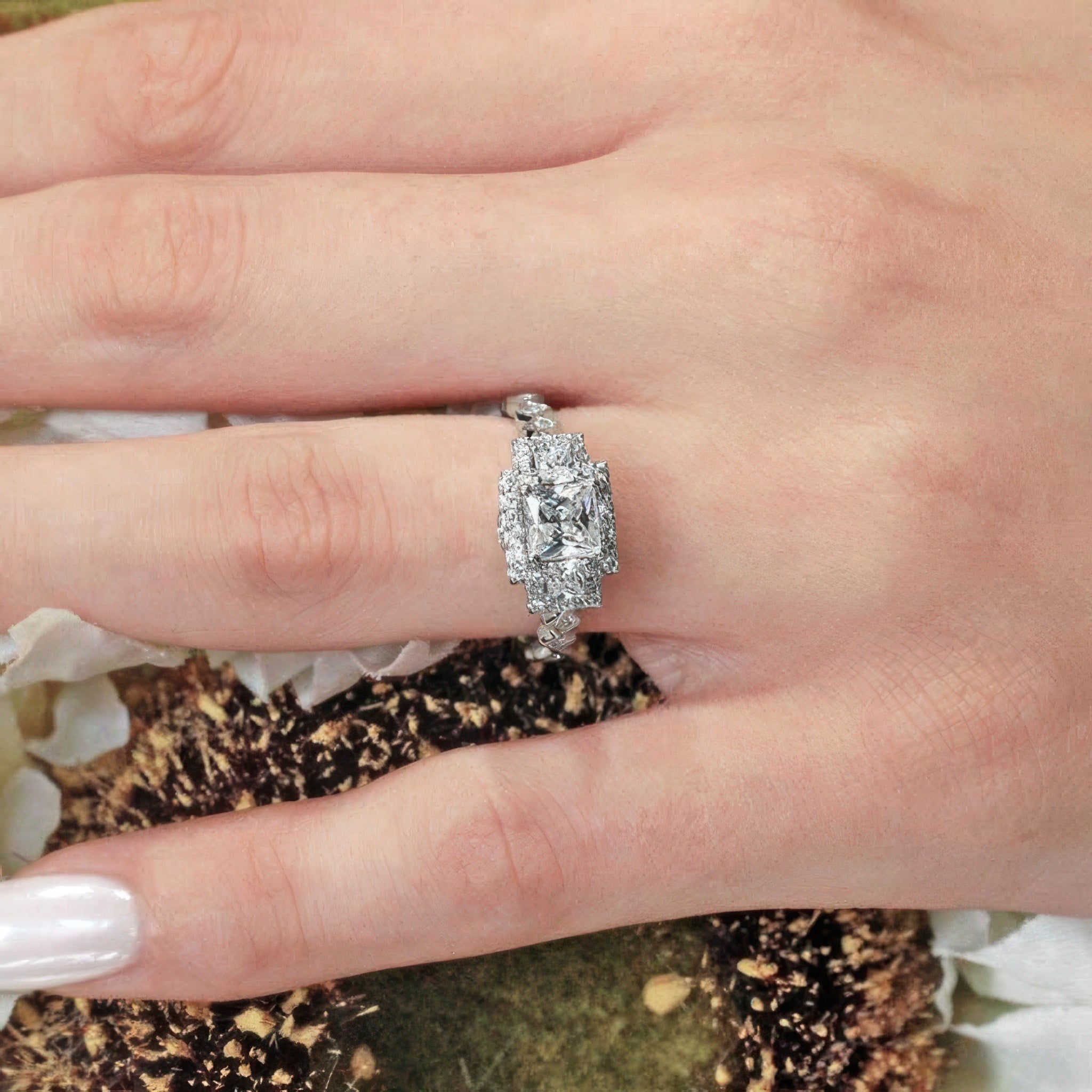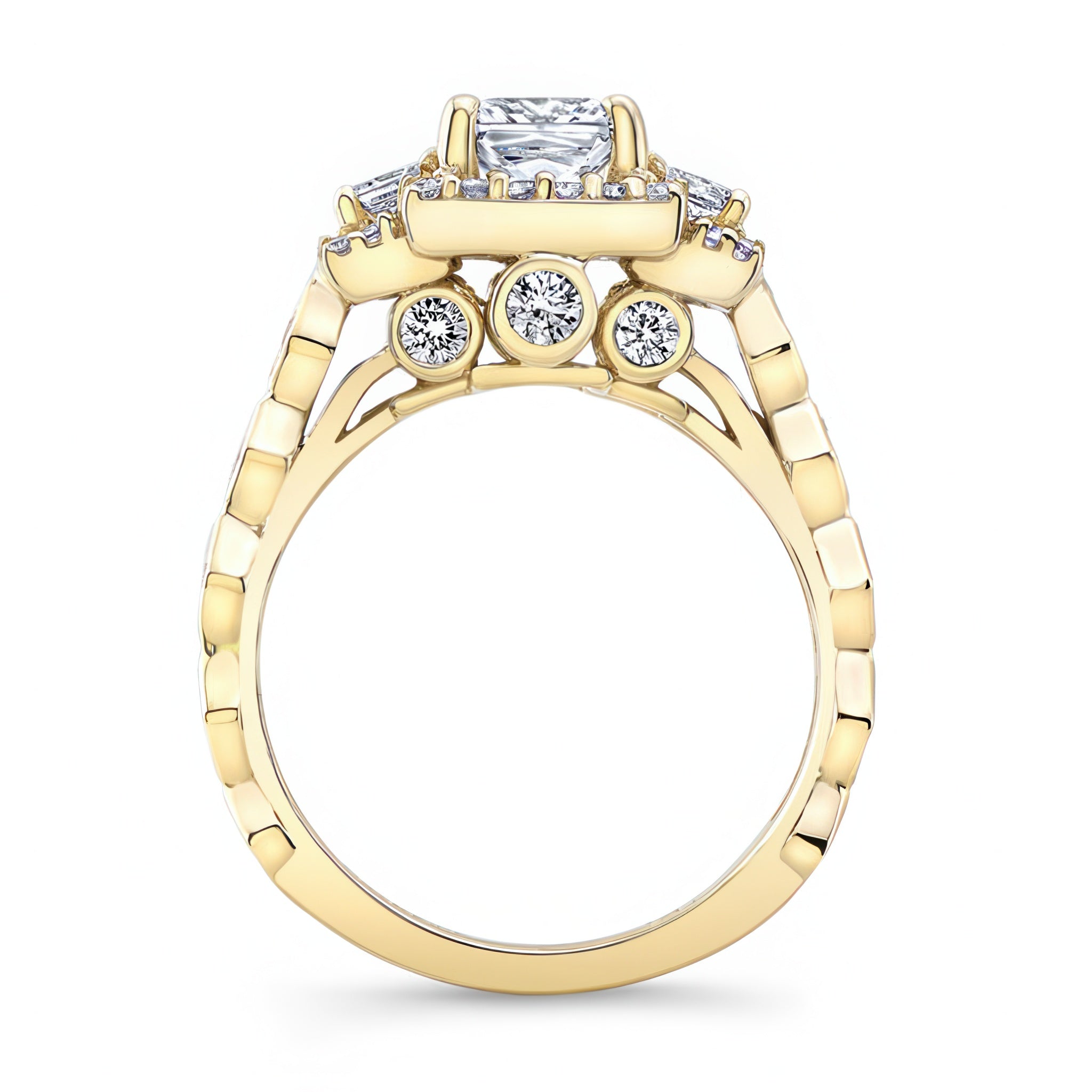 A vintage three stone engagement ring featuring a princess cut center with a diamond halo and two smaller diamonds on each side. The profile displays an arch of bezel set round diamonds and the side view shows the true brilliance of this ring with it's unique shank adorned with diamond melees.
