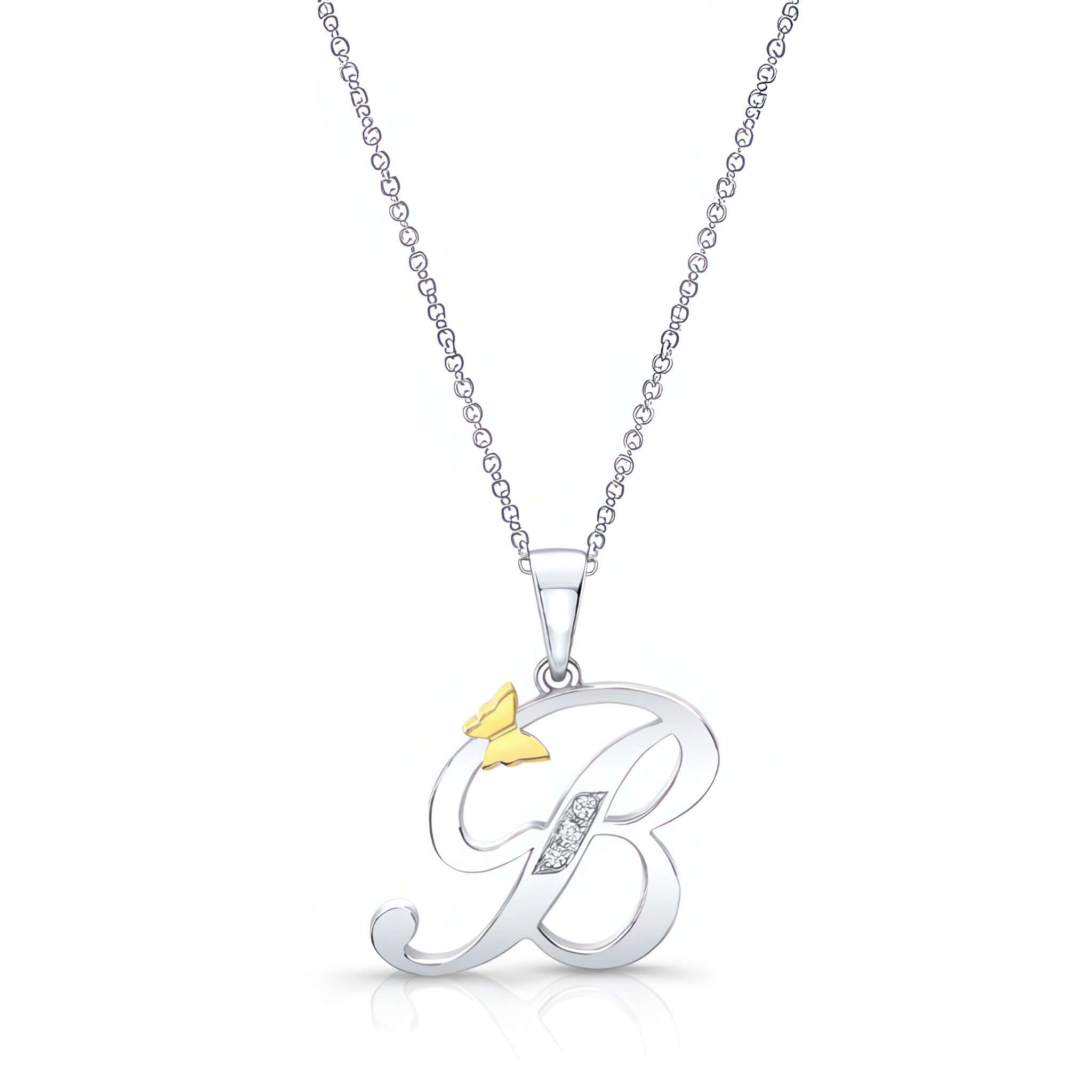 This B initial necklace features the letter "B" in white gold with 3 pave set diamonds and a cute yellow gold butterfly accent.