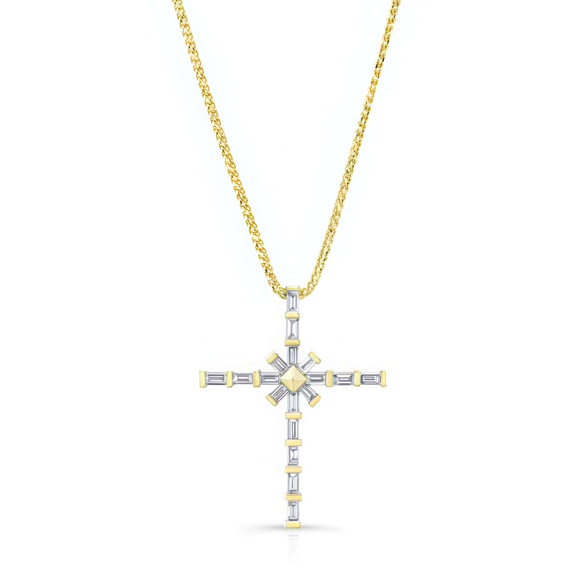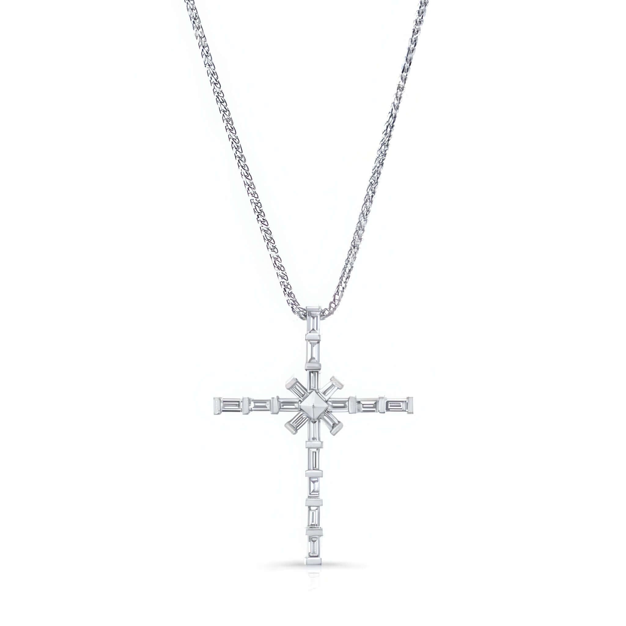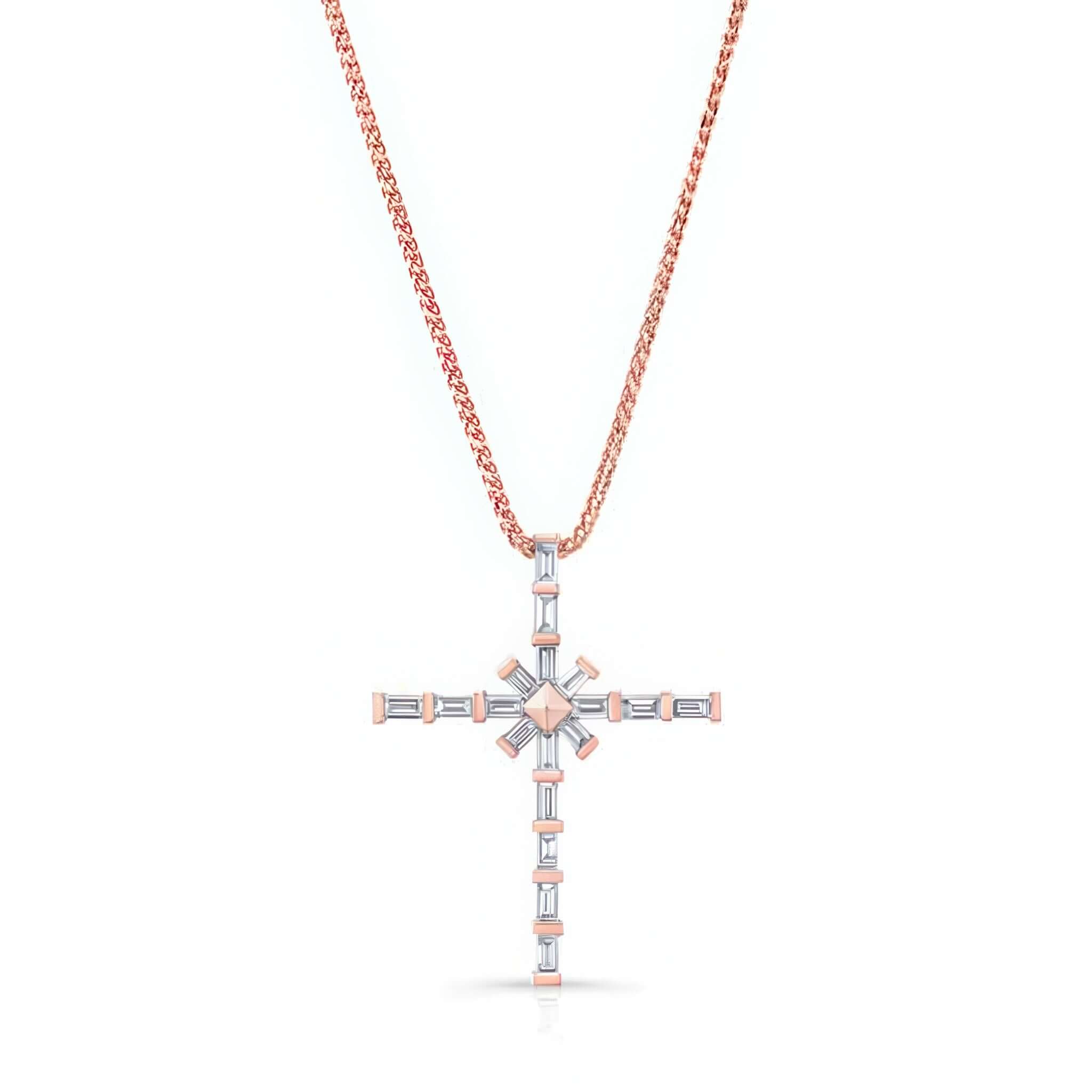 A unique baguette diamond cross pendant featuring shared prong set baguette cut diamonds adorning the artful ridges for a glamorous look of sophistication.