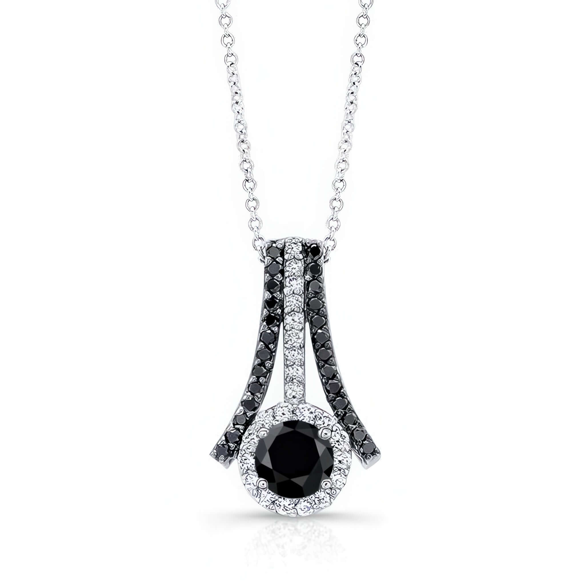This black diamond halo pendant features a prong set round center black diamond dropping from a shared prong set diamond halo bail flanked by curved black diamond bars for a striking fashion statement.