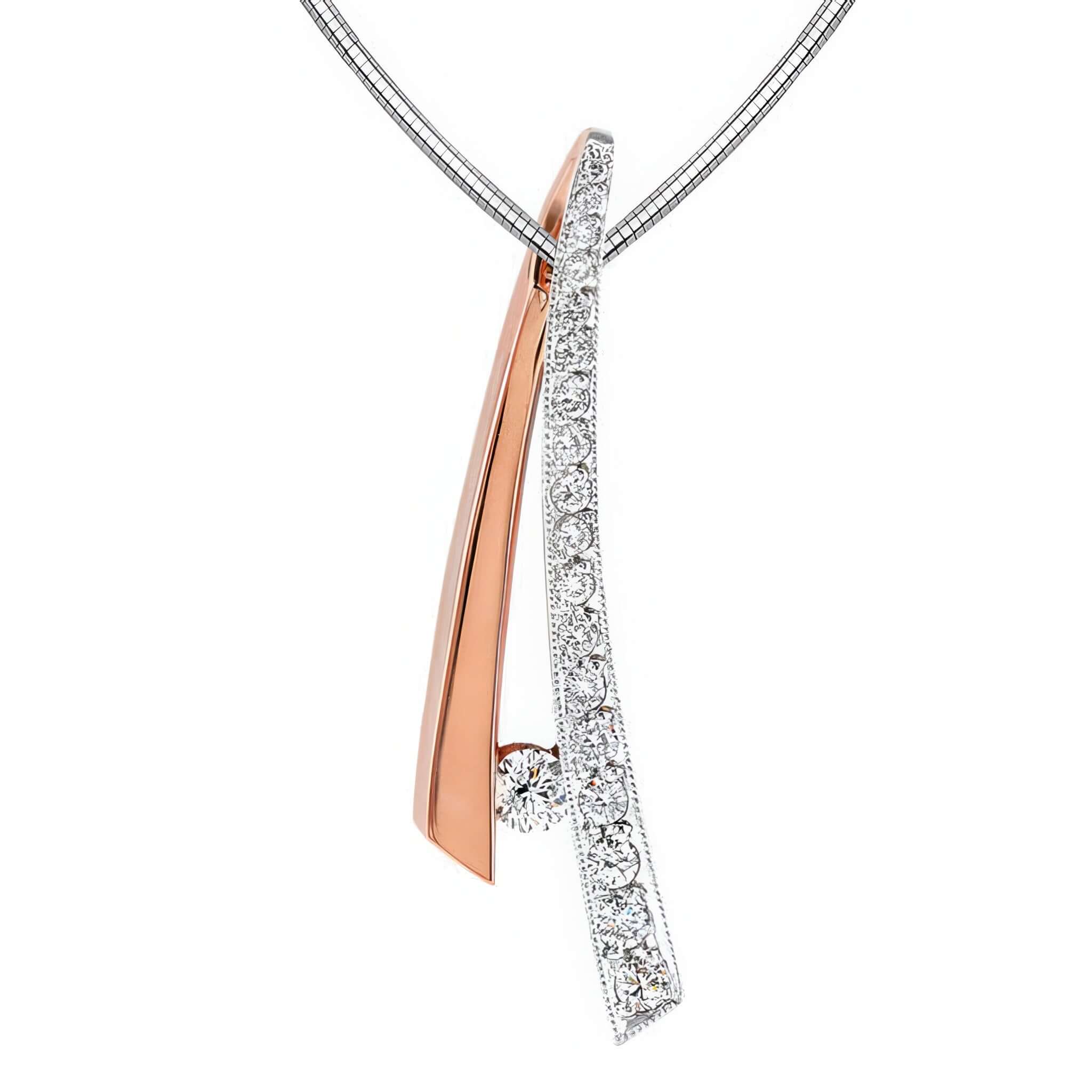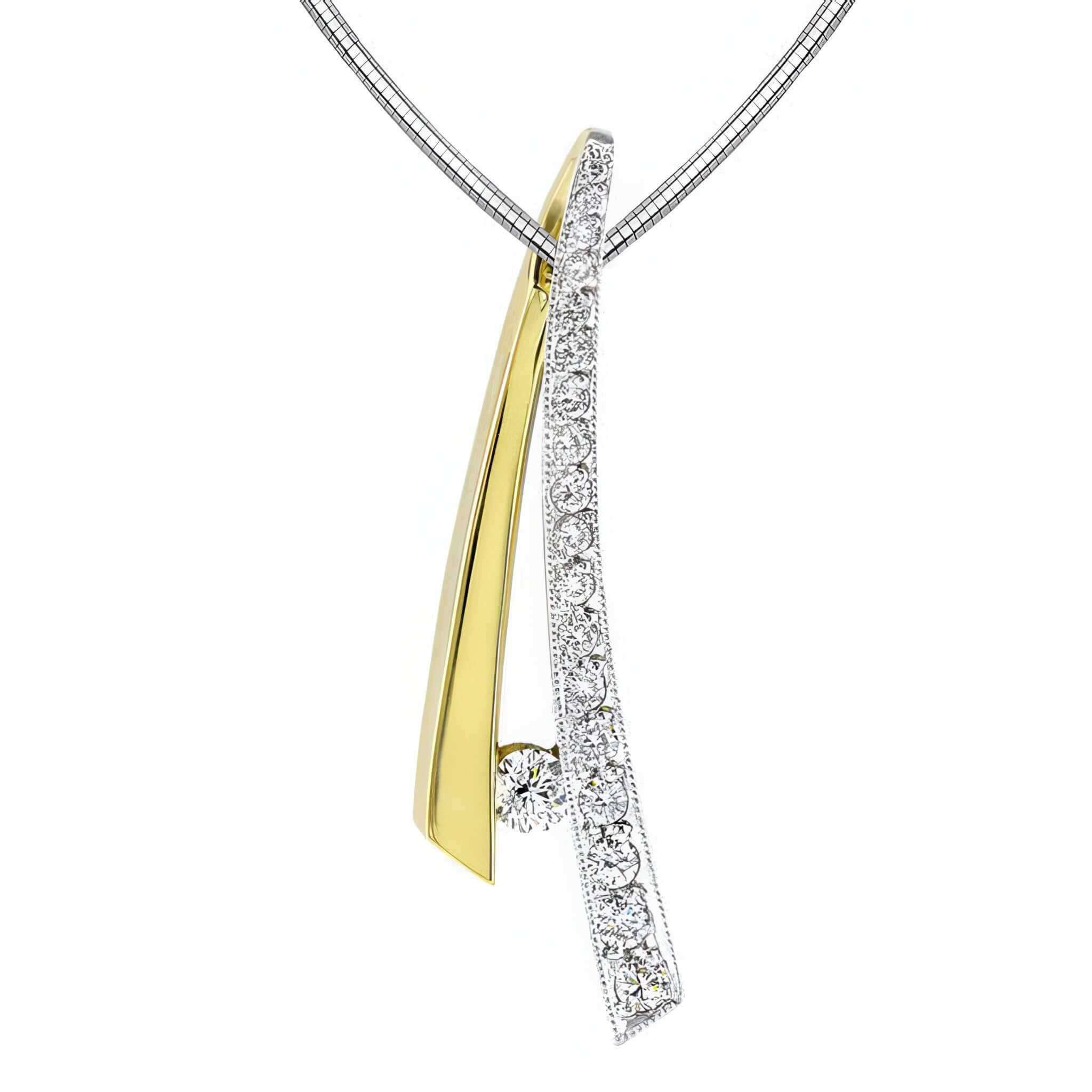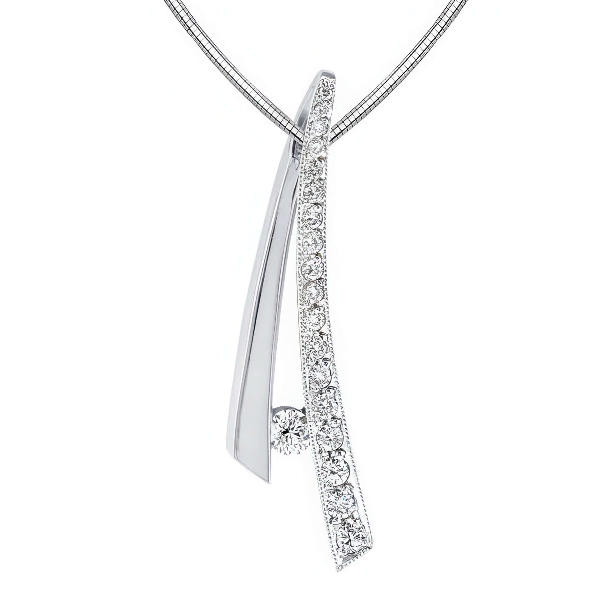 This stunning contemporary slide necklace, features a white gold split shoulder mounting, a channel set round diamond center is captured between the bright polished bar and the white gold pave set diamond bar for a spectacular statement of grace and beauty. An opening in the top allows the necklace to slide freely on the chain.