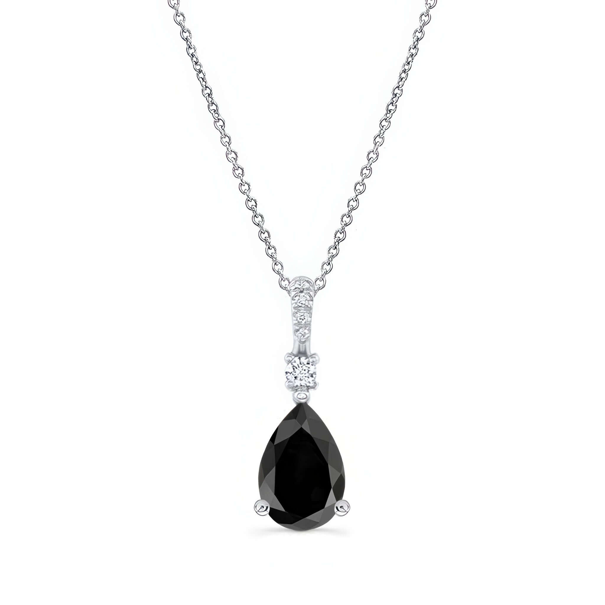 An elegant pear shape black diamond necklace featuring a pear center with diamonds slowly graduating in size.