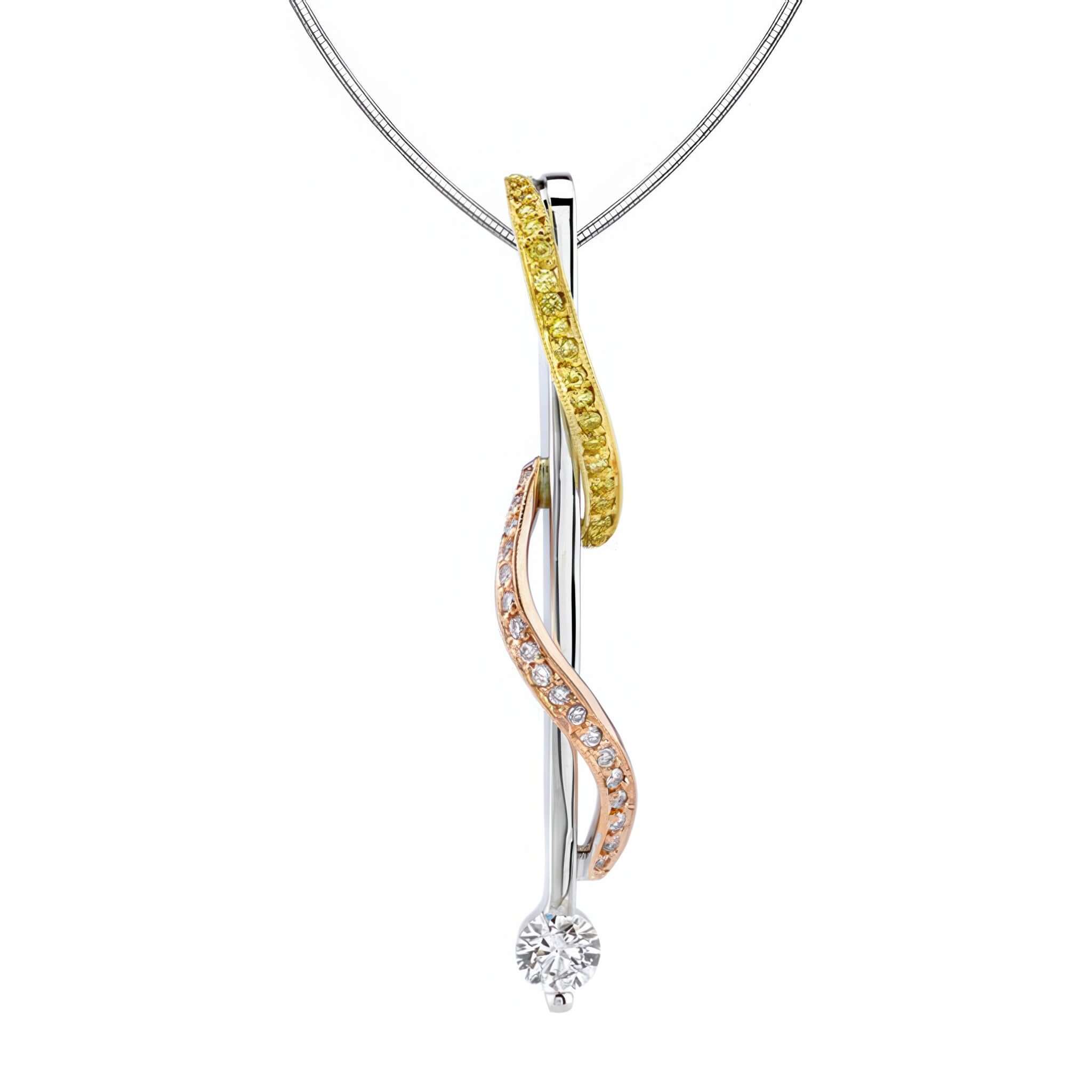 This tri color diamond bar necklace features a round diamond center, channel set at the bottom of the white gold bar. A yellow and rose gold ribbon adorns the white gold bar with pave set fancy yellow and pink diamonds swirling around it, for an added touch of drama.