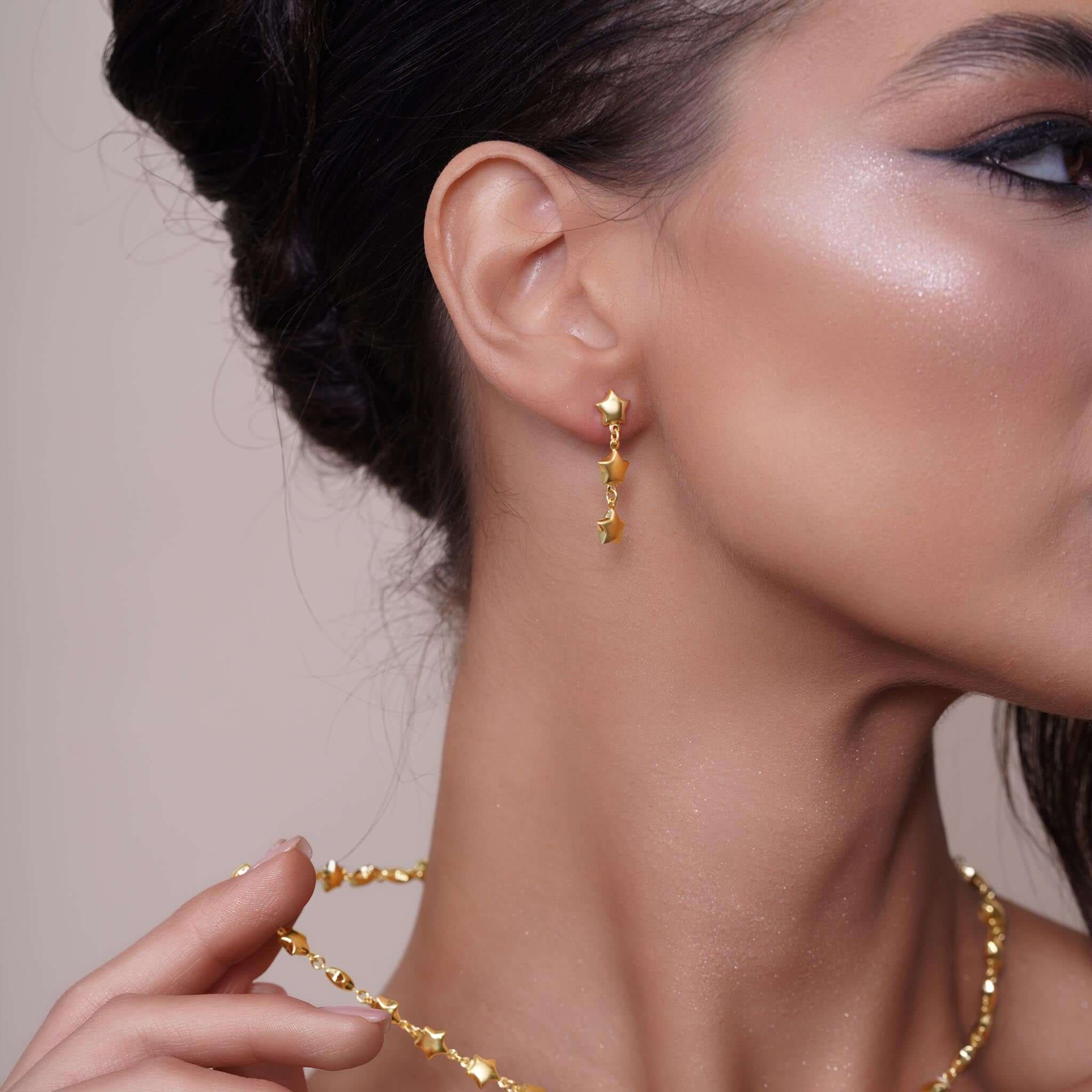 Celestial elegance meets refined craftsmanship in these Star Link Gold Earrings. Three interconnected stars cascade gracefully, creating a dynamic yet sophisticated silhouette that captures light beautifully. Crafted in lustrous gold, these earrings offer versatile styling—equally at home with everyday wear or special occasions. The linked star design symbolizes connection and aspiration, making them a meaningful choice for those who appreciate celestial-inspired jewelry with substance and style.