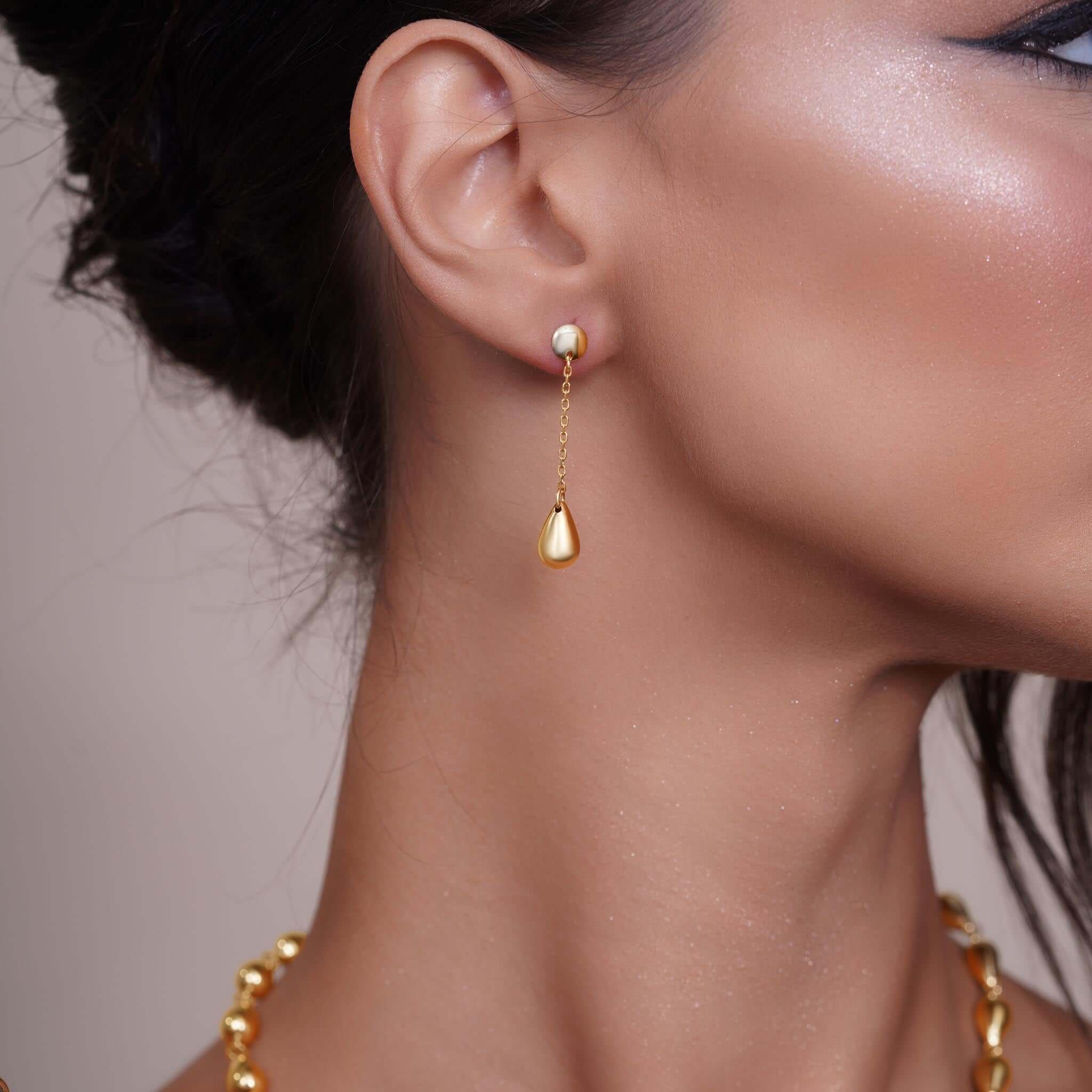 Refined gold earrings featuring a delicate dangling chain that gracefully suspends a luminous pear-shaped drop. The slender chain design creates an understated elegance with subtle movement, while the polished pear pendant adds a touch of sophistication. Expertly crafted for women who appreciate minimalist luxury, these earrings offer versatile styling for both professional environments and refined social occasions, embodying timeless jewelry design principles.