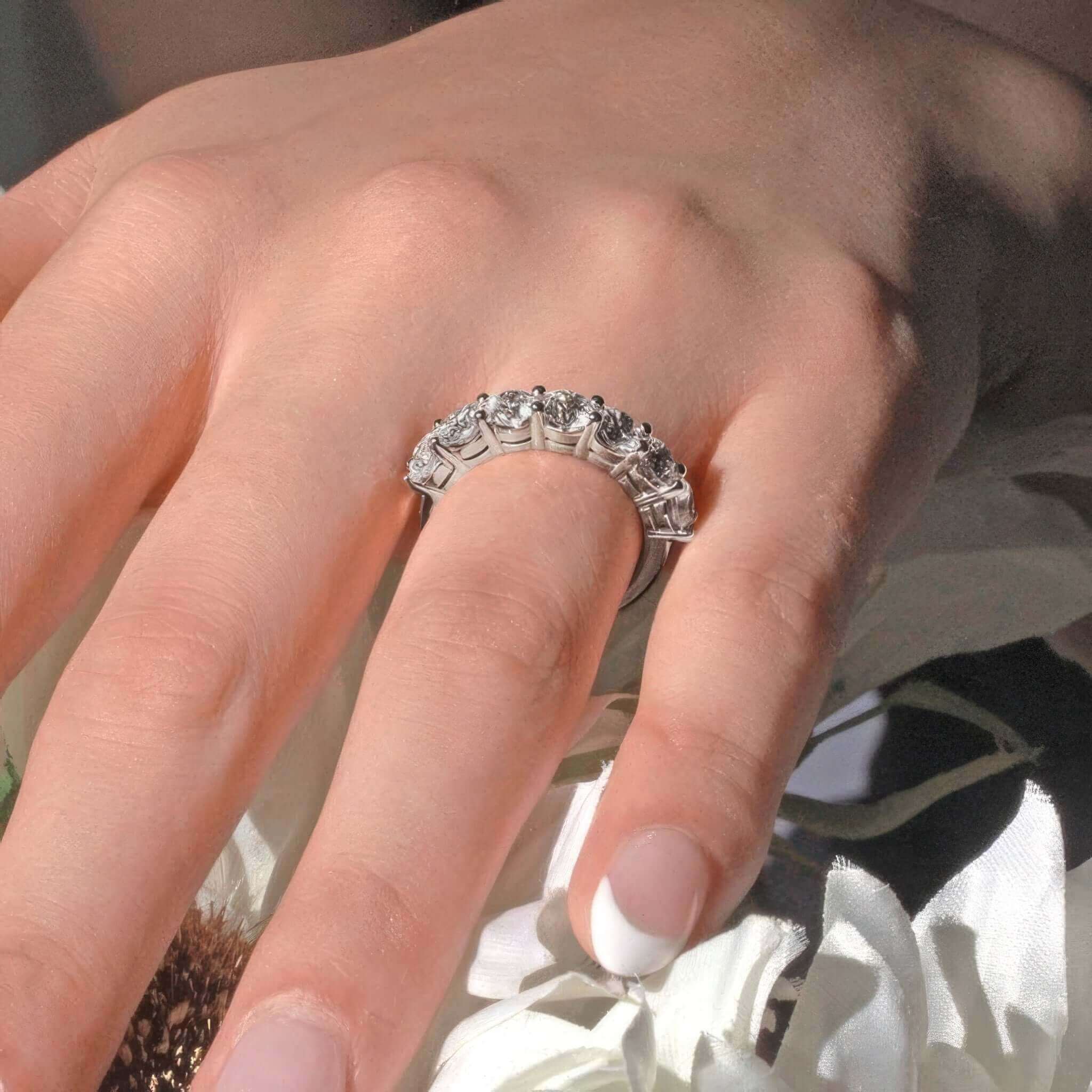 A 2.1 carat lab diamond half eternity band featuring shared prong set lab grown diamonds