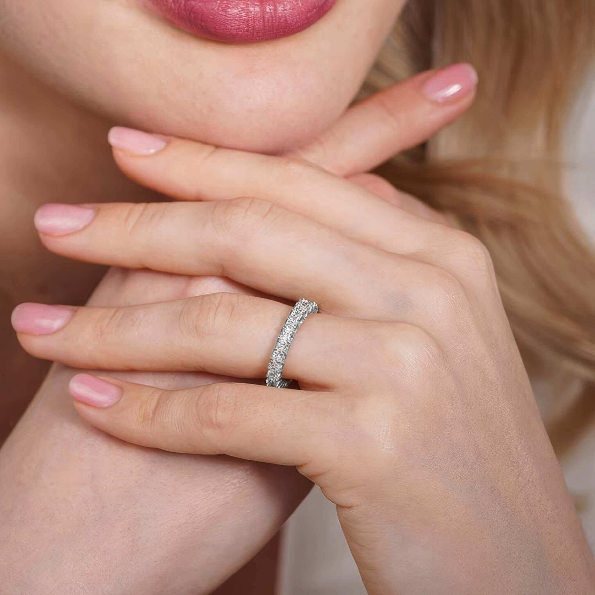 A 2.5 carat princess cut lab diamond eternity band featuring shared prong set princess cut lab grown diamonds.