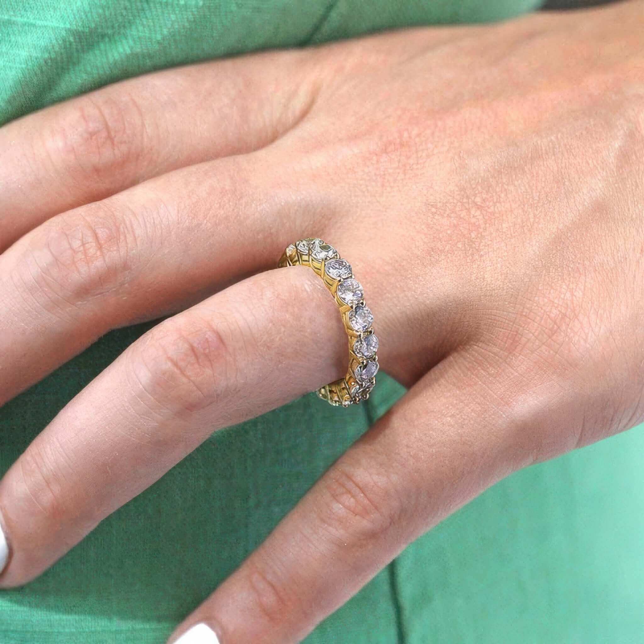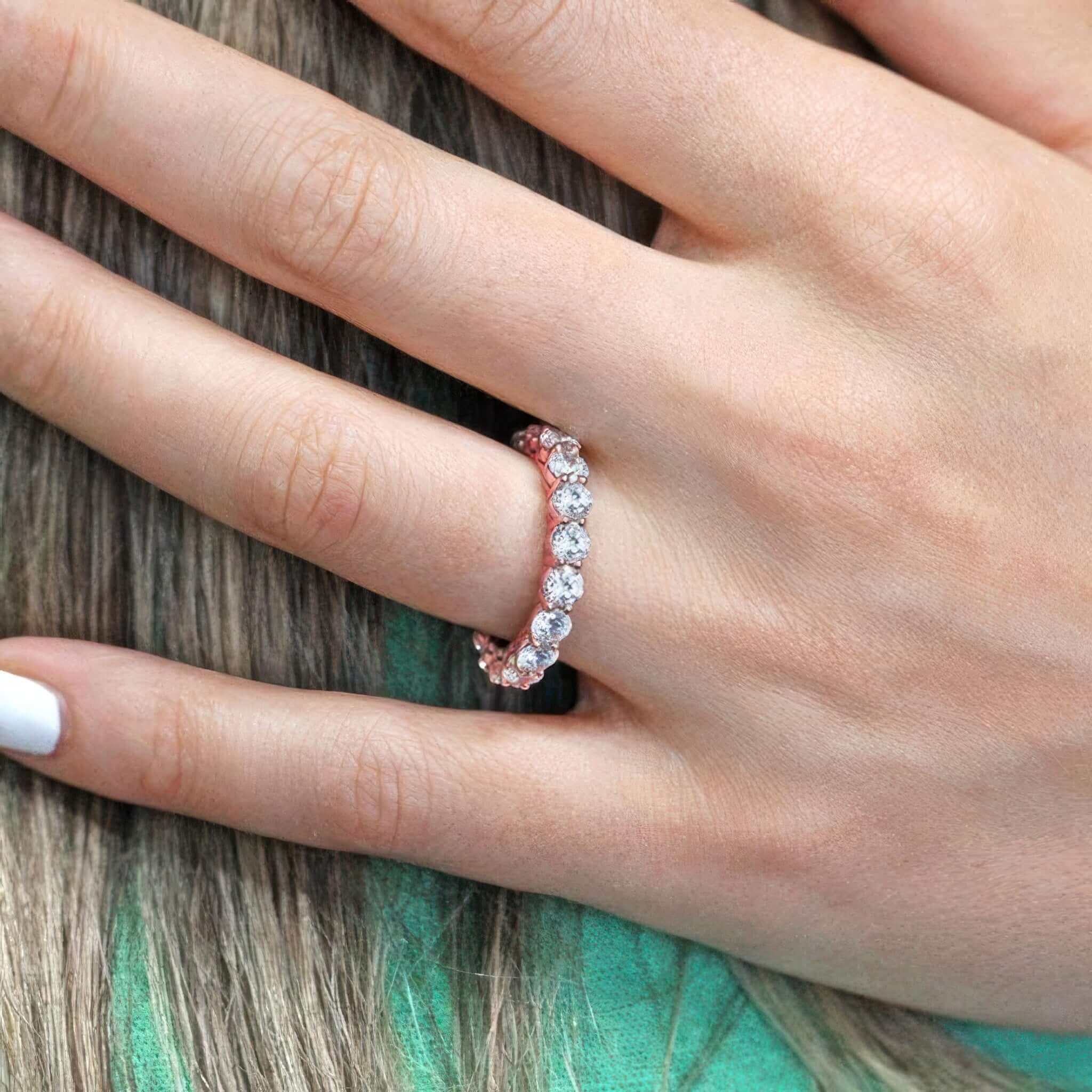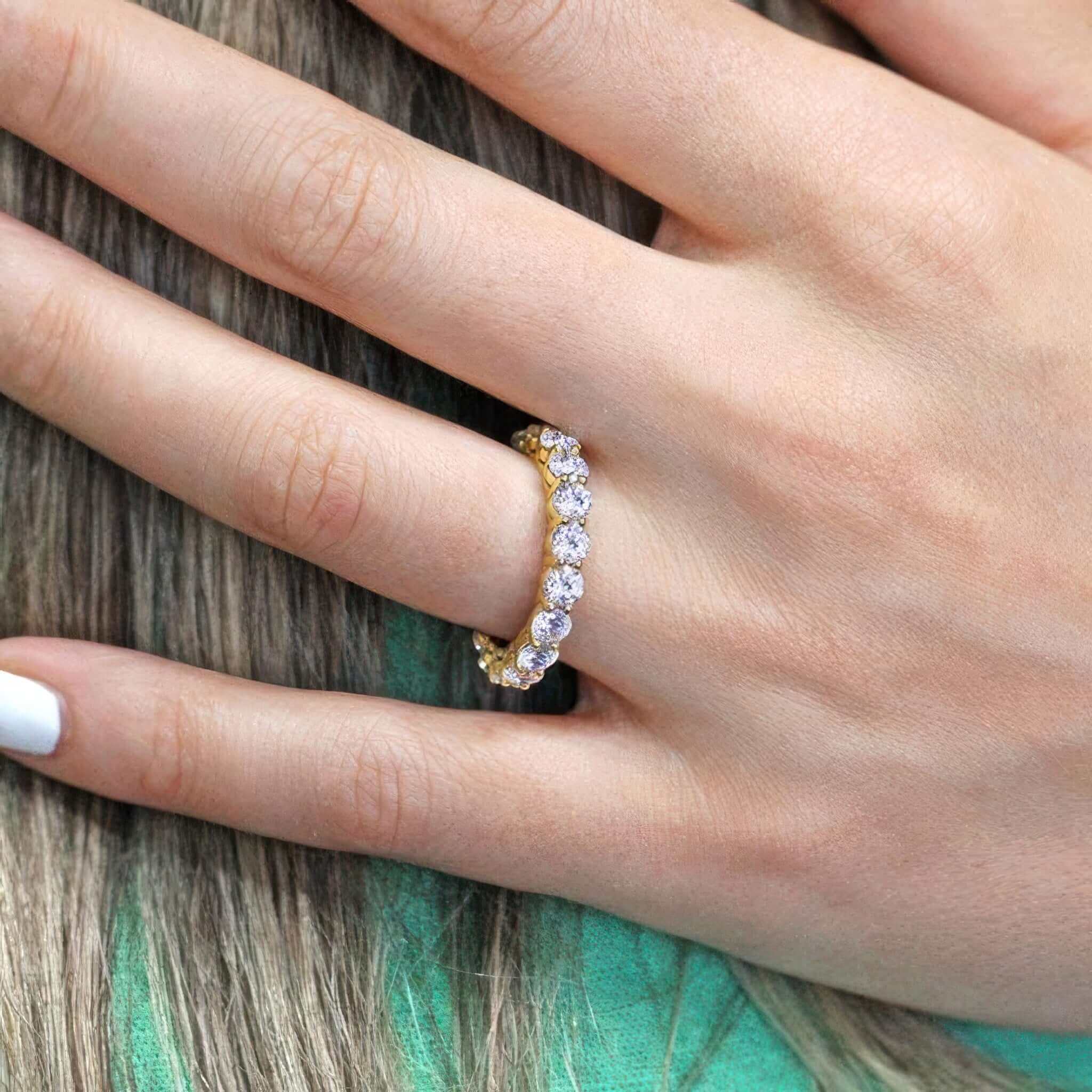 A 4 carat lab diamond eternity band featuring shared prong set lab grown diamonds