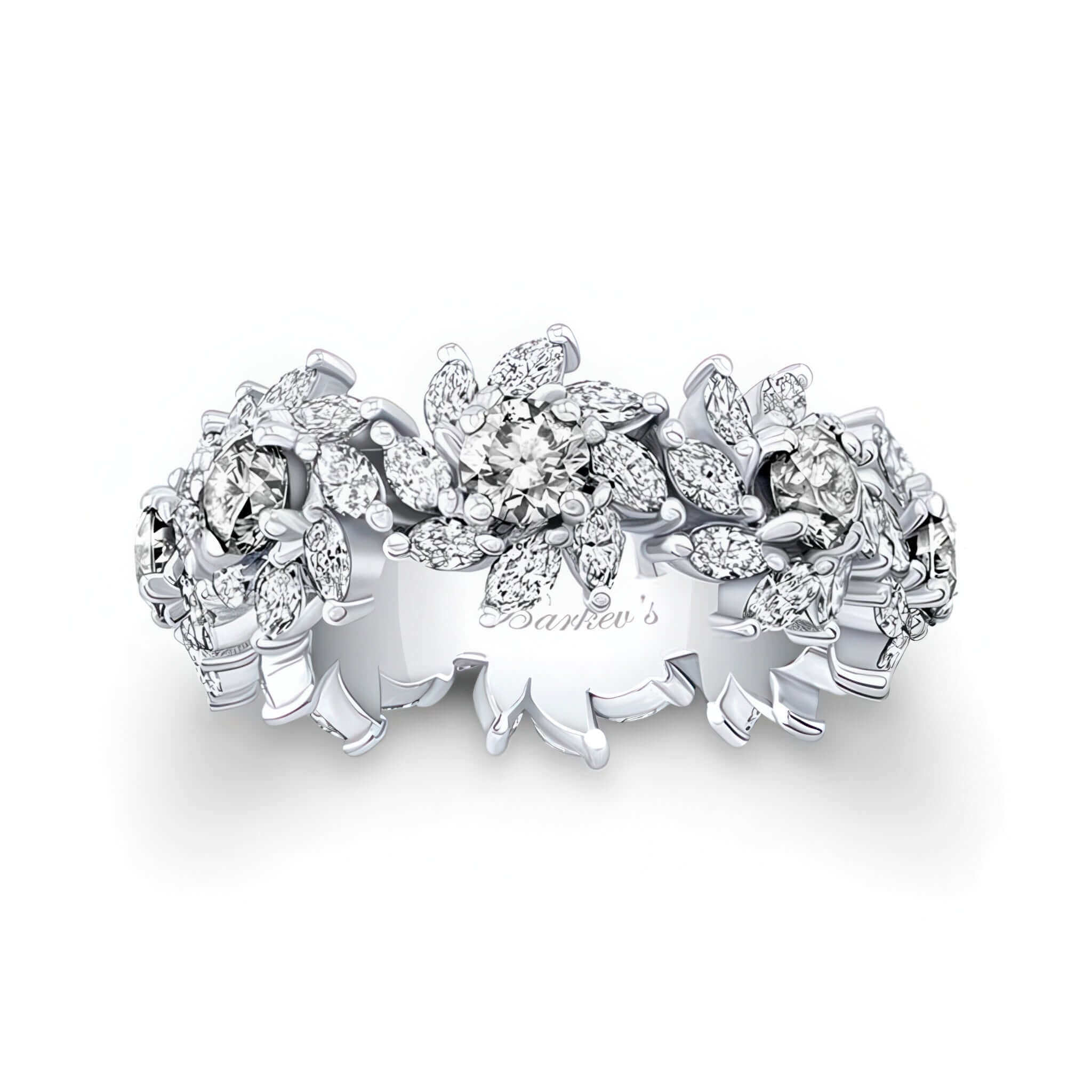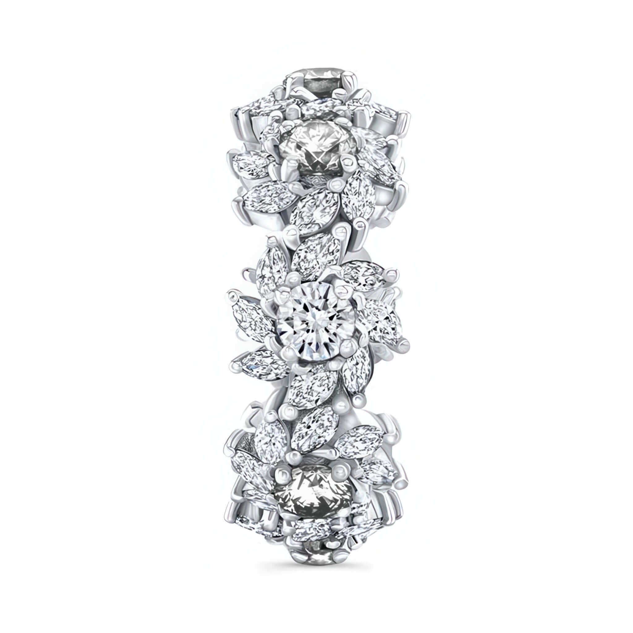 This floral lab diamond eternity band showcases 10 stunning 0.25ct. lab grown diamonds, each framed by a delicate floral design made of 66 marquise-cut lab grown diamonds. Crafted from 6 grams of gleaming white gold, this ring is perfect for those who love unique jewelry. The striking intricate floral pattern, makes this eternity band a timeless symbol of elegance and love. Whether worn as a wedding band or a statement piece, this ring is sure to turn heads.