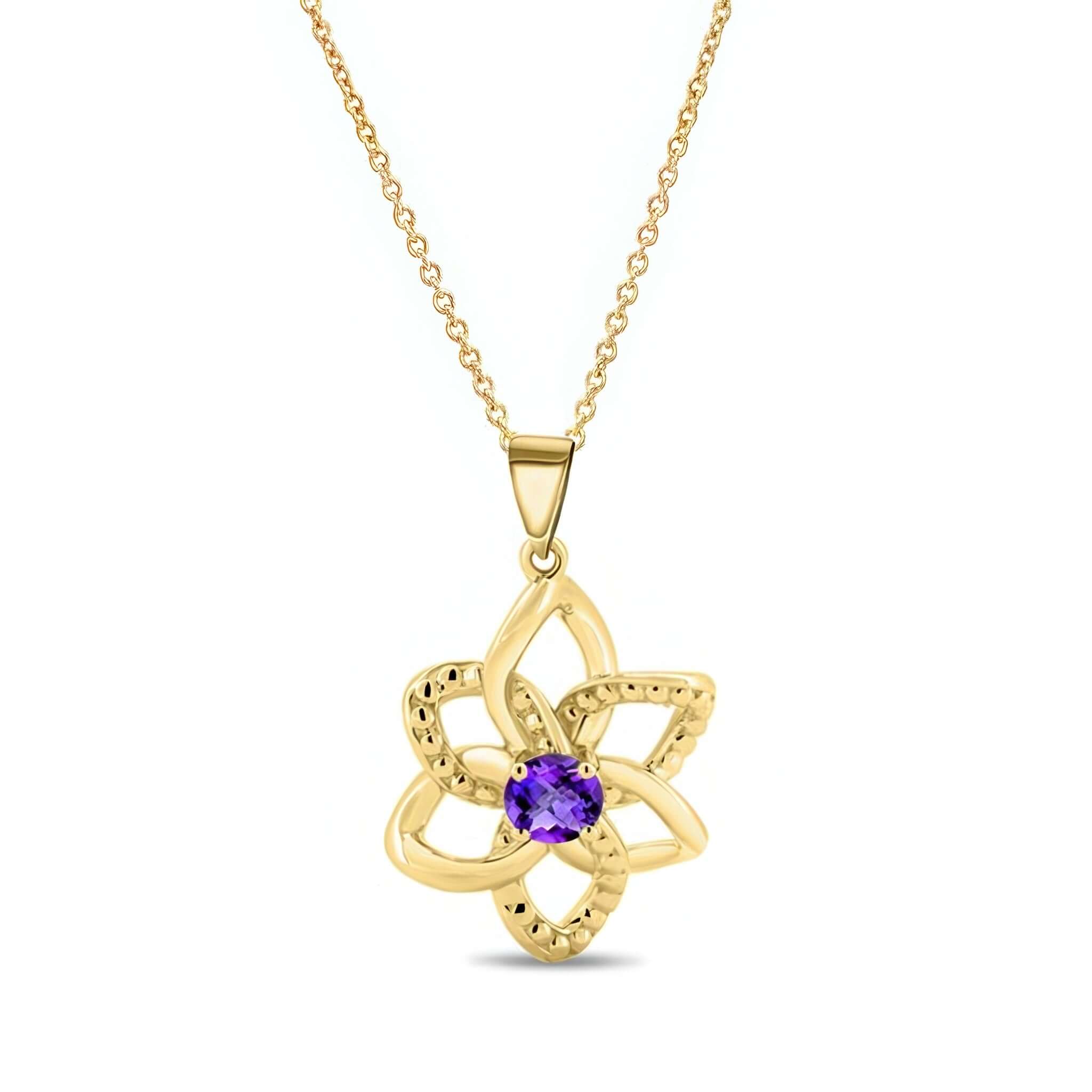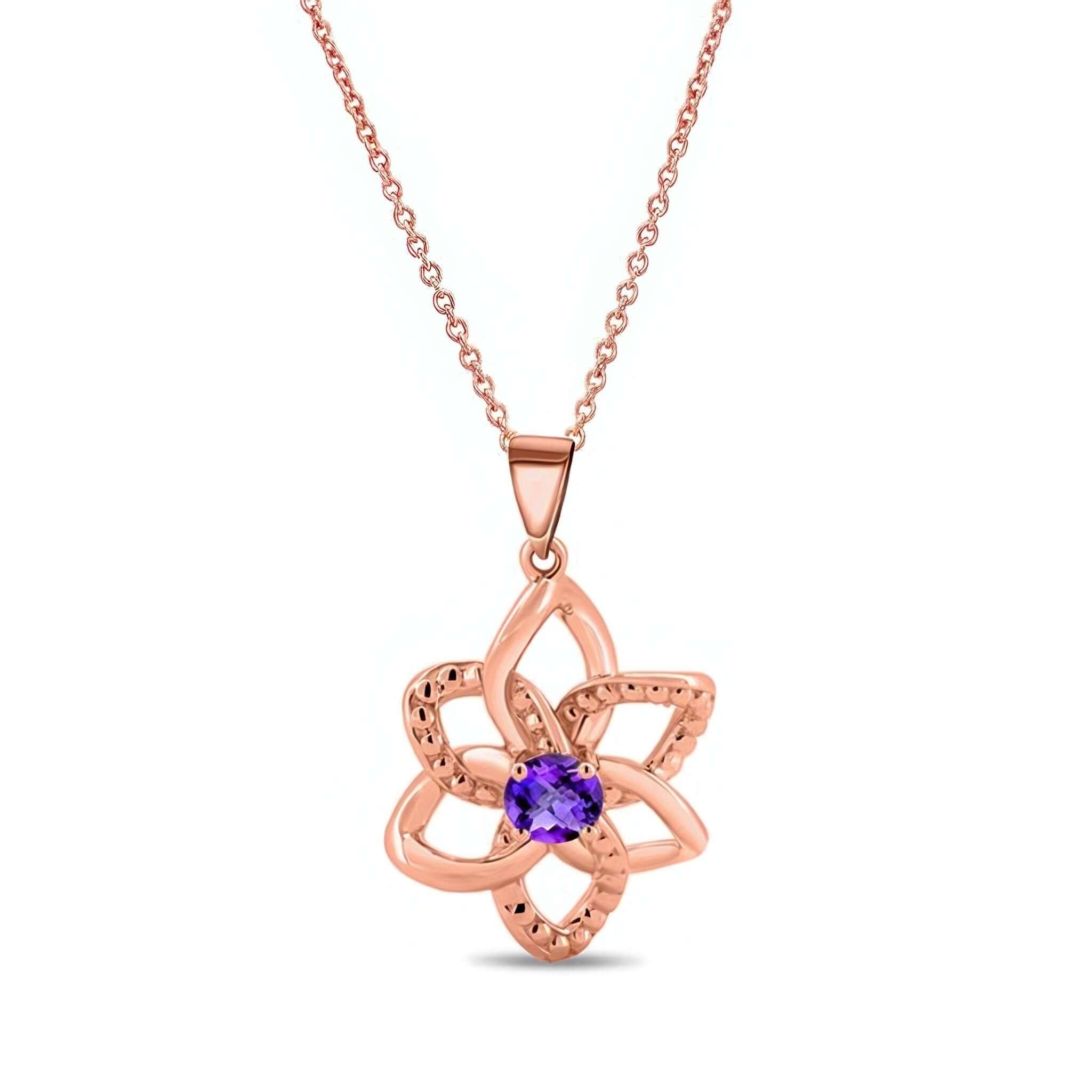 A beautiful amethyst flower necklace featuring intertwined leaf shapes and a half carat amethyst center.