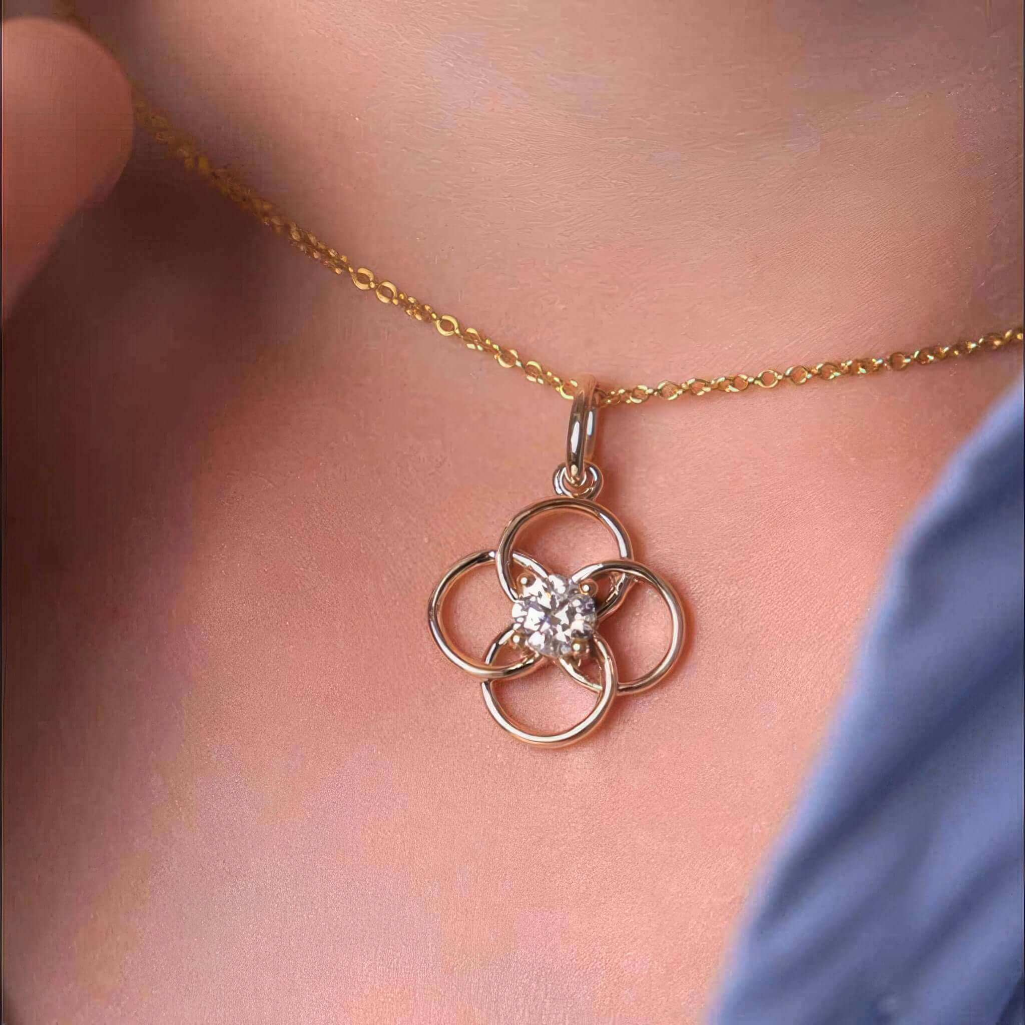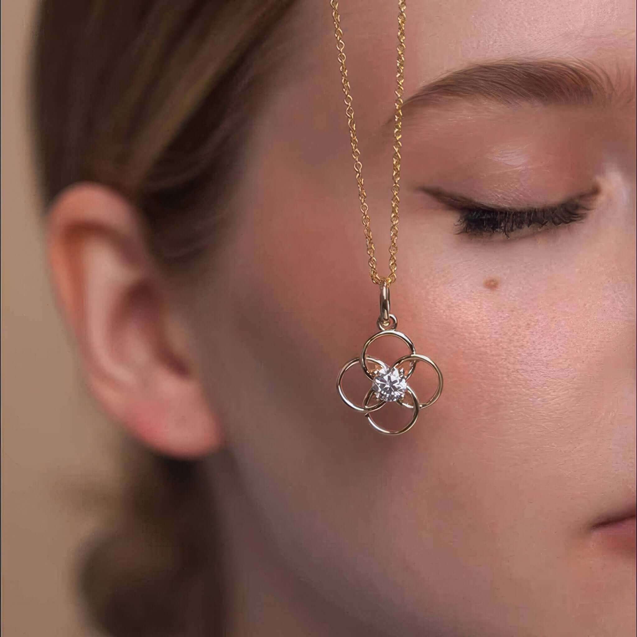 This brilliant moissanite dangle necklace features a floral inspired design, boasting a sparkling 0.75 carat moissanite. The intricate open petal motif adds a graceful touch of charm to this pendant.